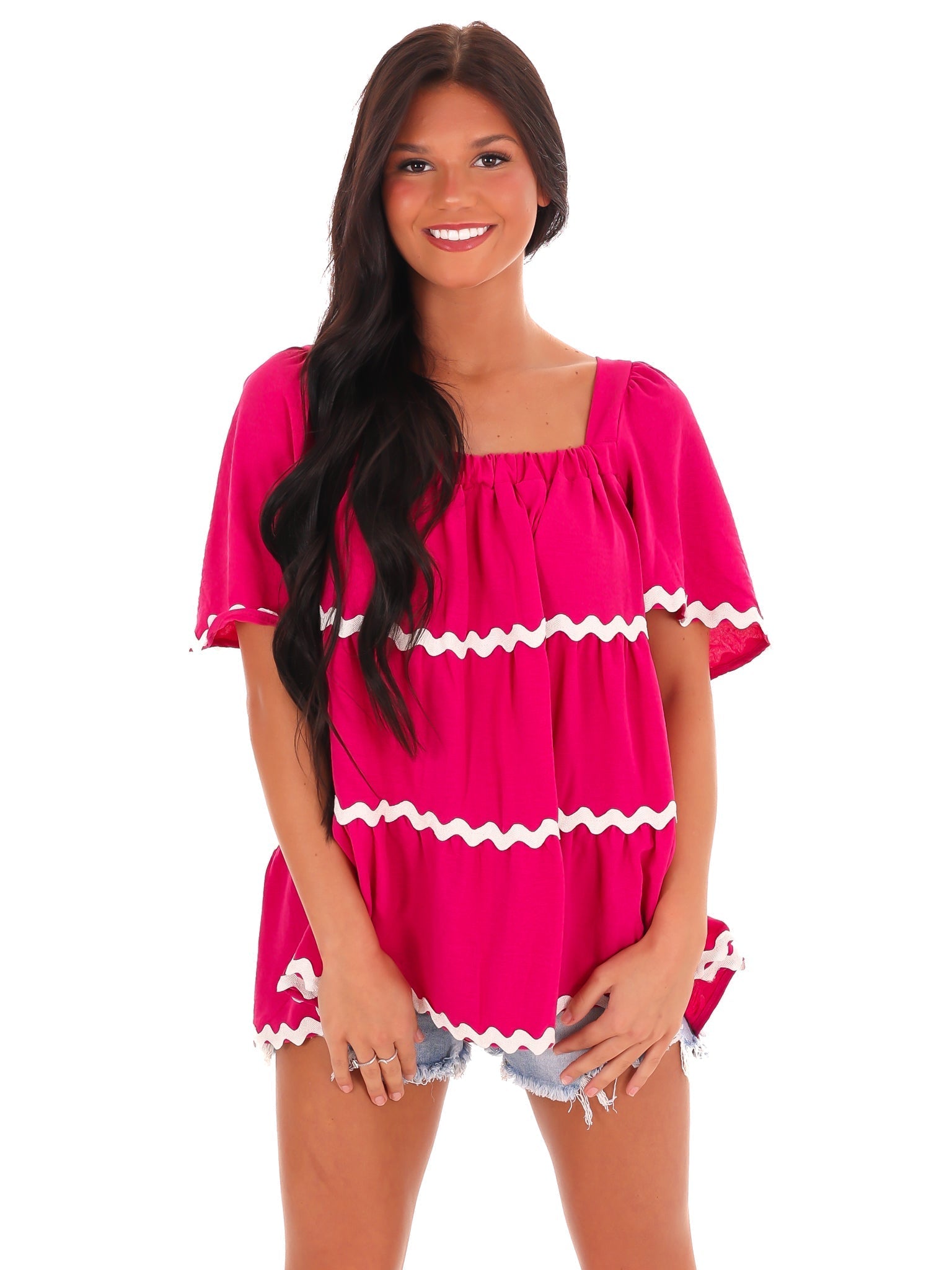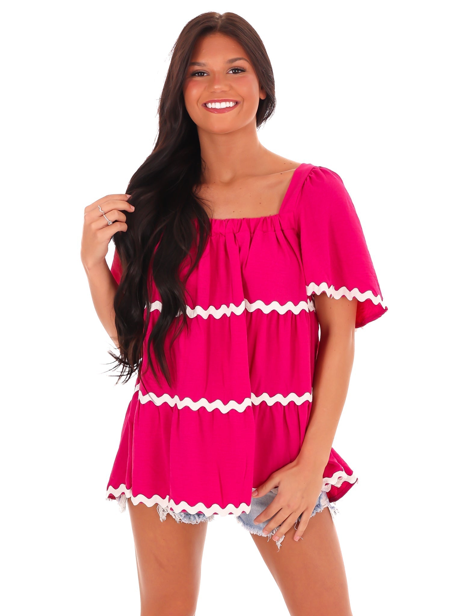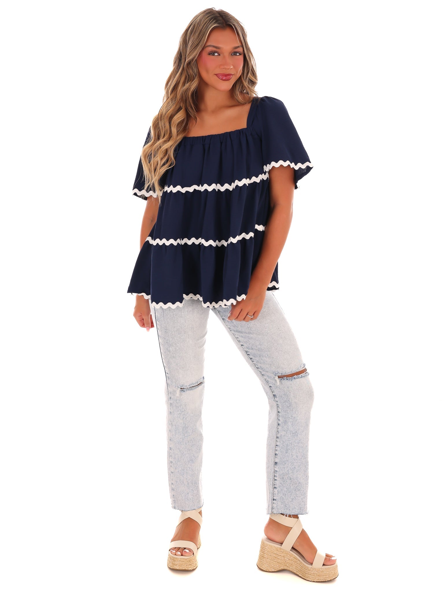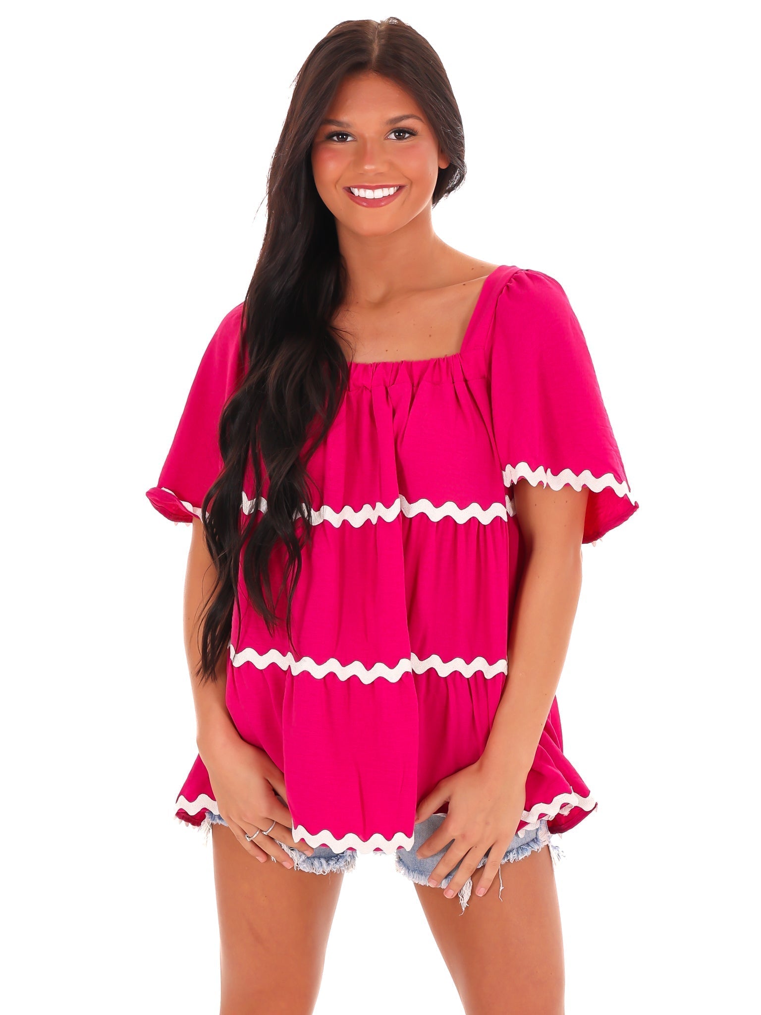 Get ready to flounce and flutter in our All I Want to Do Tiered Top! This woven top features playful flounce sleeves and ric rac trim, adding a touch of whimsy to your outfit. Perfect for any occasion, this top will make you stand out and have all eyes on you!