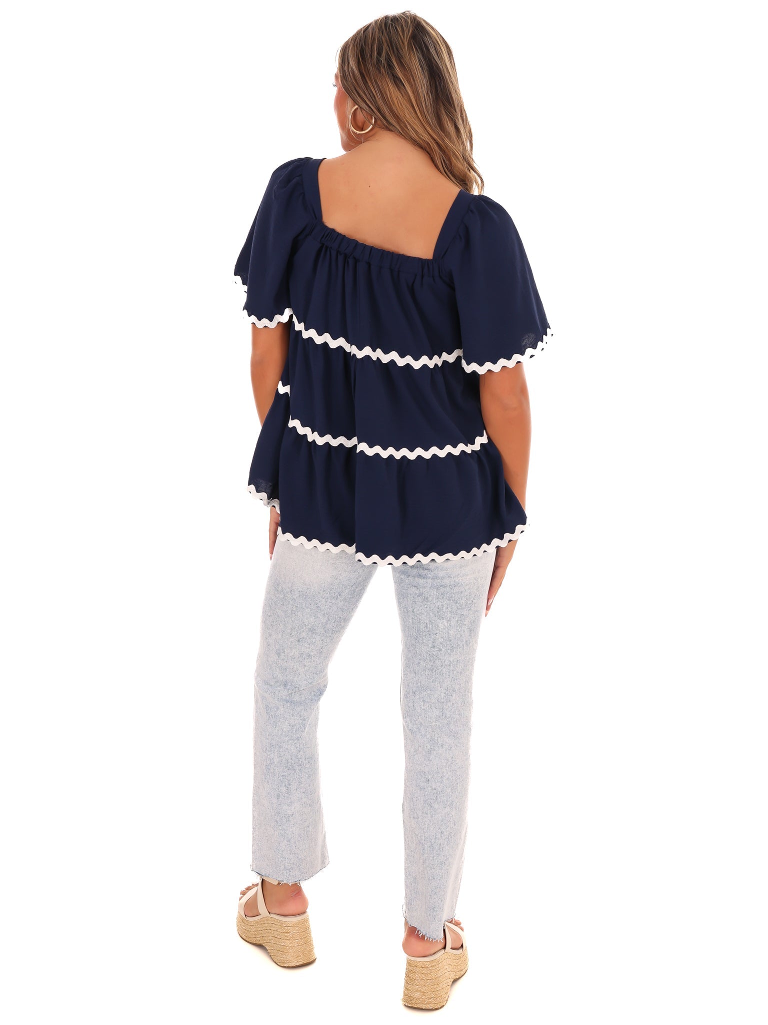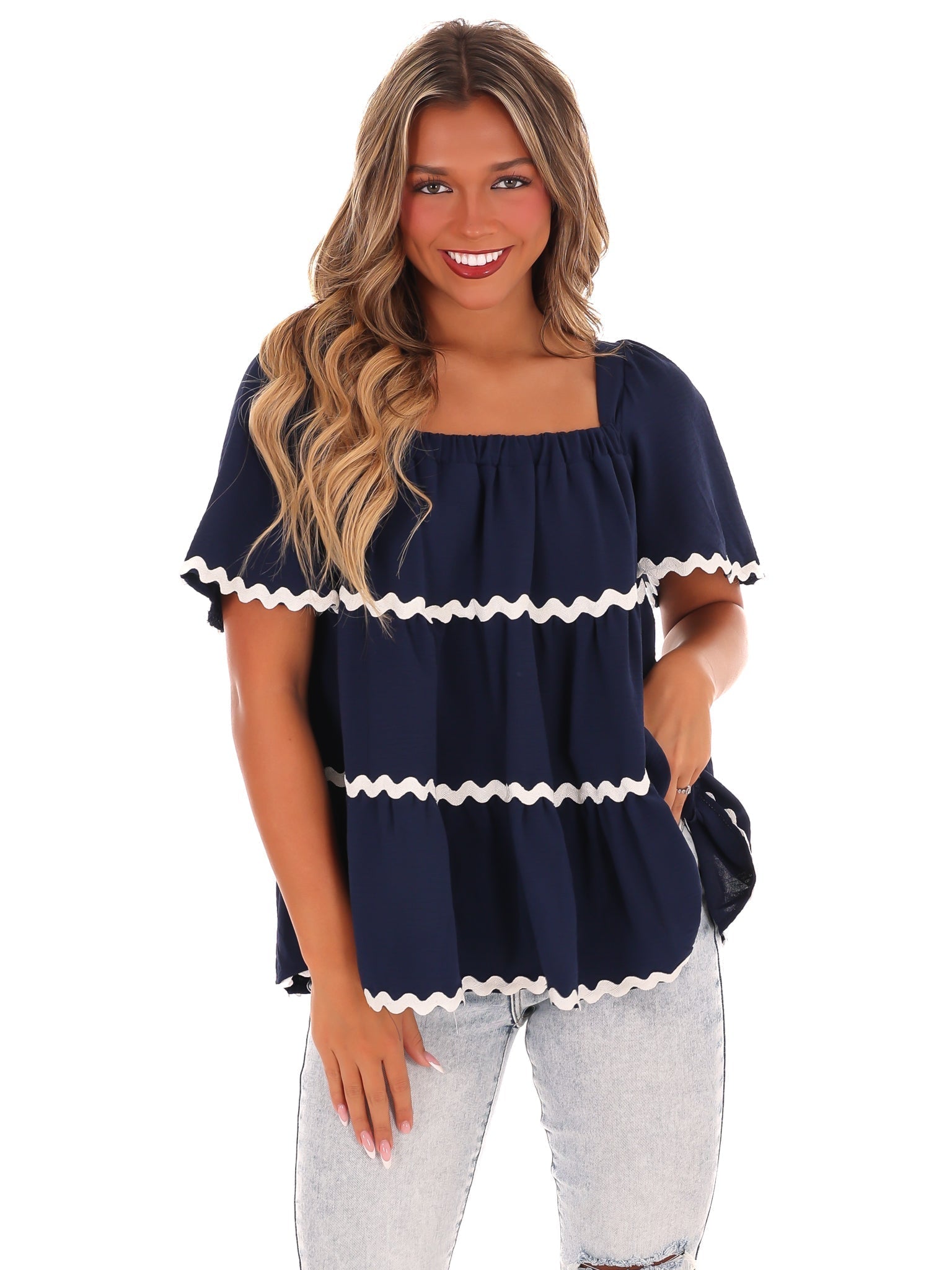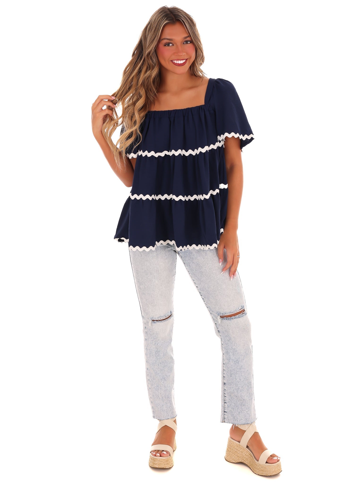 Get ready to flounce and flutter in our All I Want to Do Tiered Top! This woven top features playful flounce sleeves and ric rac trim, adding a touch of whimsy to your outfit. Perfect for any occasion, this top will make you stand out and have all eyes on you!