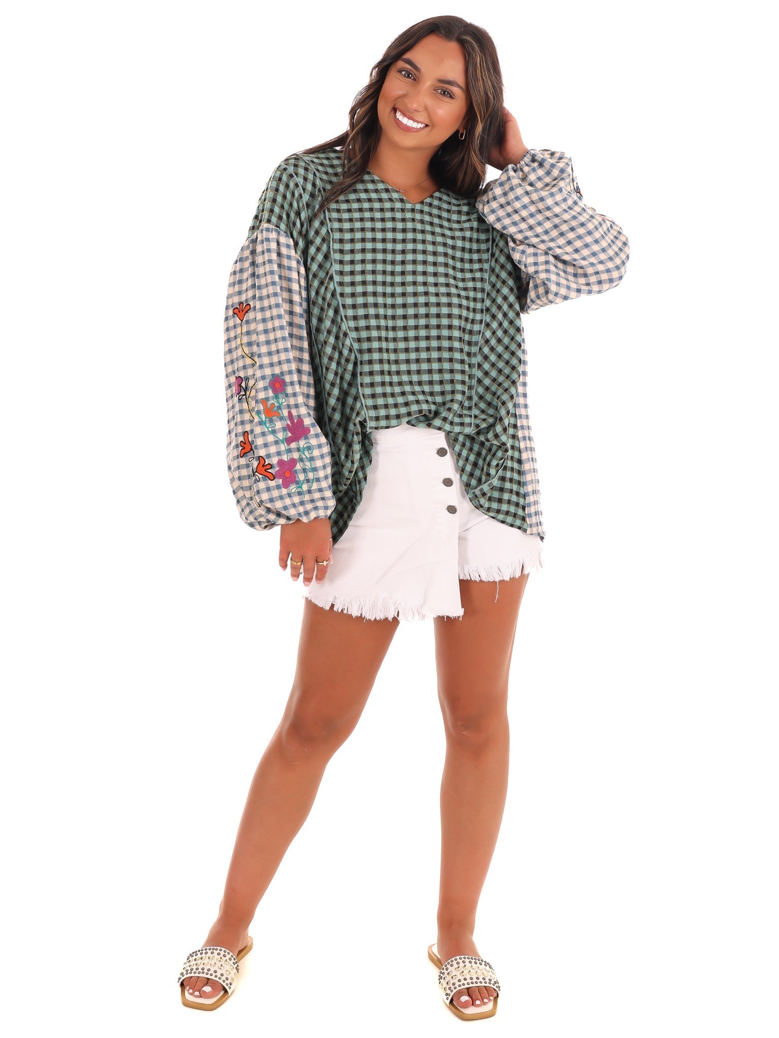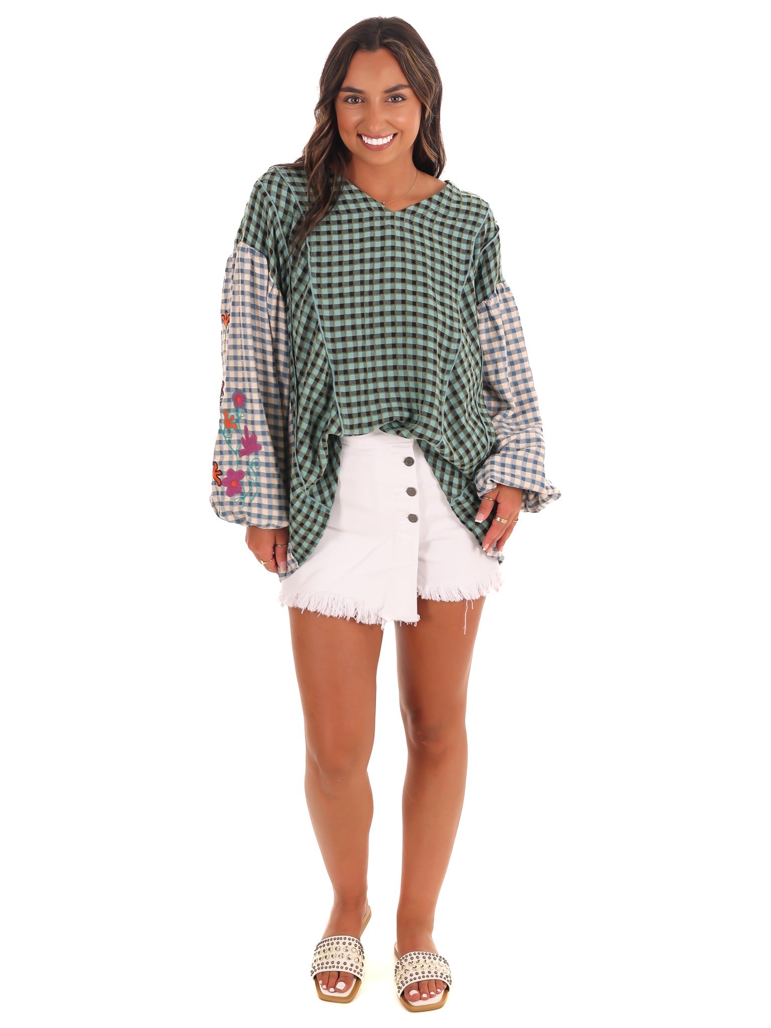 Get ready to shine in our Autumn Glow Plaid Top! This colorblock plaid top not only adds a pop of color to your fall wardrobe, but also features unique embroidered floral details on the sleeves. Keep cozy and stylish all season long!