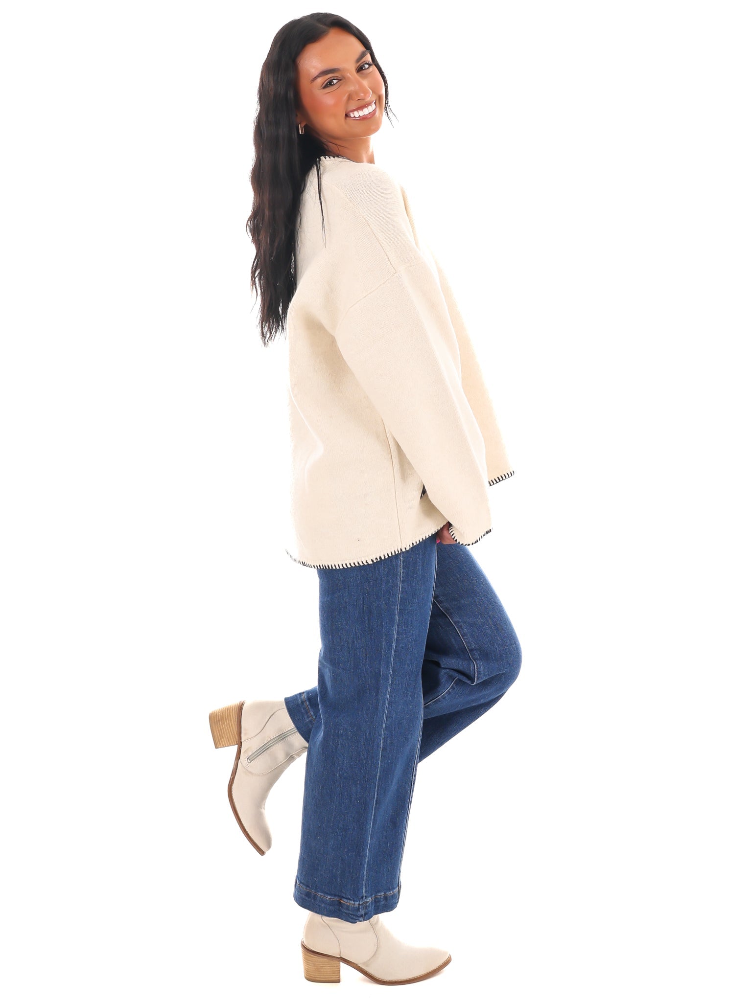 This cute sweater top is the perfect balance of cozy and stylish. With its long sleeves and v-neck design, it's perfect for chilly days. The contrast top stitching adds a touch of uniqueness, while the convenient front pockets make it practical. Be good to yourself and add this top to your wardrobe!