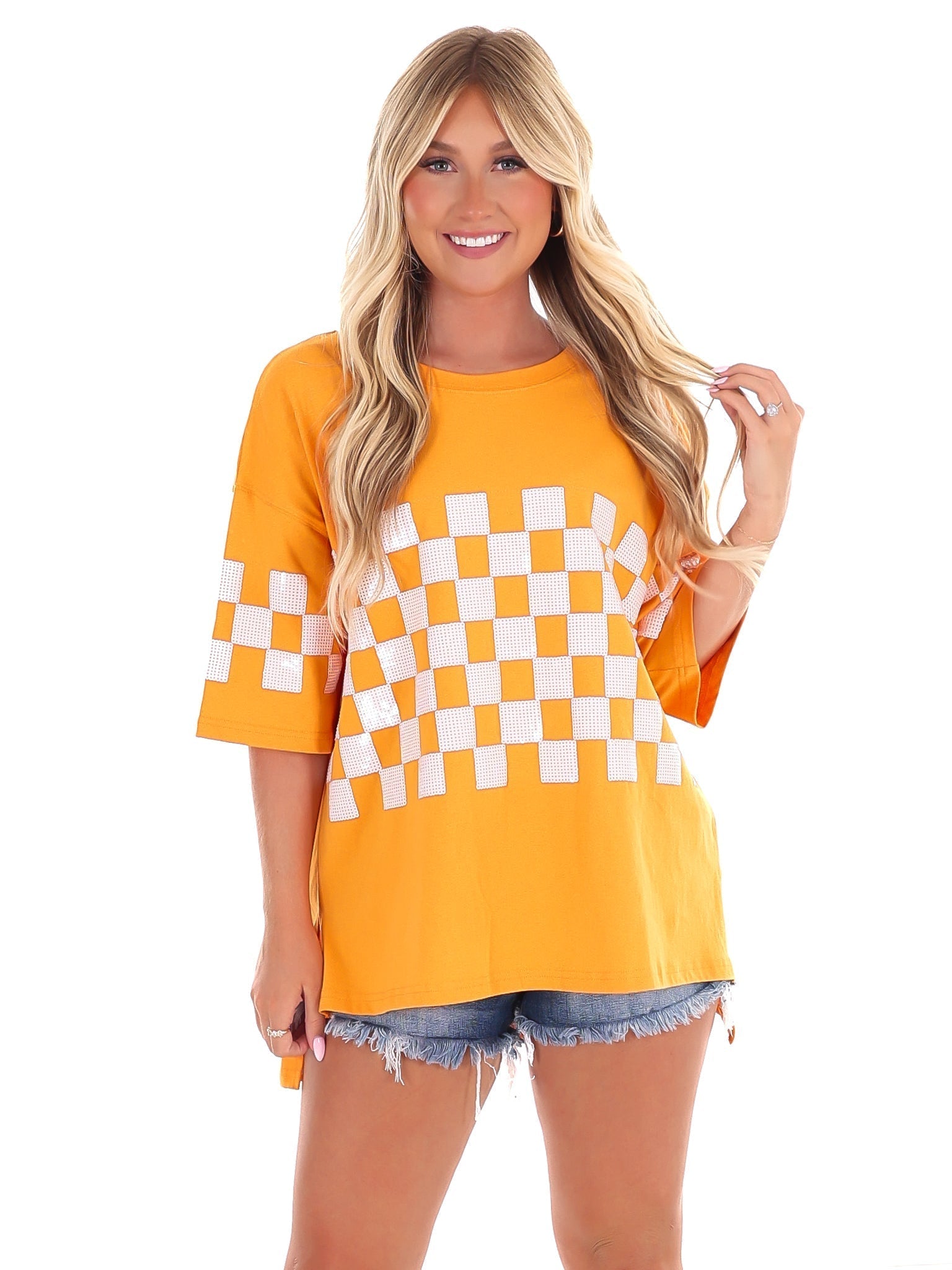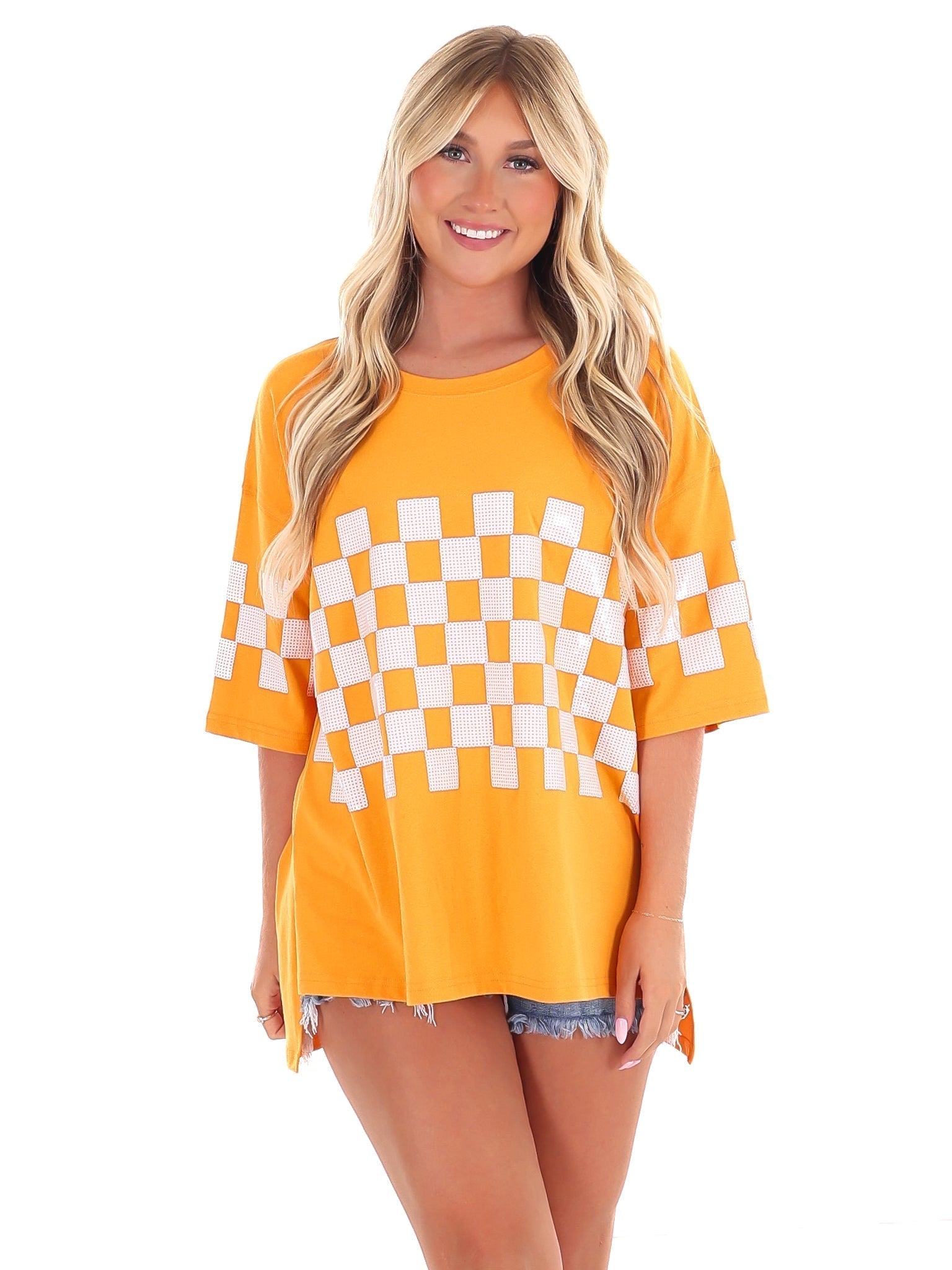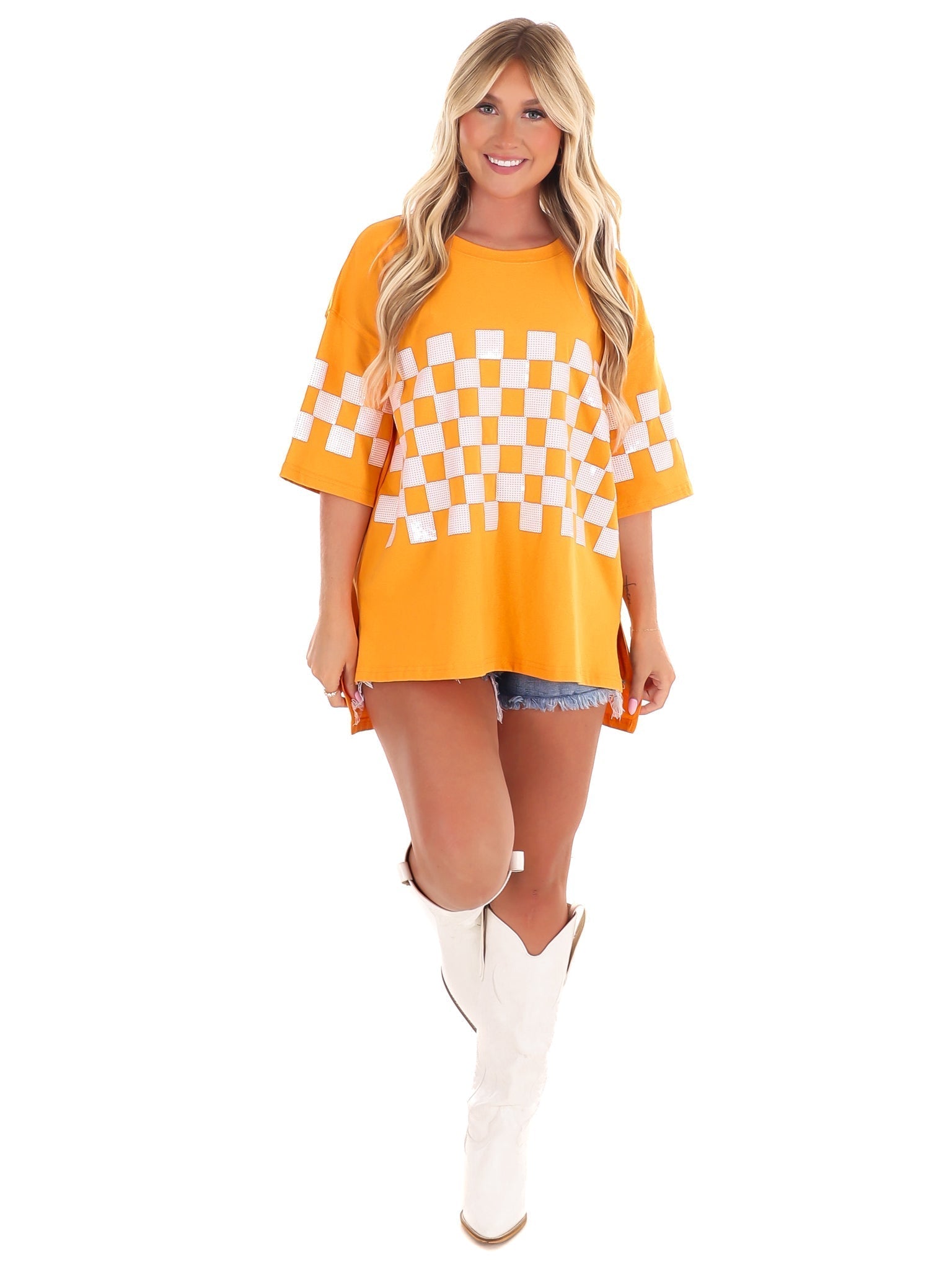 Elevate your game day look with our Check Me Out Sequin Top. Featuring a playful asymmetric high-low cut, short sleeves, and a round neck, this top is embellished with sequin checkers for a touch of sparkle.
