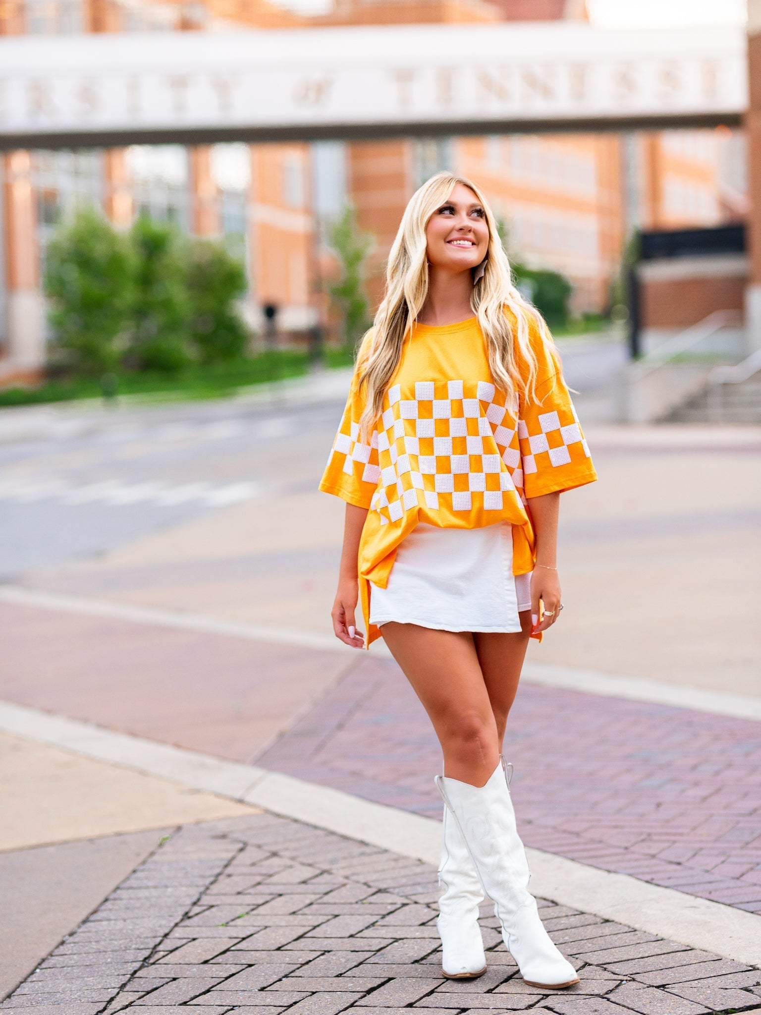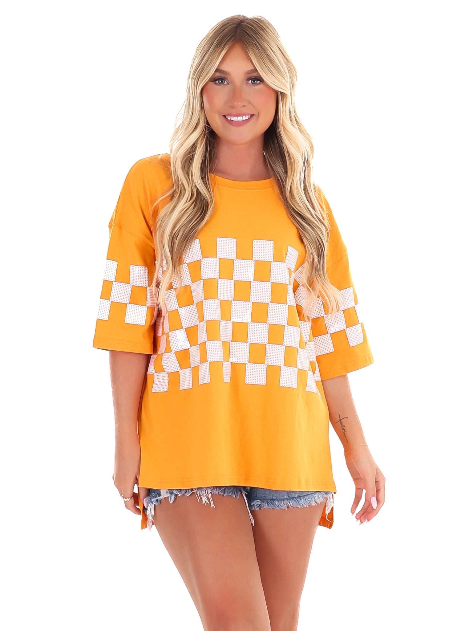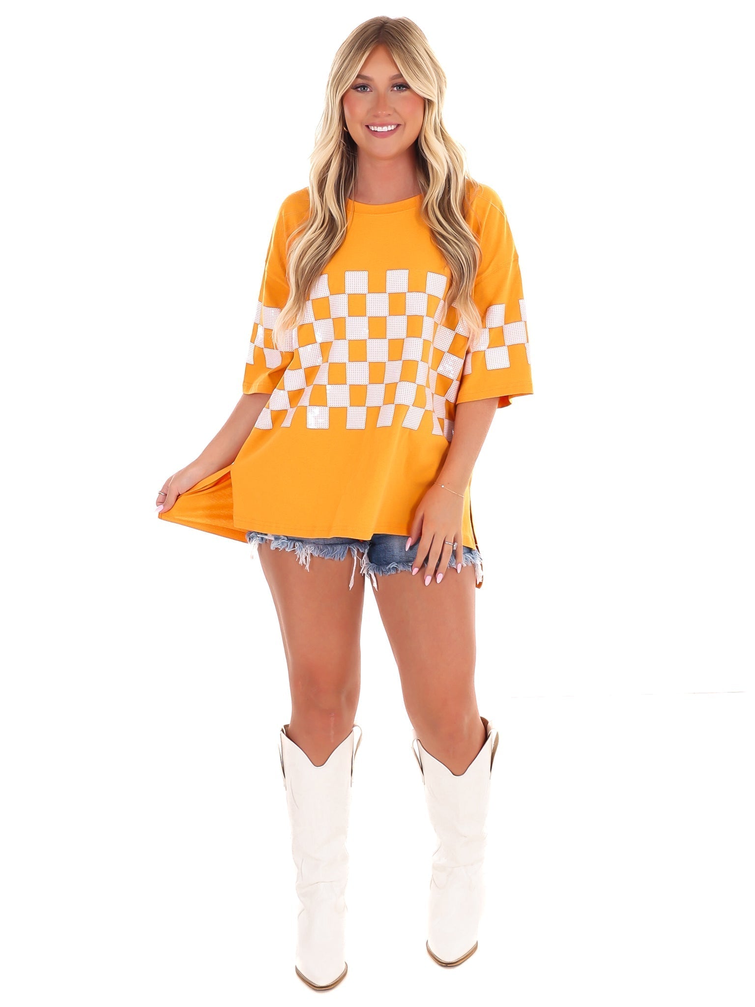 Elevate your game day look with our Check Me Out Sequin Top. Featuring a playful asymmetric high-low cut, short sleeves, and a round neck, this top is embellished with sequin checkers for a touch of sparkle.