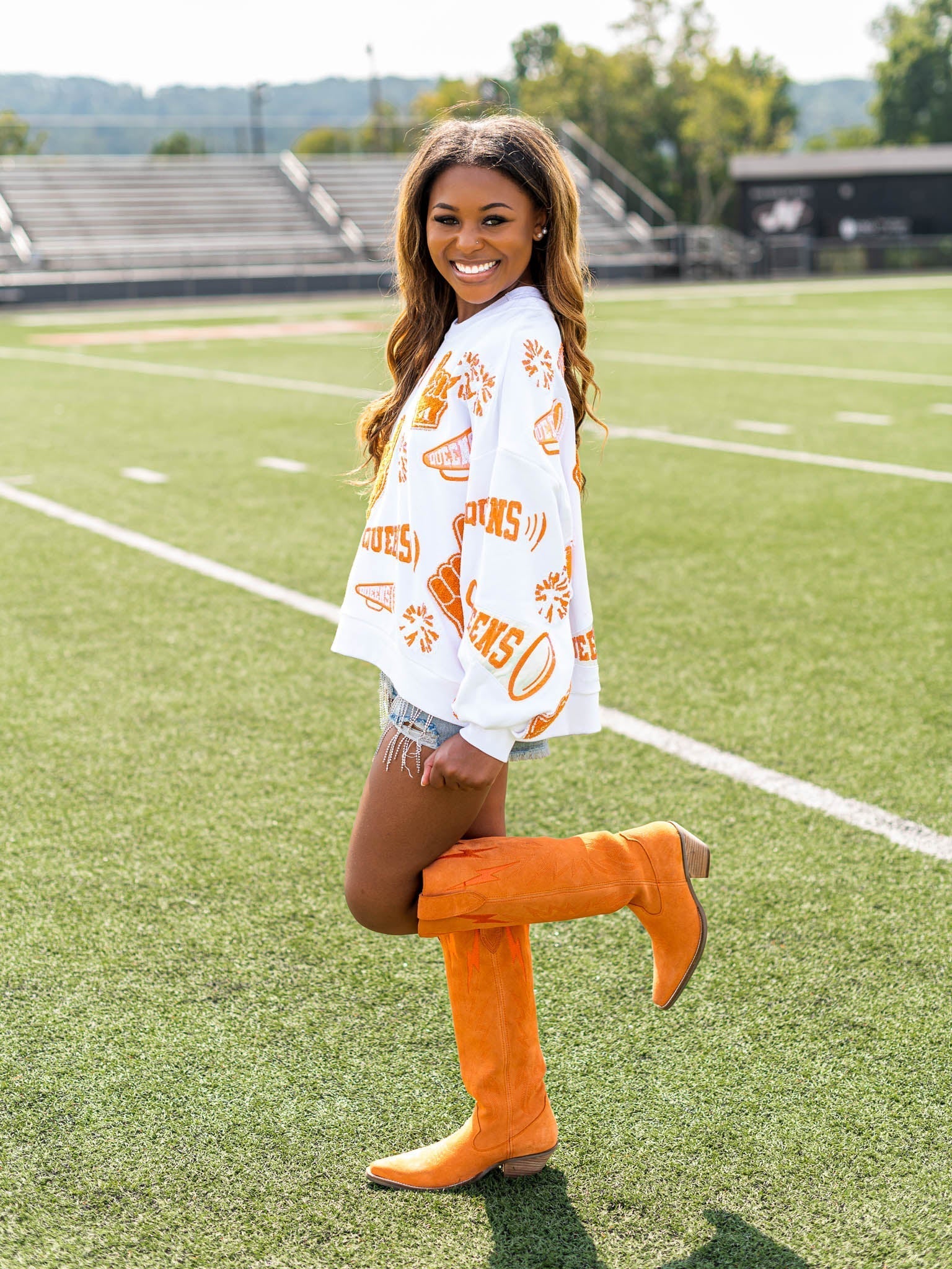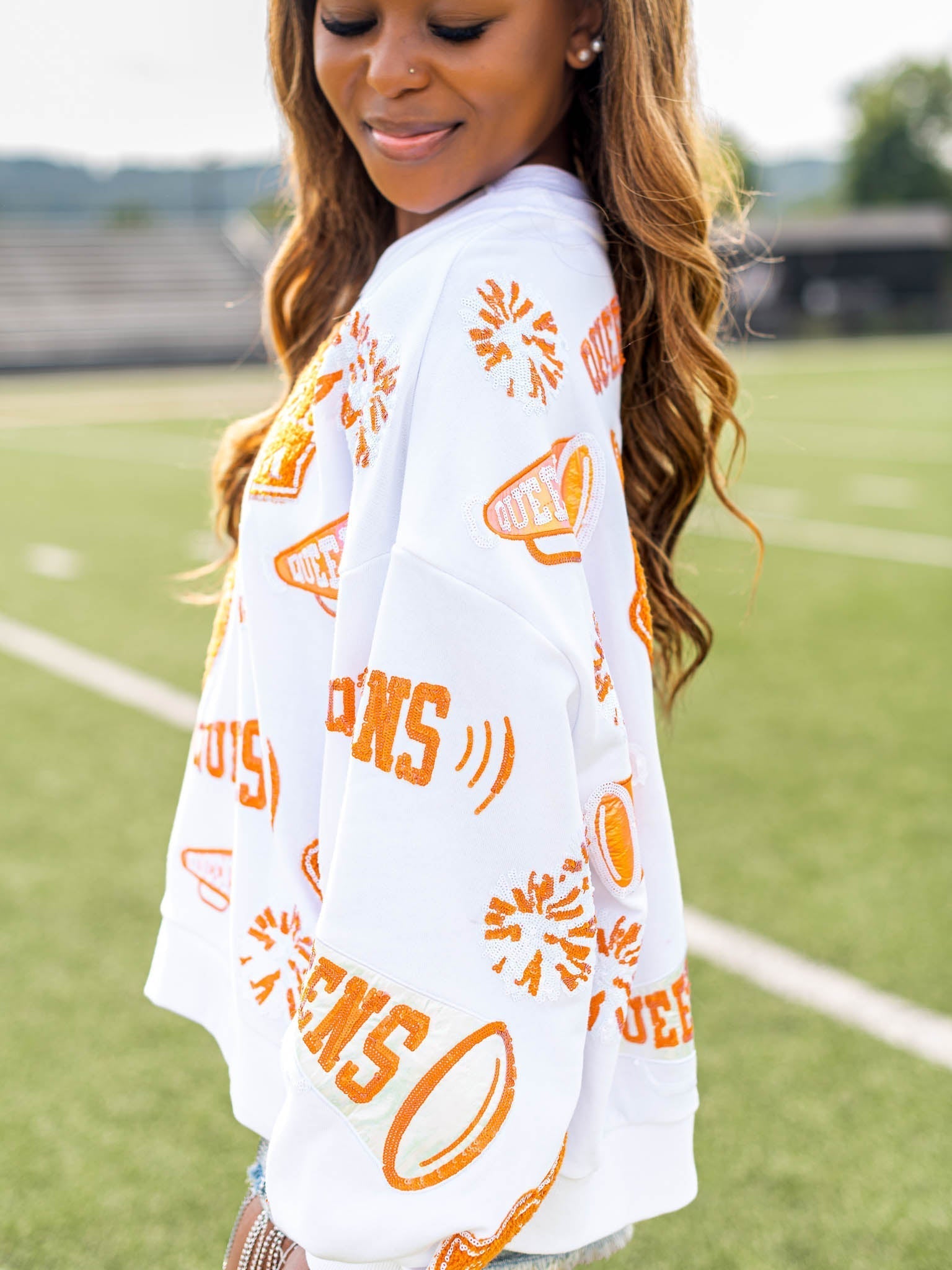Rally around your Tennessee Volunteers in this Cheers Queen Icon Sweatshirt! It's the perfect way to show your team spirit in style, with glitter patches that sparkle in orange and white. Go Big Orange! 🧡
