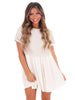 Get closer to your fashion goals with the Closer to You Contrast Dress! This unique piece features a cozy French Terry knit top, paired with a playful pleated mini dress. The round neck and short sleeves with banded cuffs add a touch of simplicity, while the contrast detail adds a pop of fun. Perfect for any occasion!