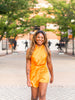Slay the style game with this sassy Field Goal Frenzy Satin Romper! This stunning one-piece features a silky, cross-over halter top and a zipper at the back, making it perfect for any Tennessee Gameday! Score the winning fashion touchdown and be the envy of the crowd!