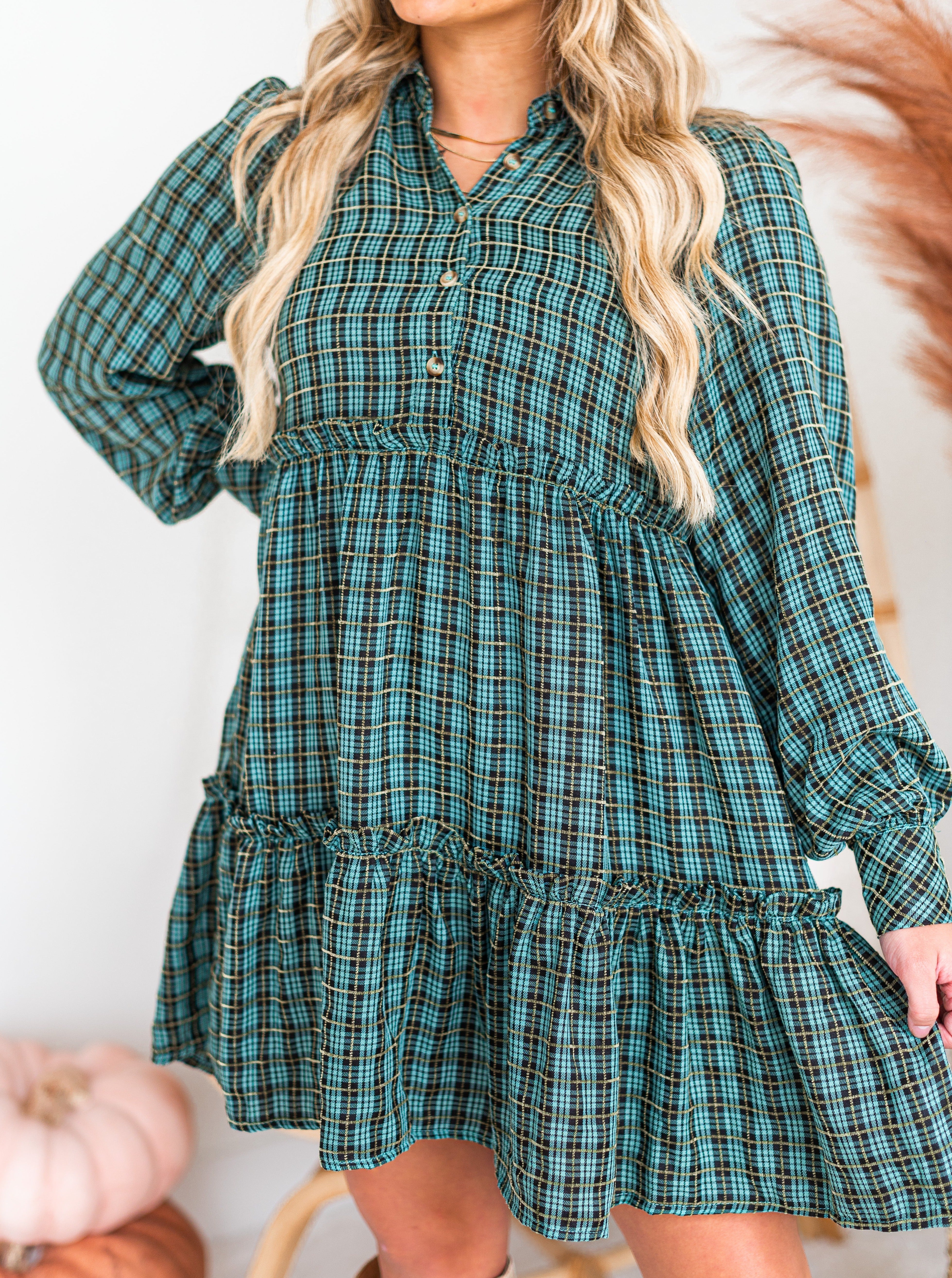 Say "thanks" to fashionable style with this long sleeve plaid dress! Features tiers of ruffles and side pockets for a fun and functional look. Perfect for transitioning into Fall! Give thanks to timeless style with this one-of-a-kind dress.