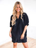 Get ready to go the distance in style with our V-neck 1/2 sleeve mini dress! Featuring a unique placket and sleeve detail, as well as a playful tulip hem, this dress is both fashionable and functional. Stay comfortable and confident with its lightweight, non-sheer lining. Perfect for any occasion, this woven dress will have you looking and feeling your best.
