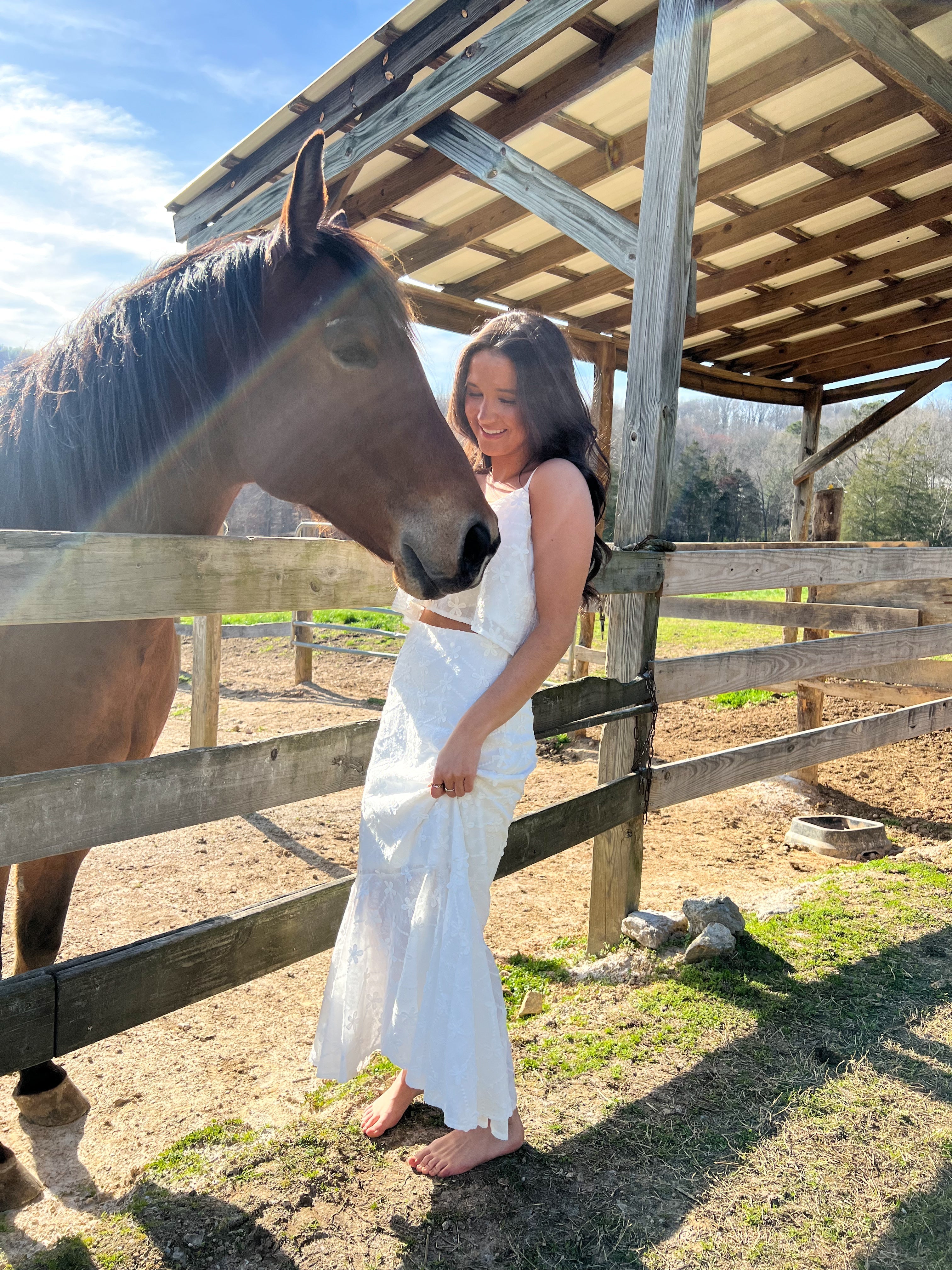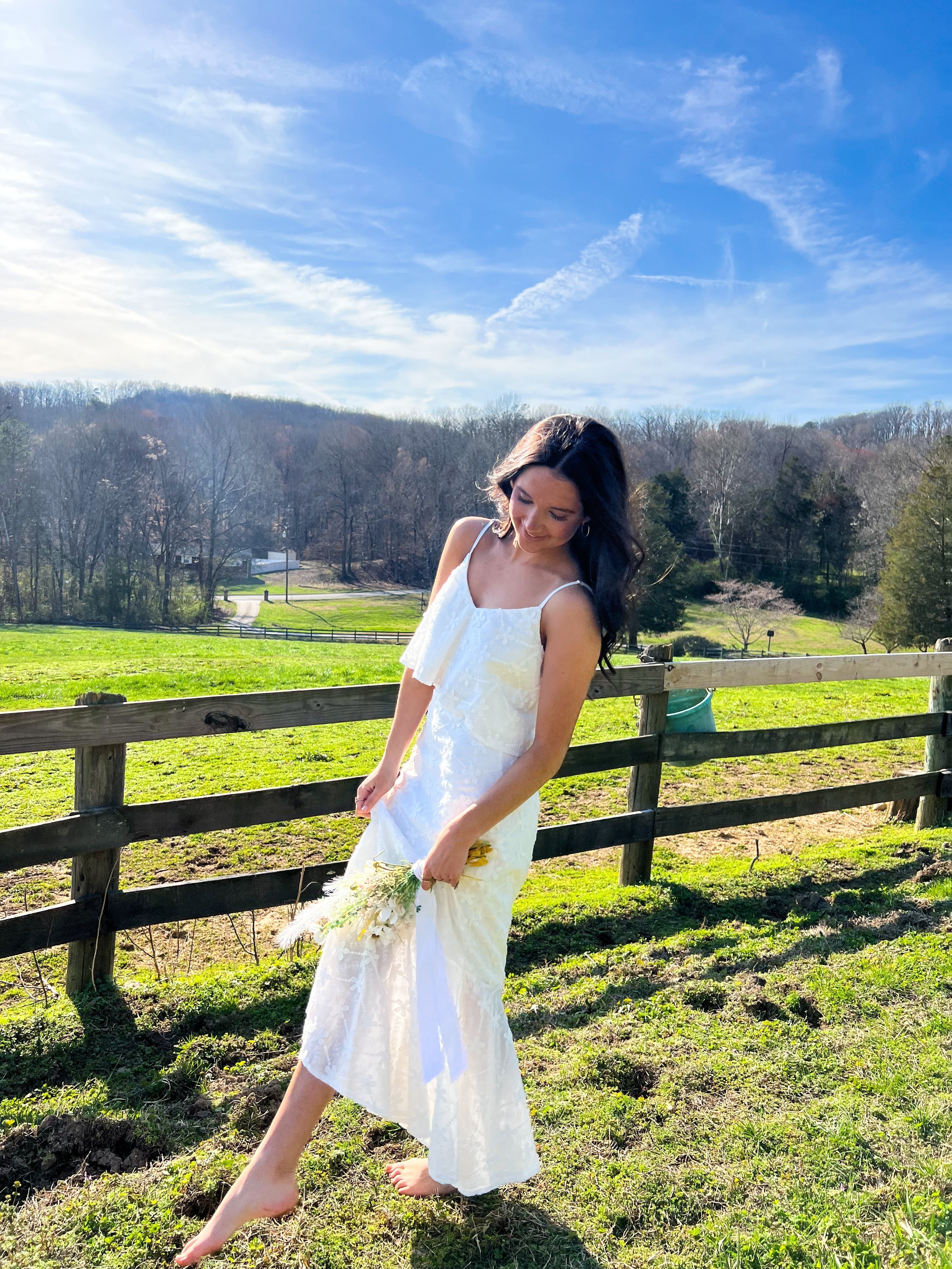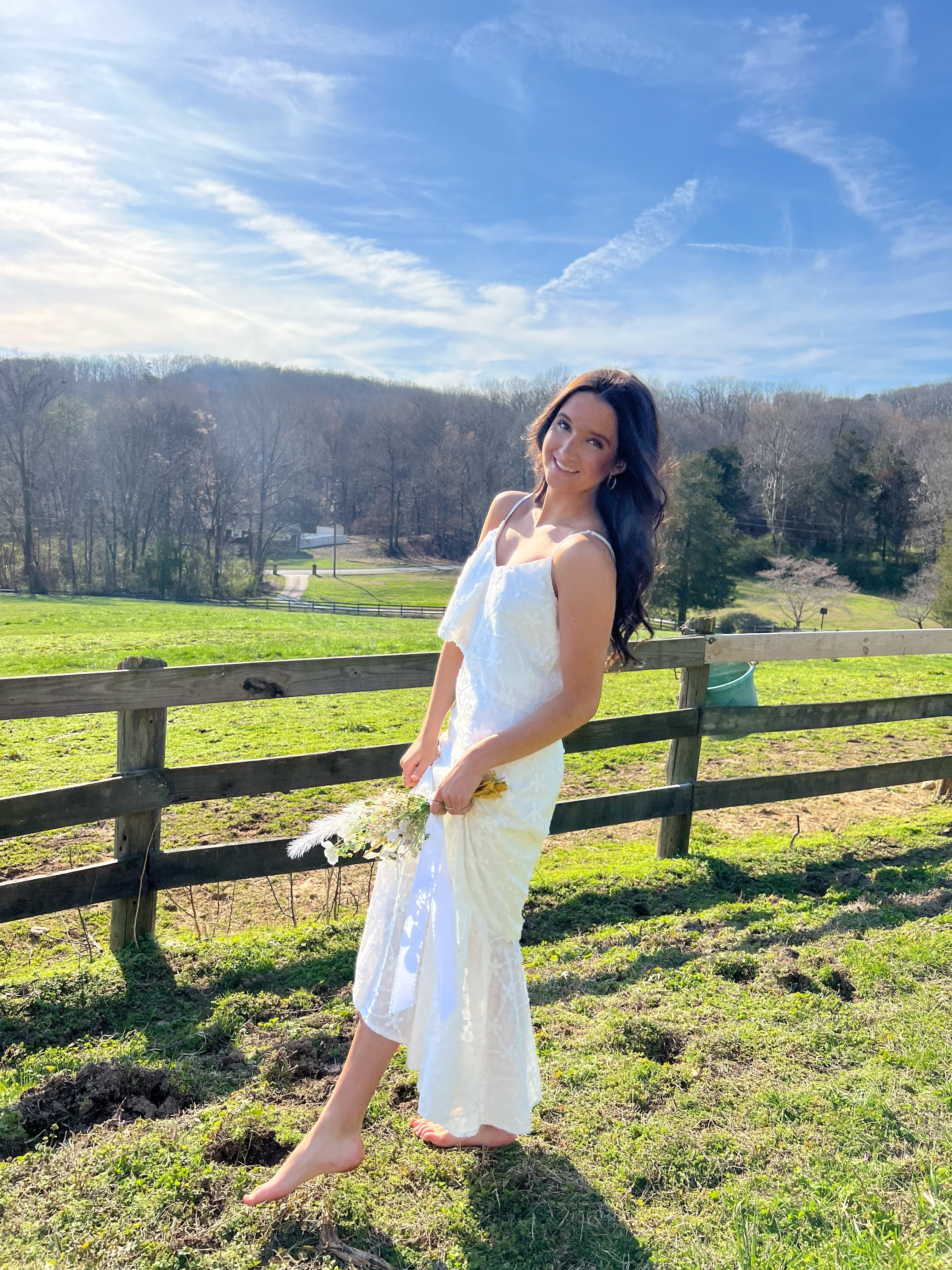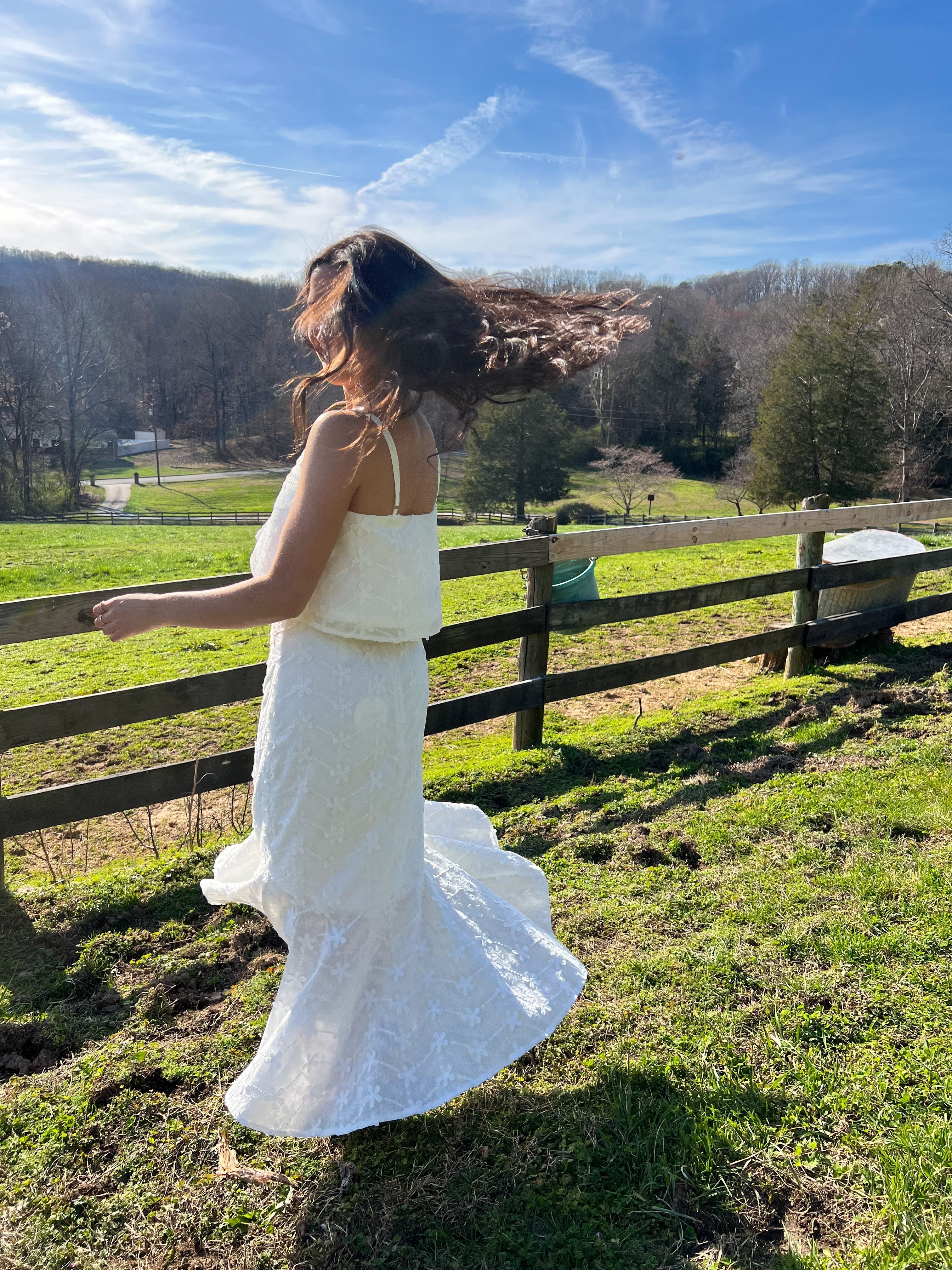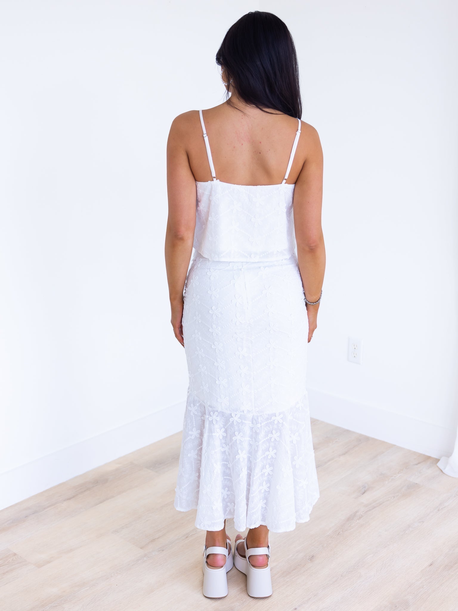 Make a statement with our Grow Your Way Floral Two Piece Set - a monochromatic delight featuring a large embroidered daisy midi skirt with a high waist and ruffled mermaid hem. Complete the look with the matching cropped top, adorned with a V neckline and flowy body. Adjustable spaghetti straps add the perfect touch of versatility. Stand out and bloom in style!