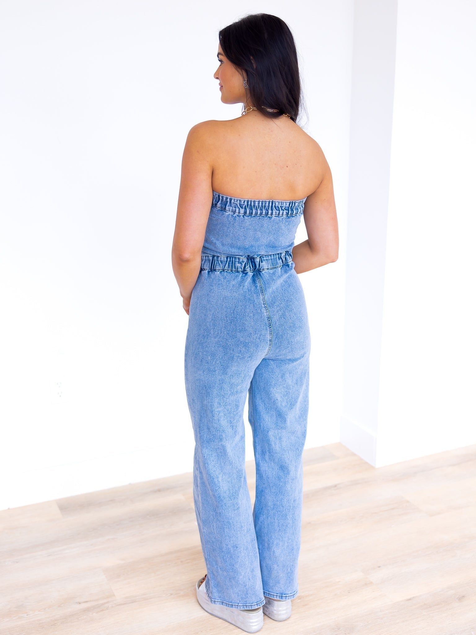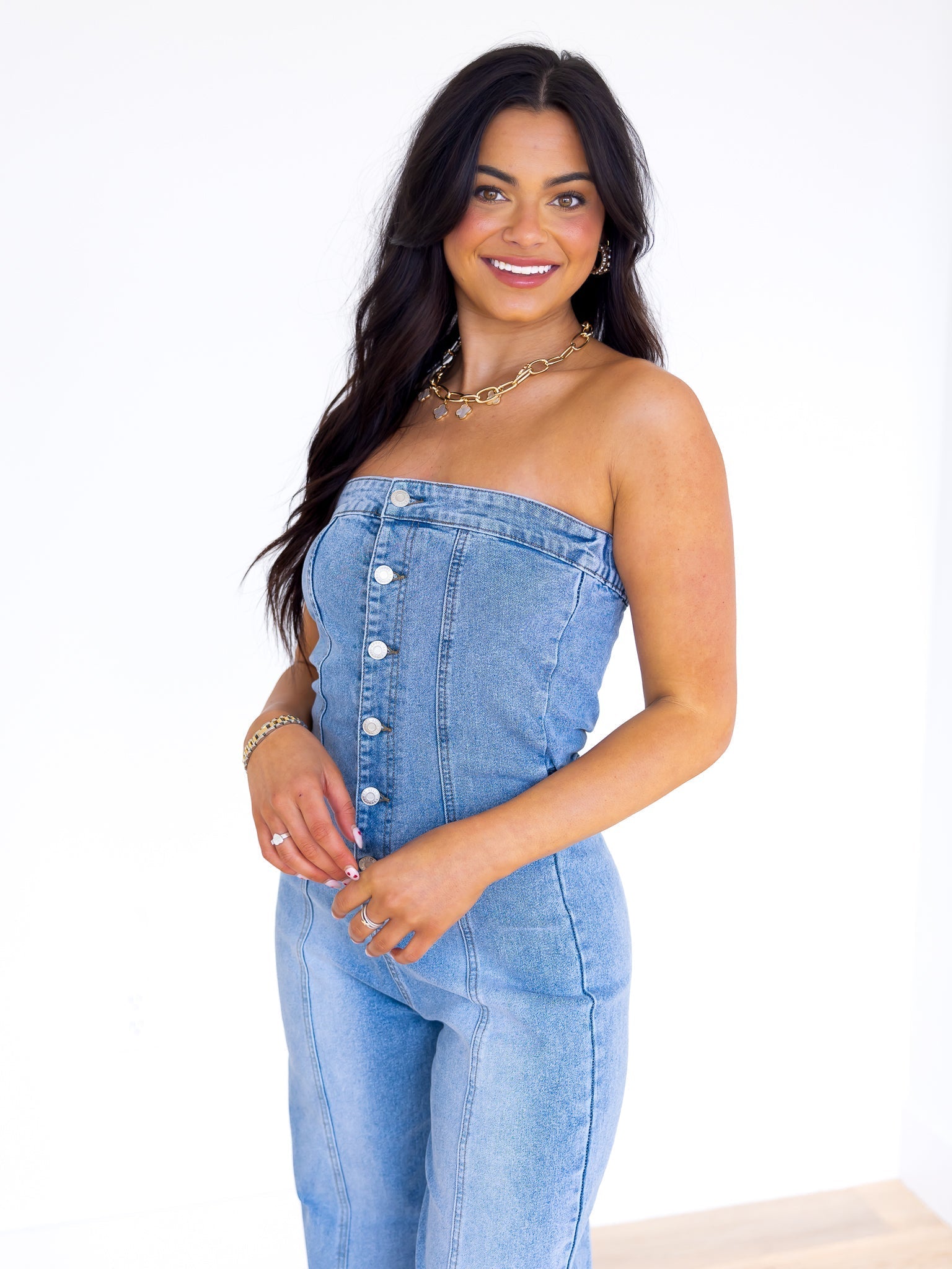 Fall head over heels for our In Love with You Denim Jumpsuit! This sleeveless jumpsuit features a denim tube top with front button closure and a flattering wide leg design. Perfect for a casual day out or a trendy night out on the town (with the right accessories). Don't miss out on this must-have piece!