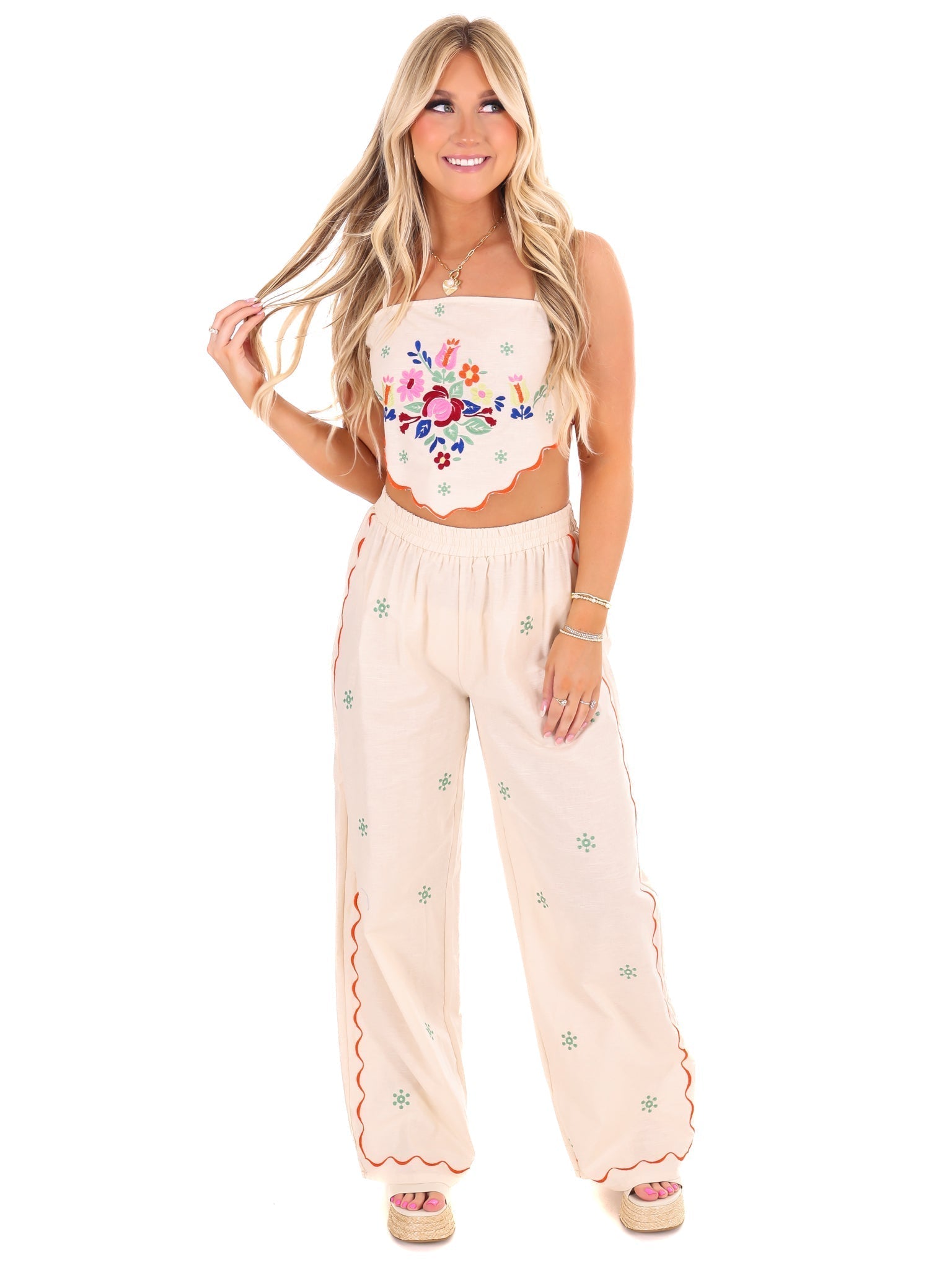 Let's just say this island ready two piece set is "knot" your average outfit. With an embroidered cropped top that ties in the back and embroidered pants with an elastic waistband, you'll be both stylish and comfortable all day long. Perfect for those hot summer days!