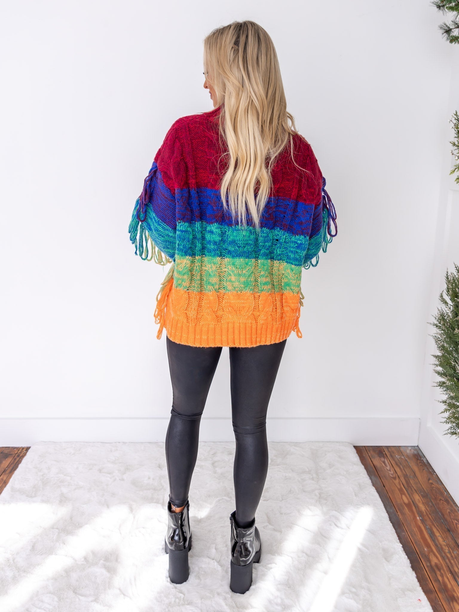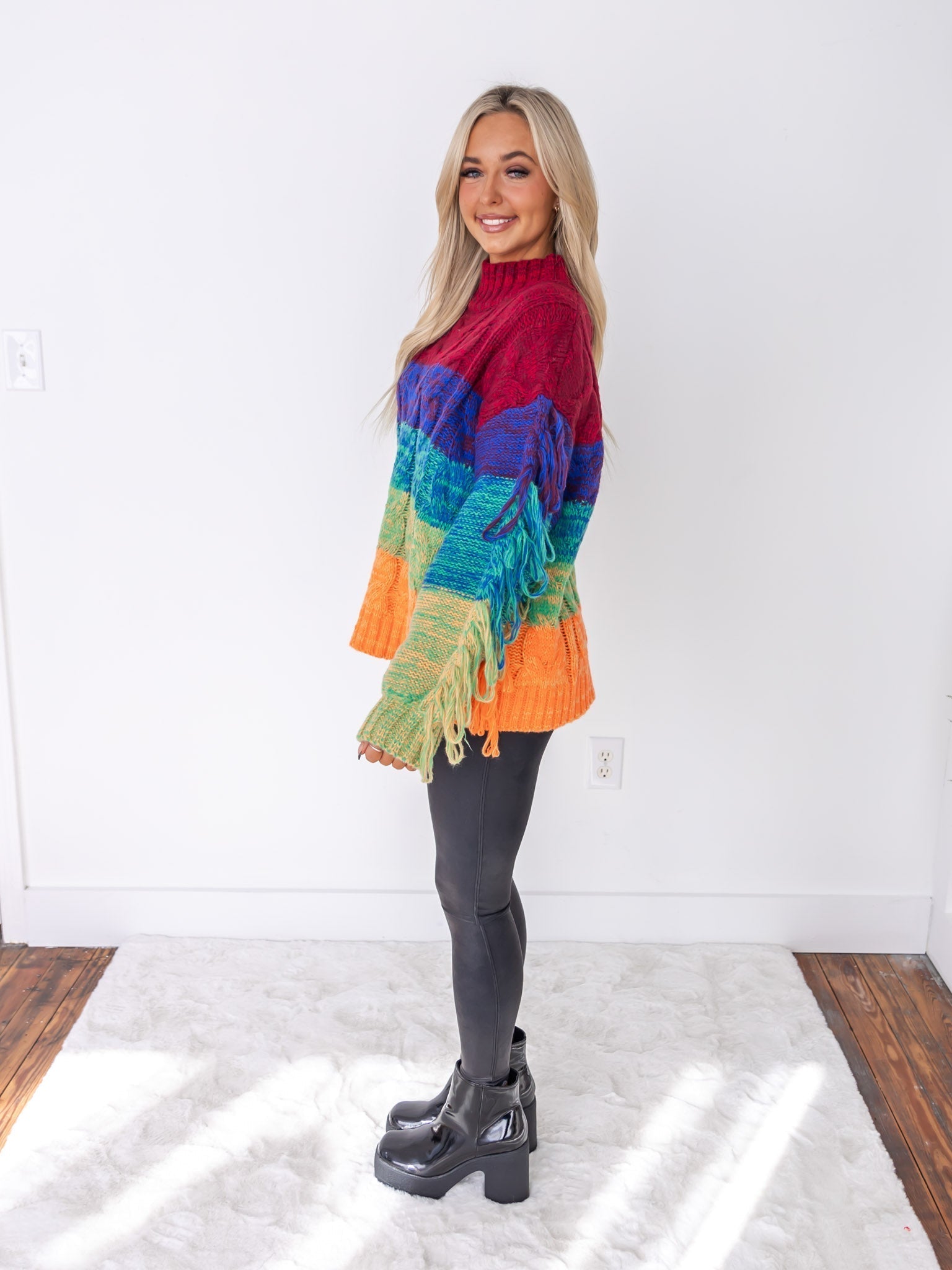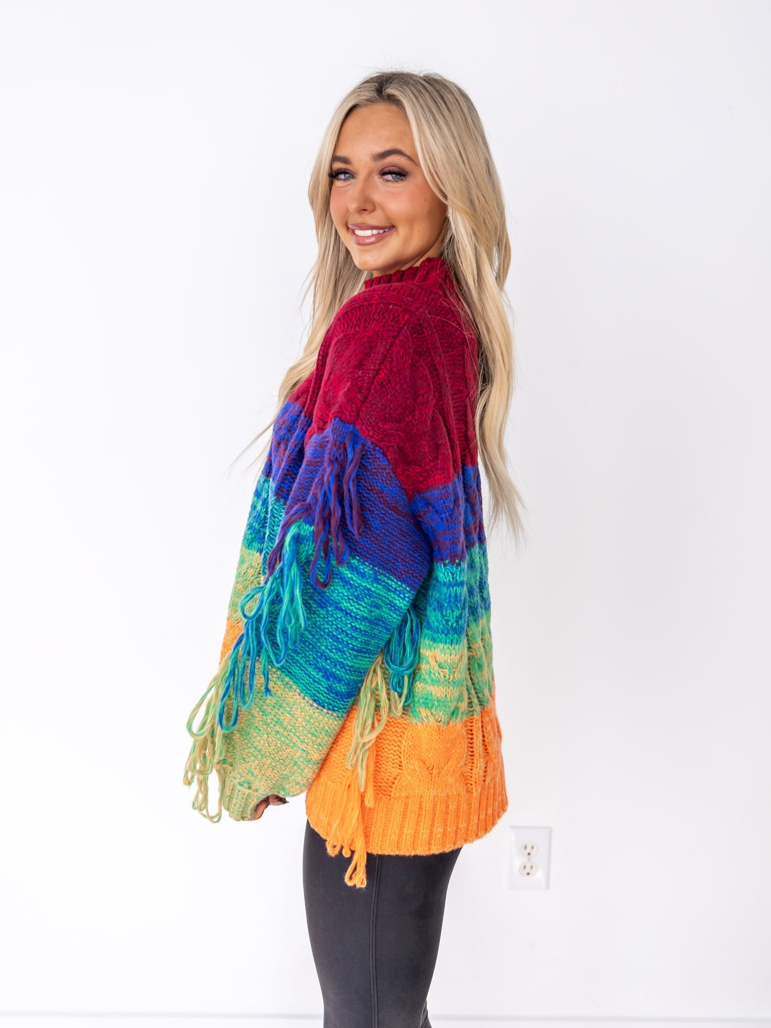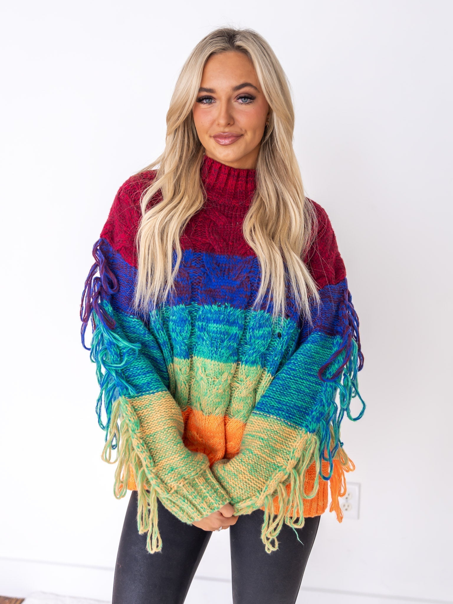 This cozy and chic chunky cable knit sweater will keep you feelin' fab and ready for your closeup. With a mock neck line and oversized fit, you'll be snug as a bug in a rug! And fringe on the sleeves? It just had to be you.