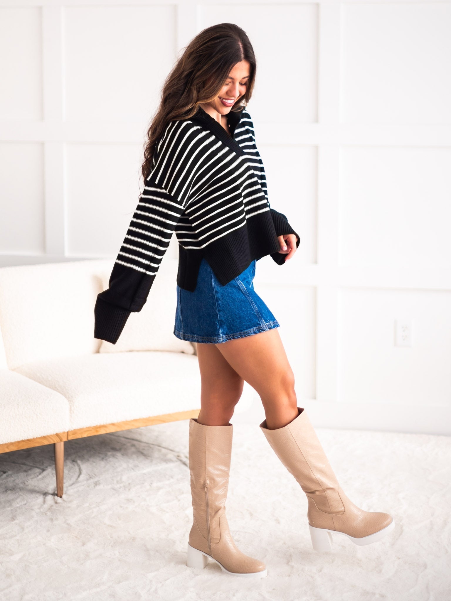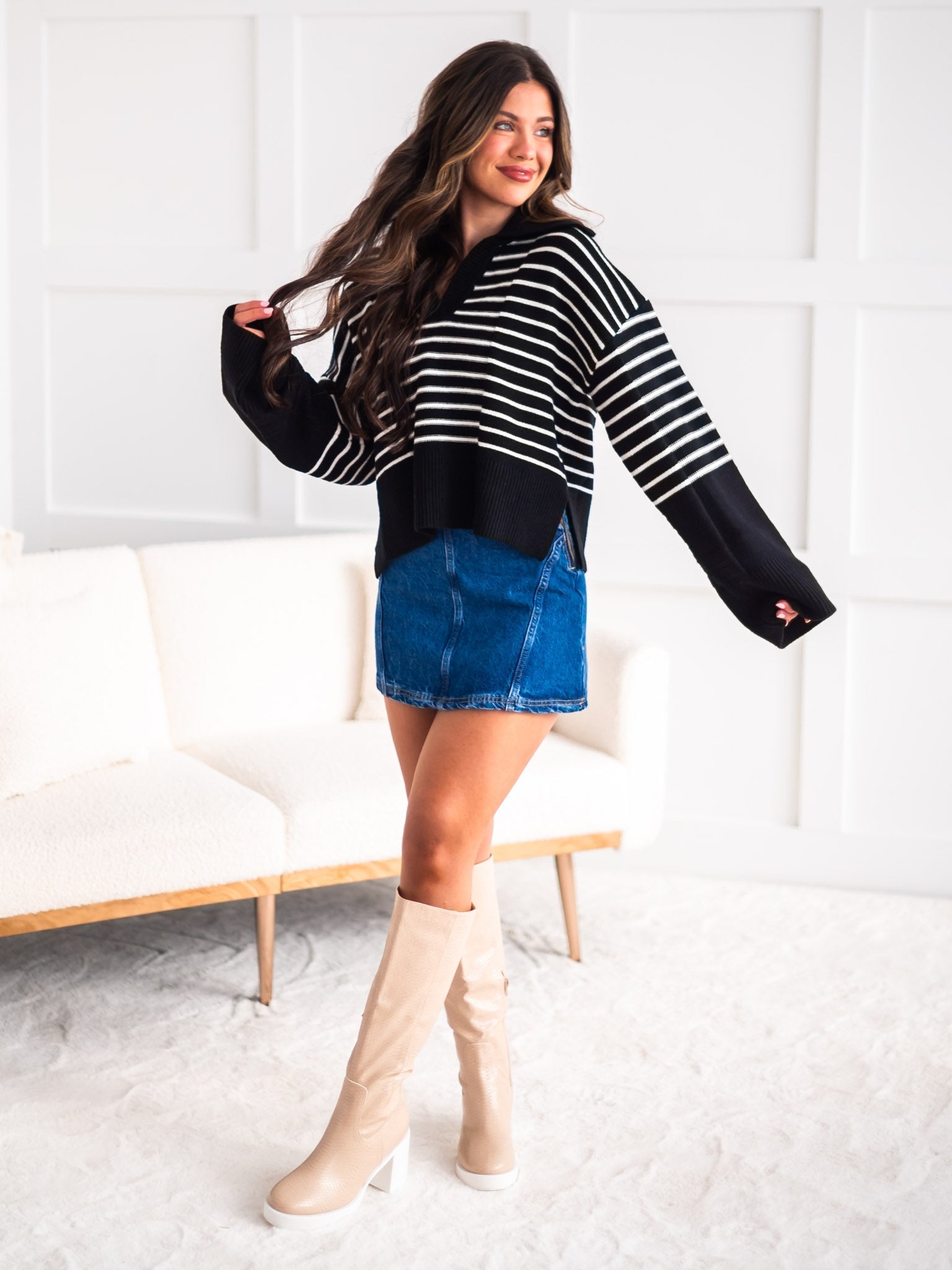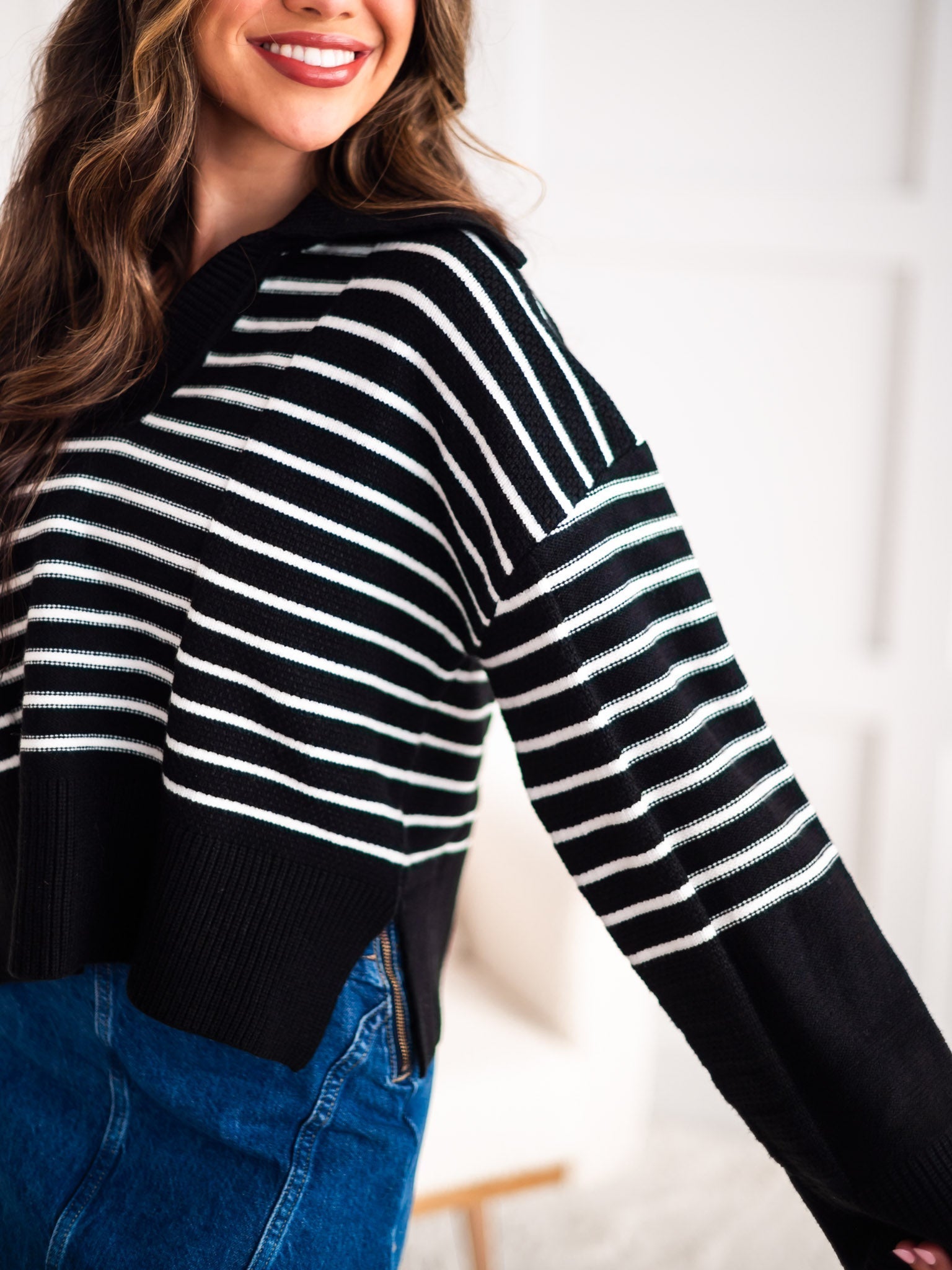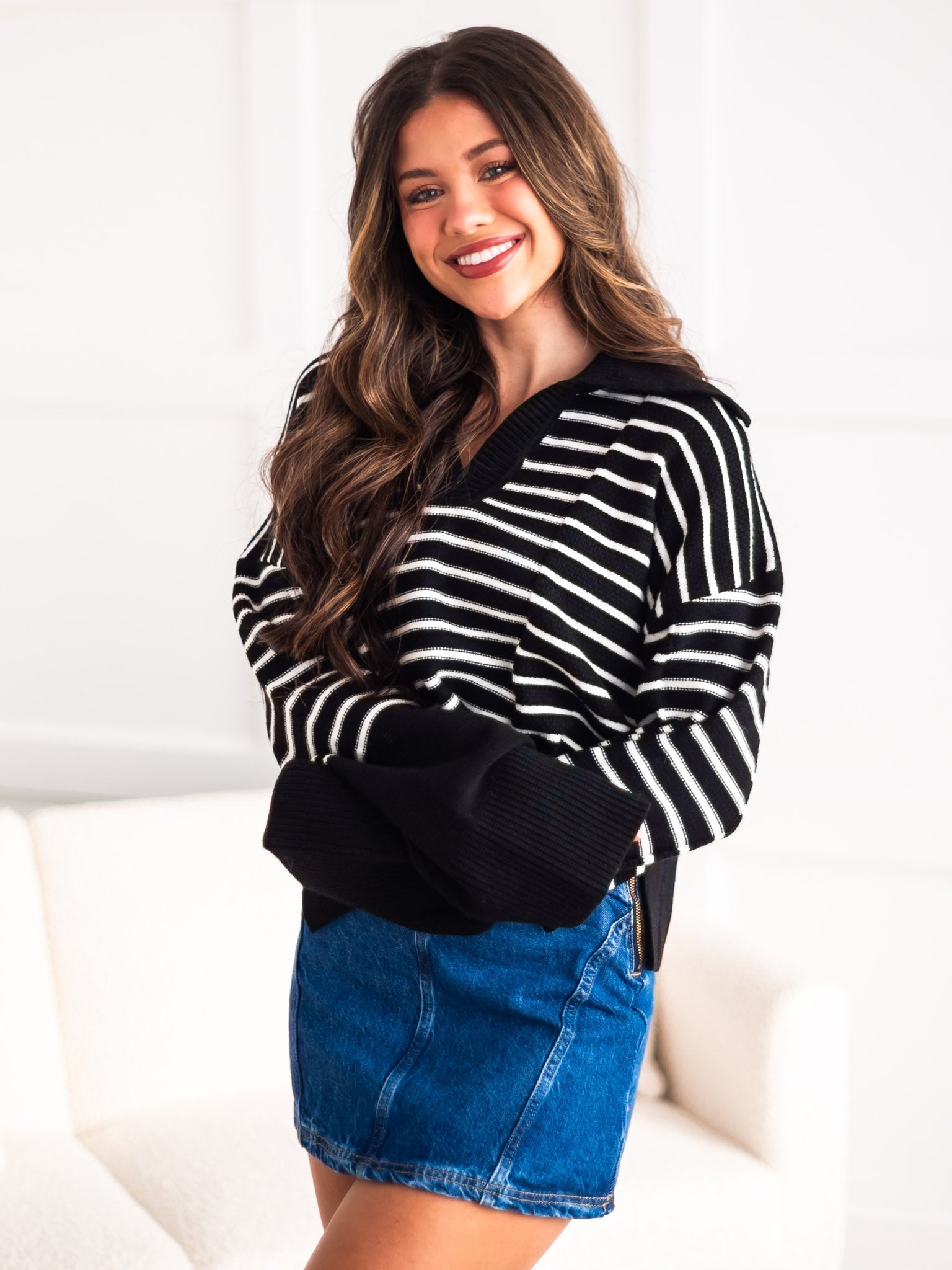 Upgrade your sweater game with the quirky and cozy "It Would Be You" sweater. This textured striped V-neck features a statement big collar, adding a unique touch to any outfit. Stay stylish and comfortable all day long with this captivating blend of texture and style.