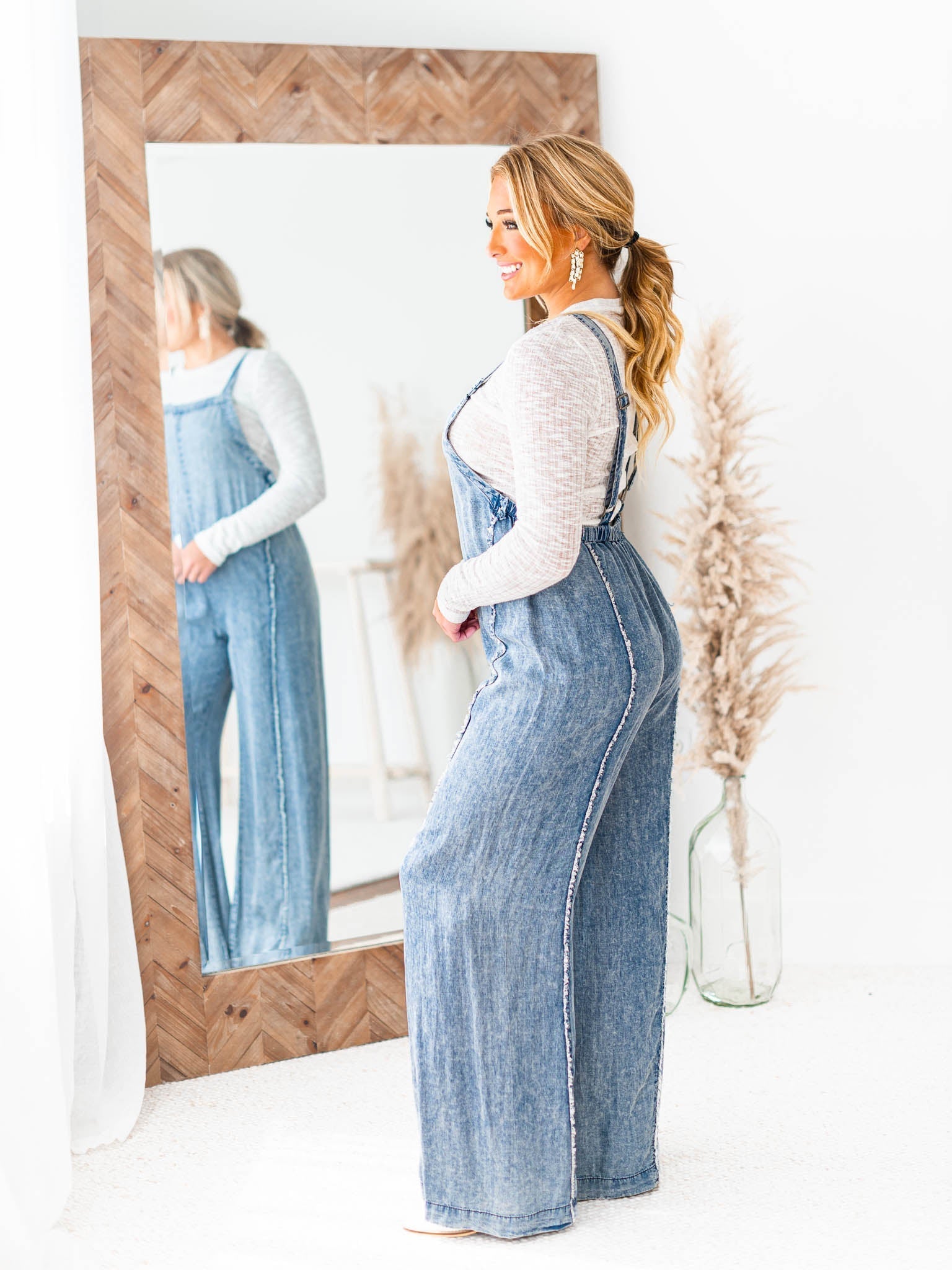 Look effortlessly stylish in the It's So Easy Mineral Wash Jumpsuit. The mineral wash gives it a cool, unique look while the adjustable straps, elastic waistband, raw edge hem, and wide legs ensure maximum comfort. It's so easy to look good!