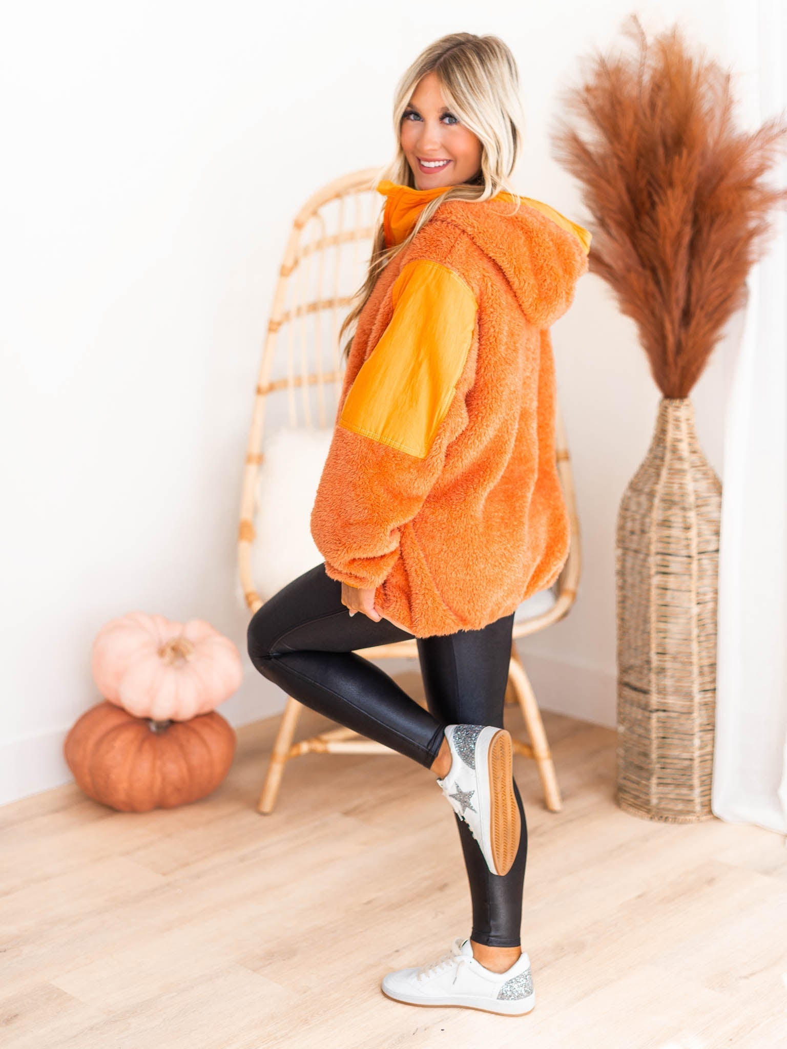 Get cozy and look cute in our Just Pretend Sherpa Pullover! This hooded pullover features nylon contrast accents, a 1/4" zipper, an oversized hood lined with a soft jersey fabric, and two kangaroo pockets, all in a plush, thick sherpa fabric. Snuggle up and get comfy today!