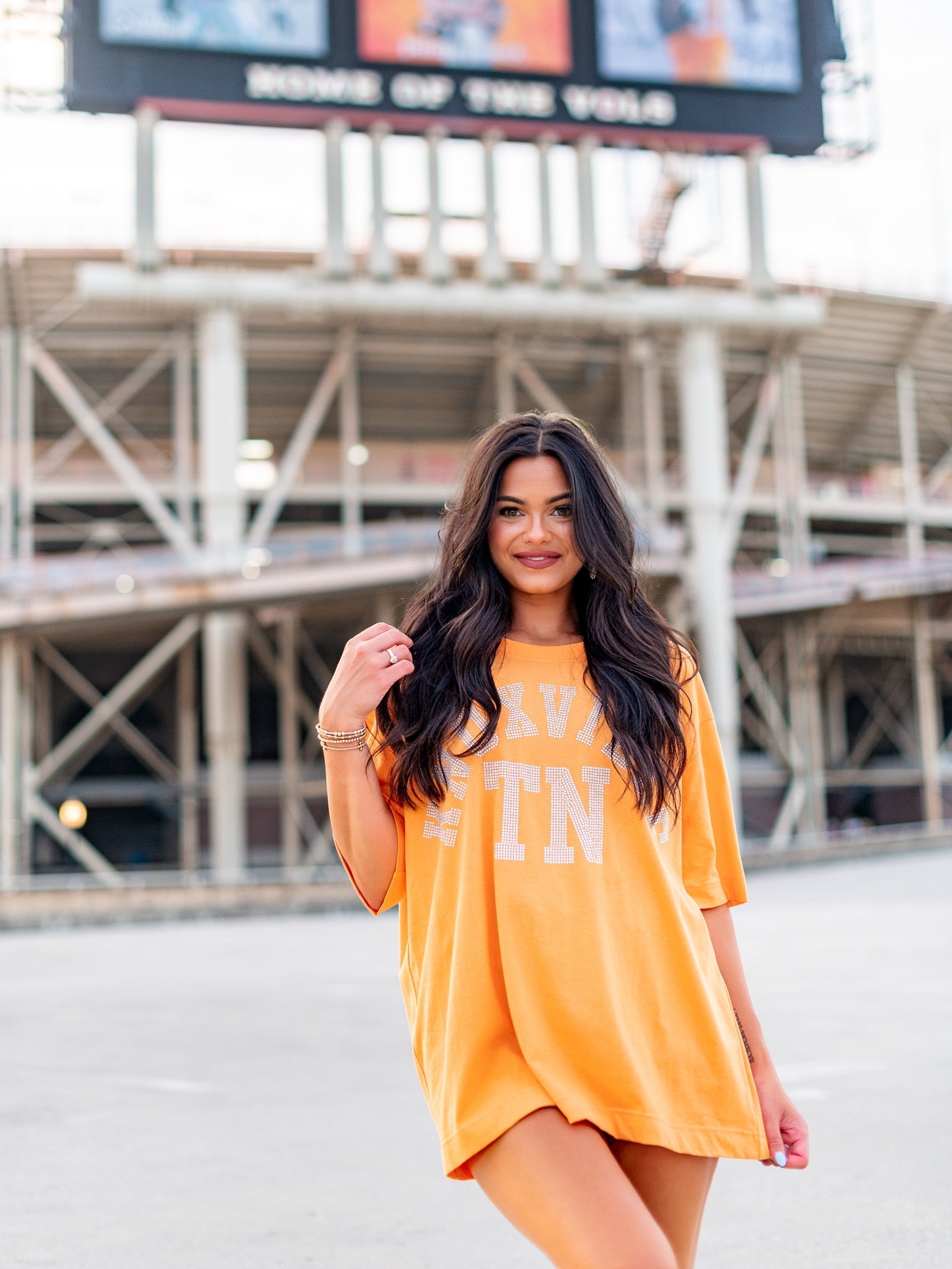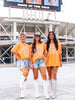 Get ready to shine and show your love for Knoxville, TN with our Rhinestone Tee. This playful orange tshirt is adorned with glimmering silver rhinestones, making it the perfect addition to your wardrobe. Let your style sparkle with this quirky and fun top!