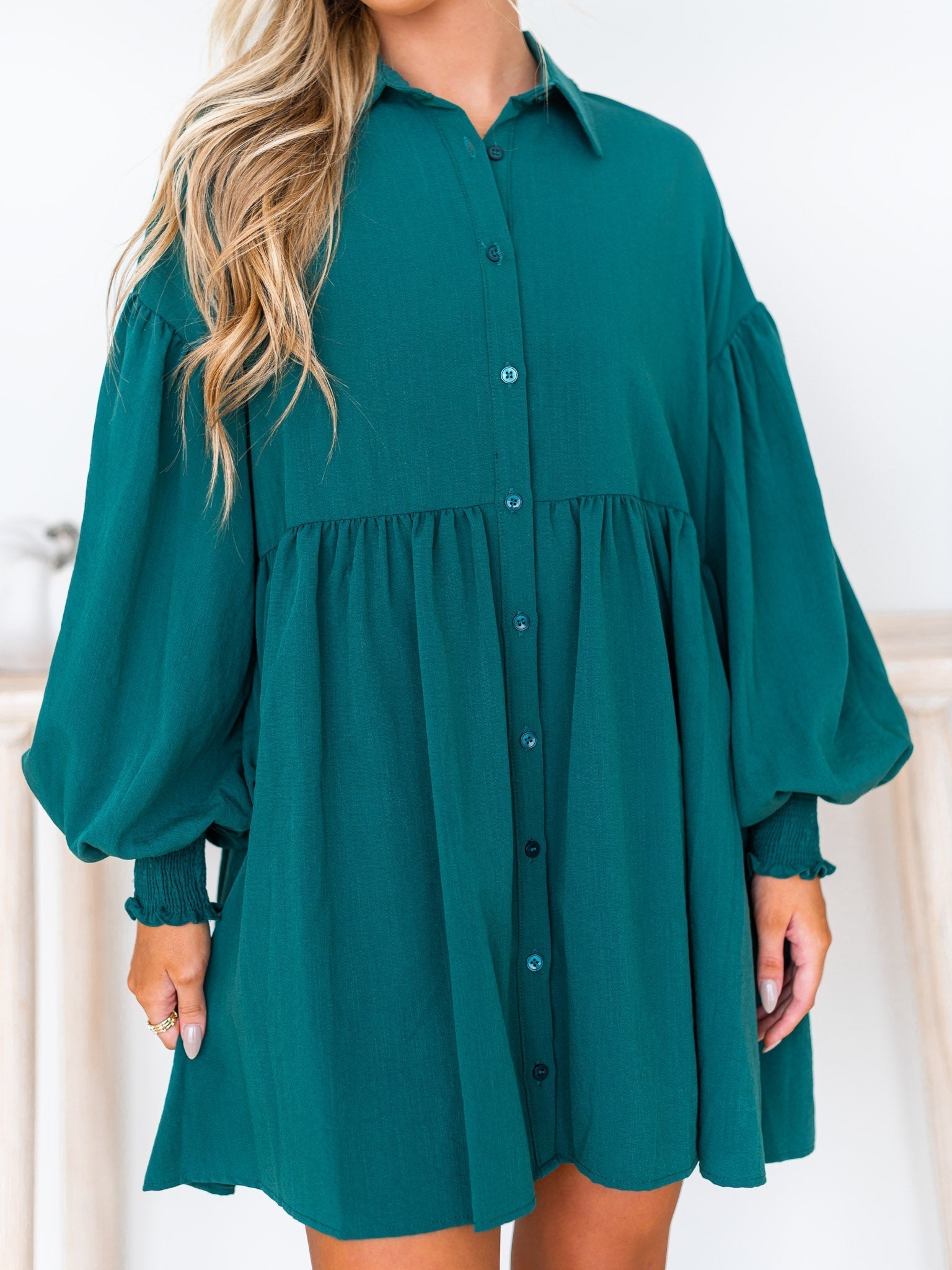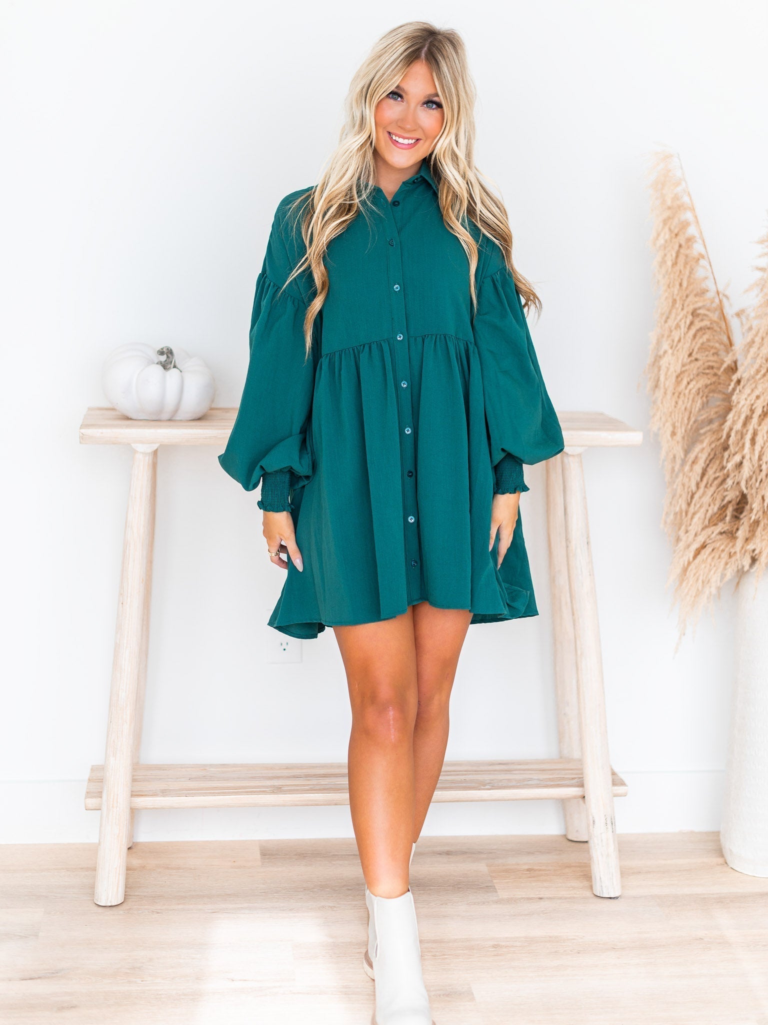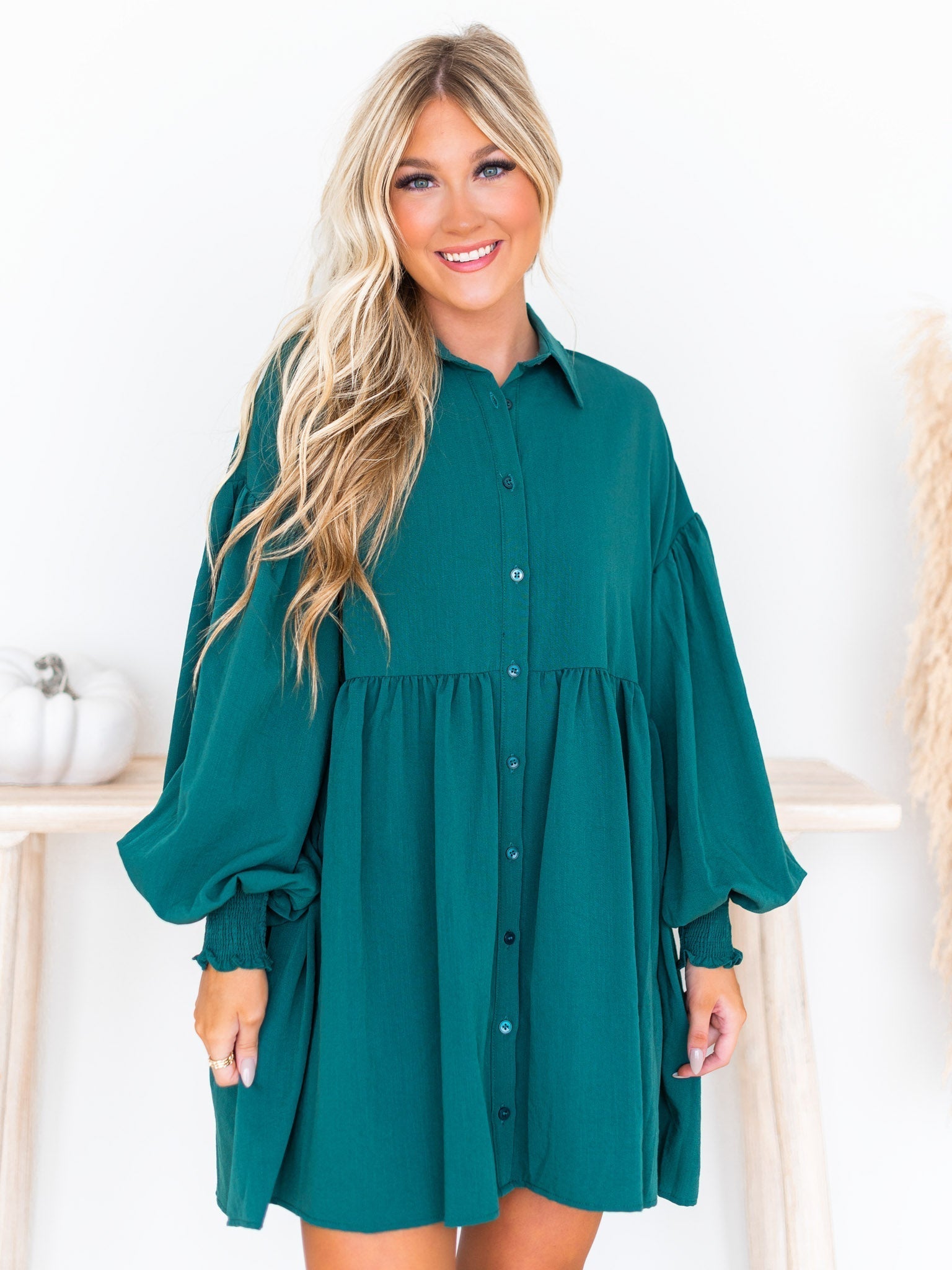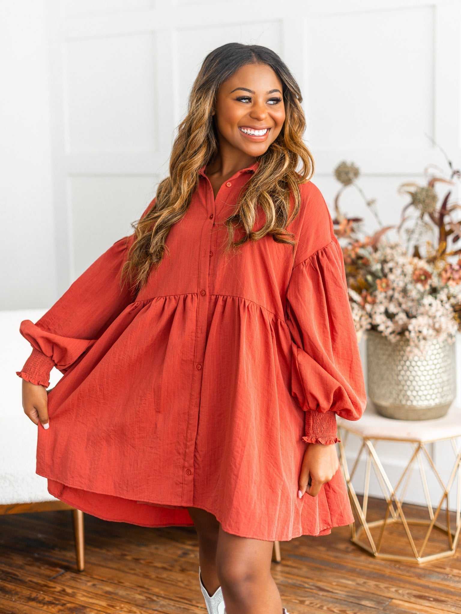 Make a statement in this Leave A Message Button Up Dress! It's textured fabric creates a unique look and the button-up style, side pockets, smocking at wrists, and drop shoulders make it a stylish, functional piece. Leave 'em speechless!