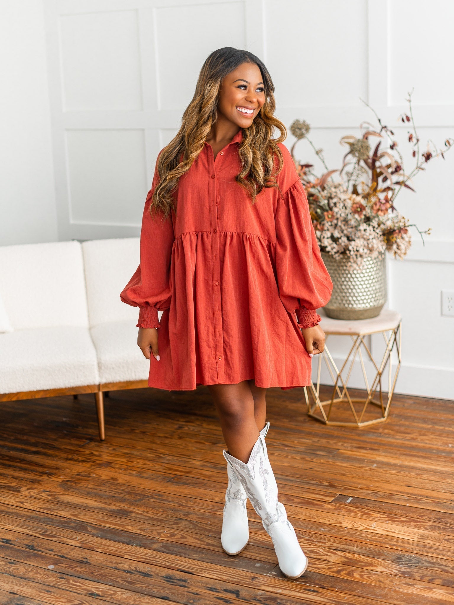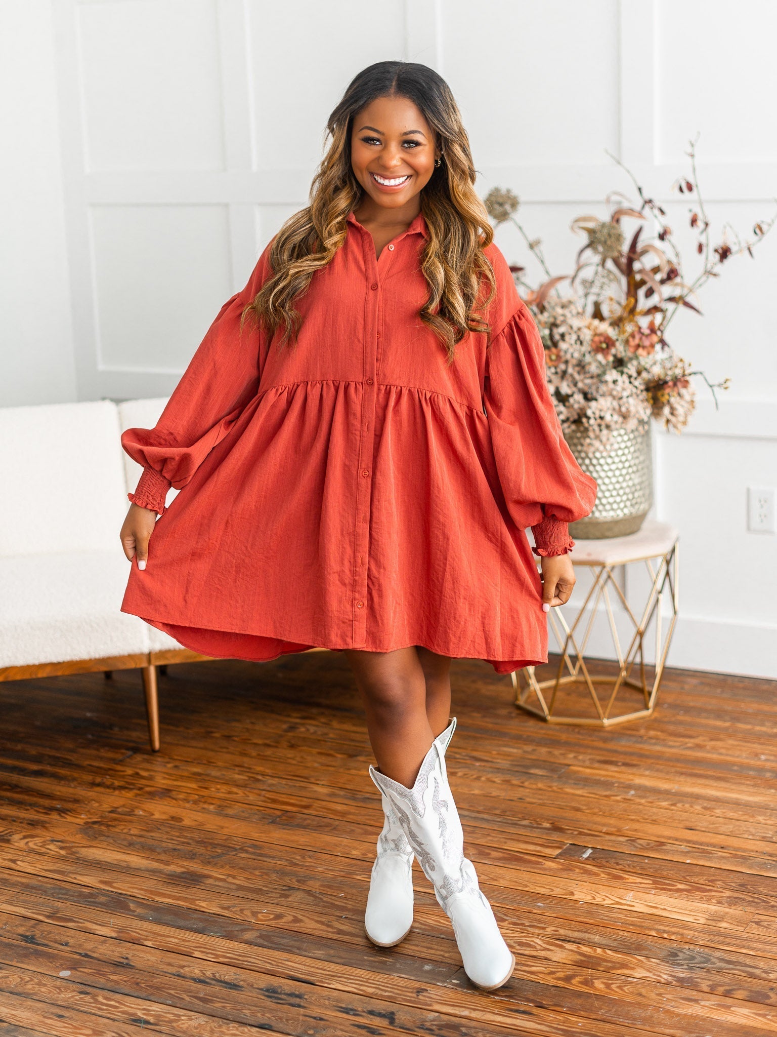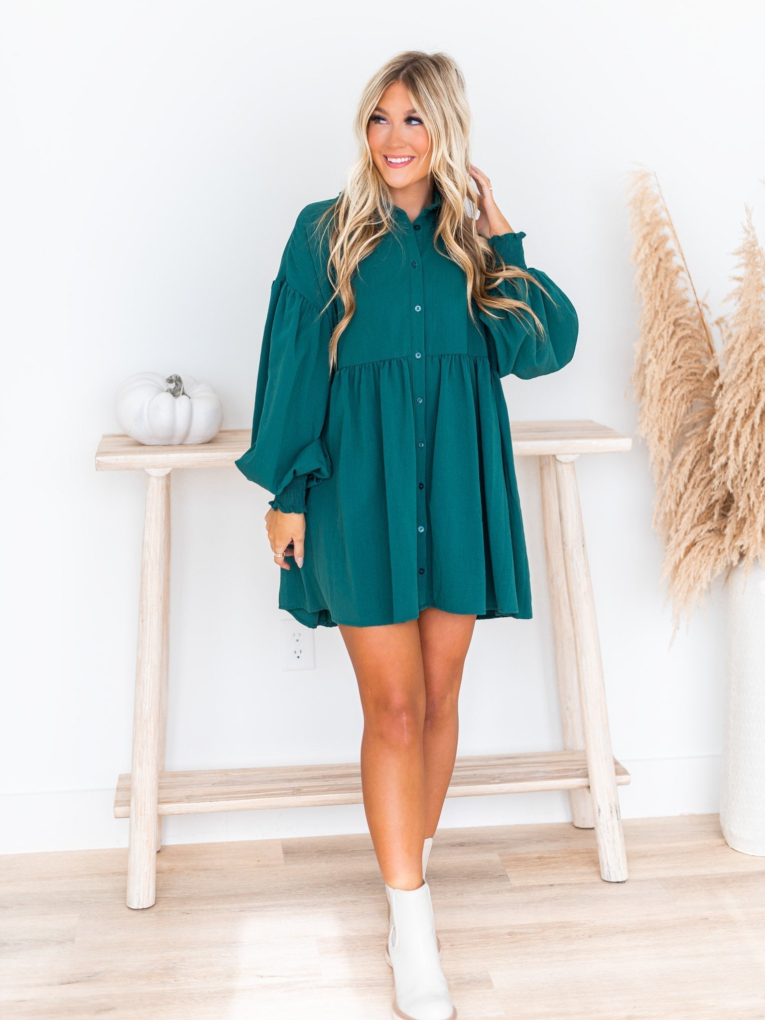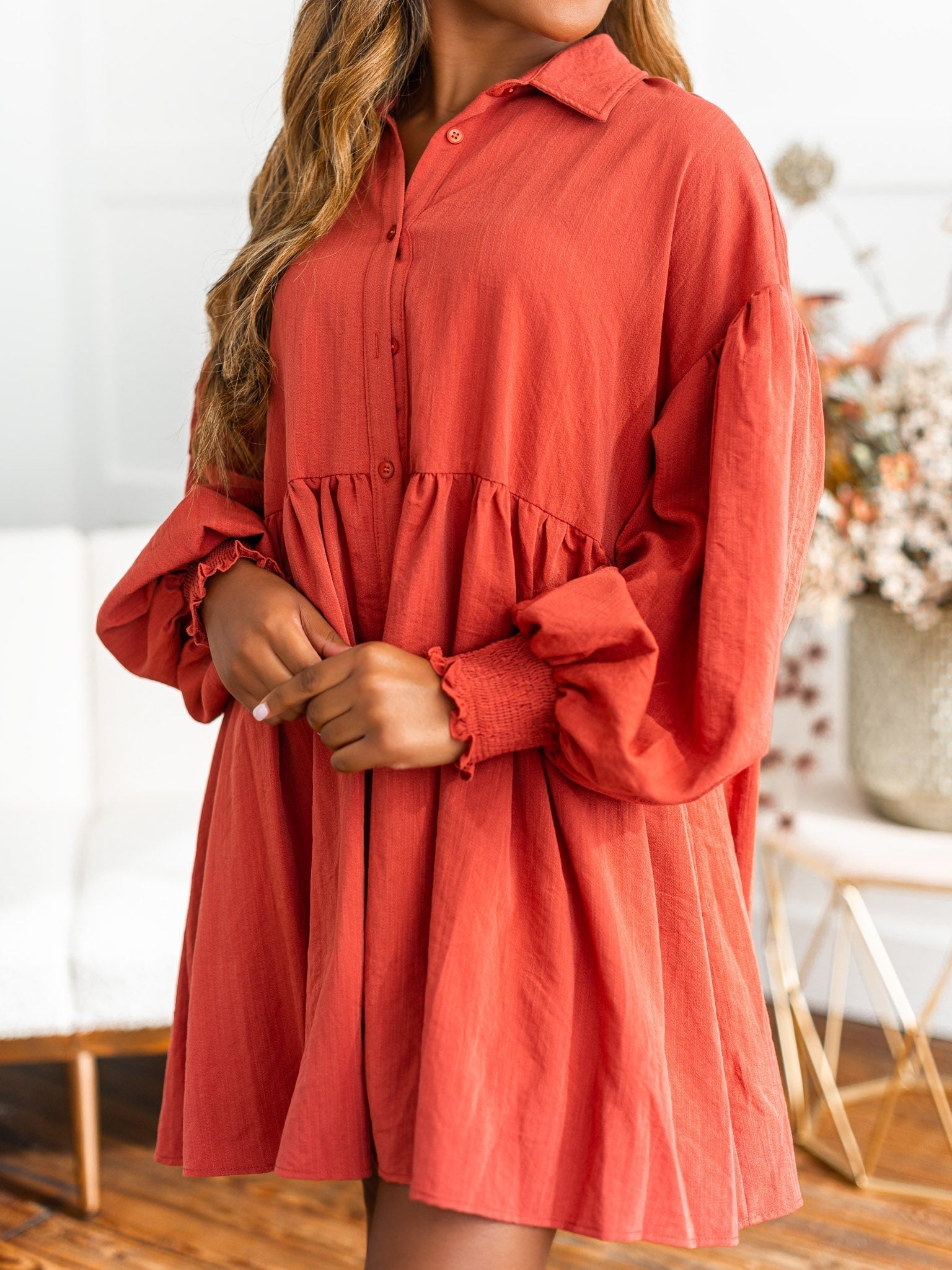 Make a statement in this Leave A Message Button Up Dress! It's textured fabric creates a unique look and the button-up style, side pockets, smocking at wrists, and drop shoulders make it a stylish, functional piece. Leave 'em speechless!