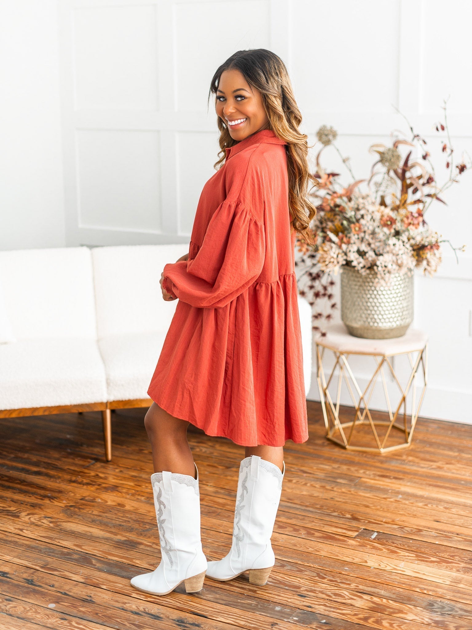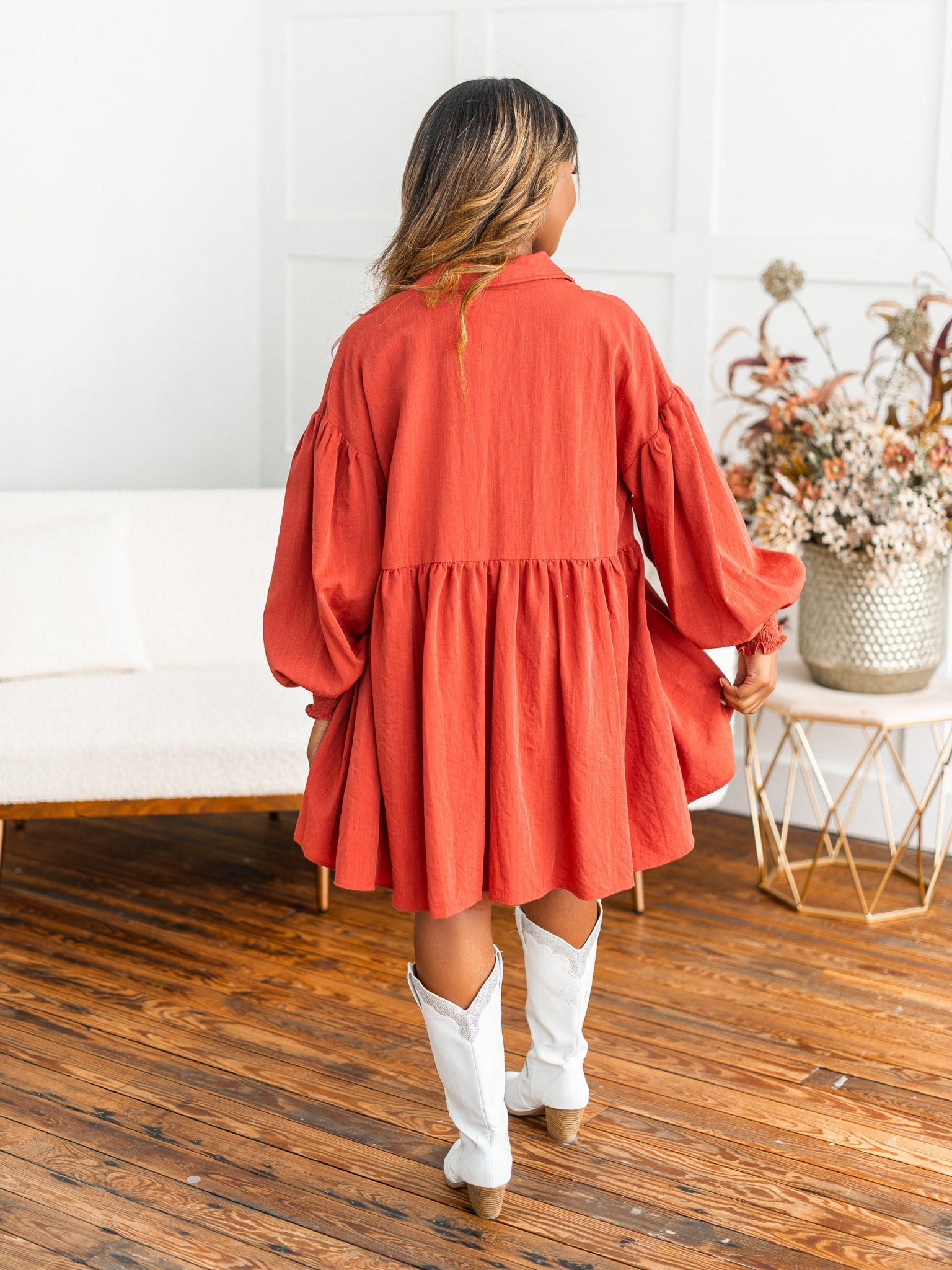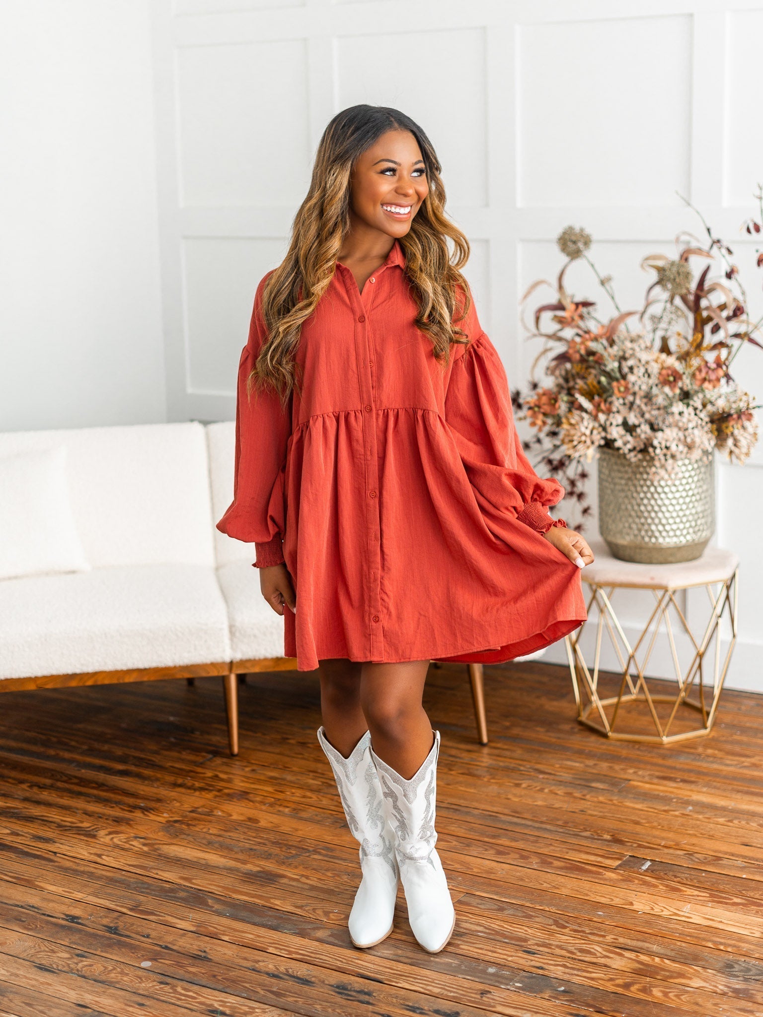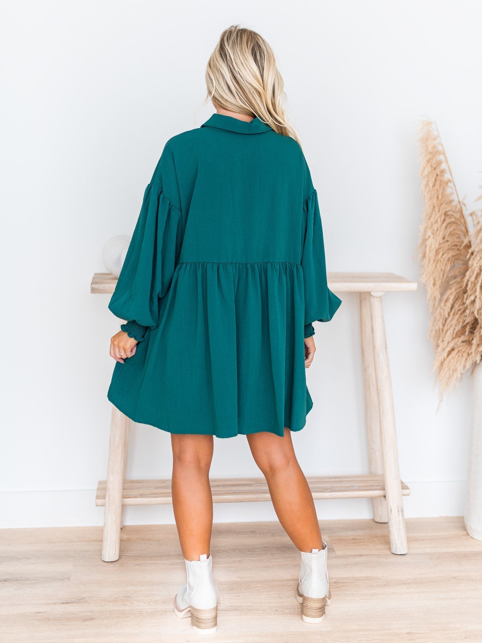 Make a statement in this Leave A Message Button Up Dress! It's textured fabric creates a unique look and the button-up style, side pockets, smocking at wrists, and drop shoulders make it a stylish, functional piece. Leave 'em speechless!