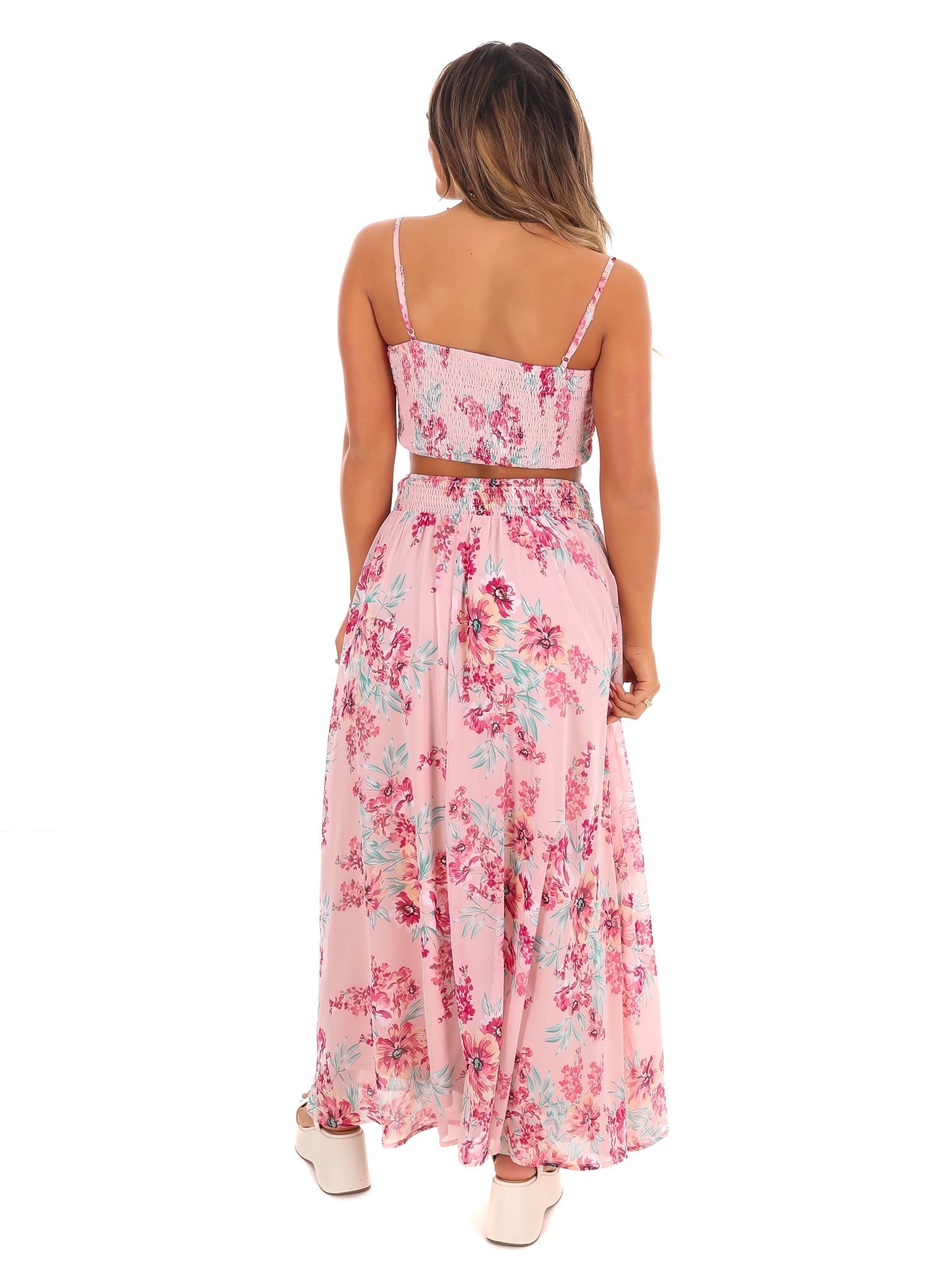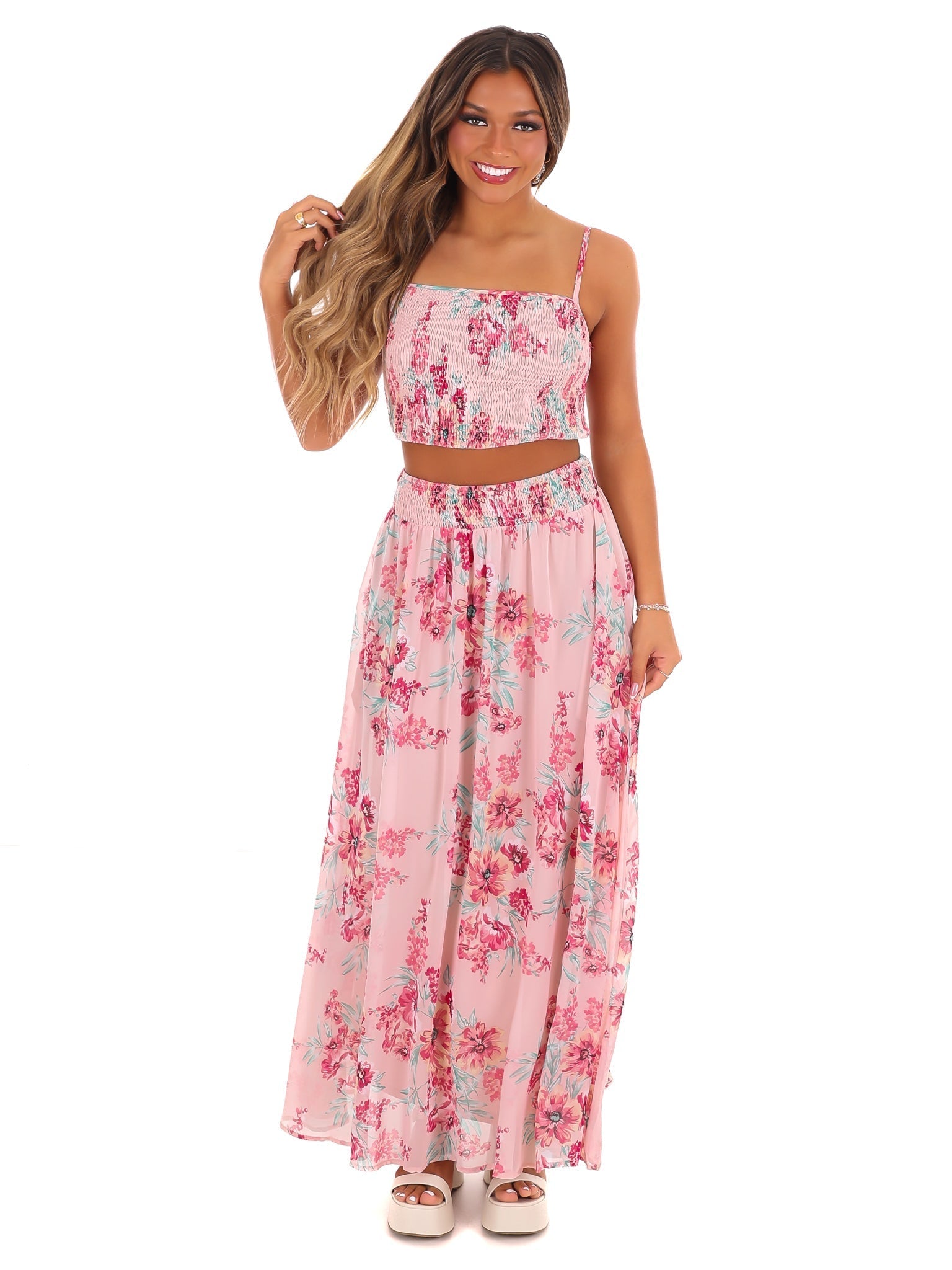 Effortlessly embrace your playful side with the Let Love Blossom Floral Two Piece Set. Perfect for vacations, this set features a smocked cami top with adjustable straps and a lined maxi skirt with hidden pockets. With a beautiful floral print and clean hem finish, this set is perfect for any day of fun in the sun.