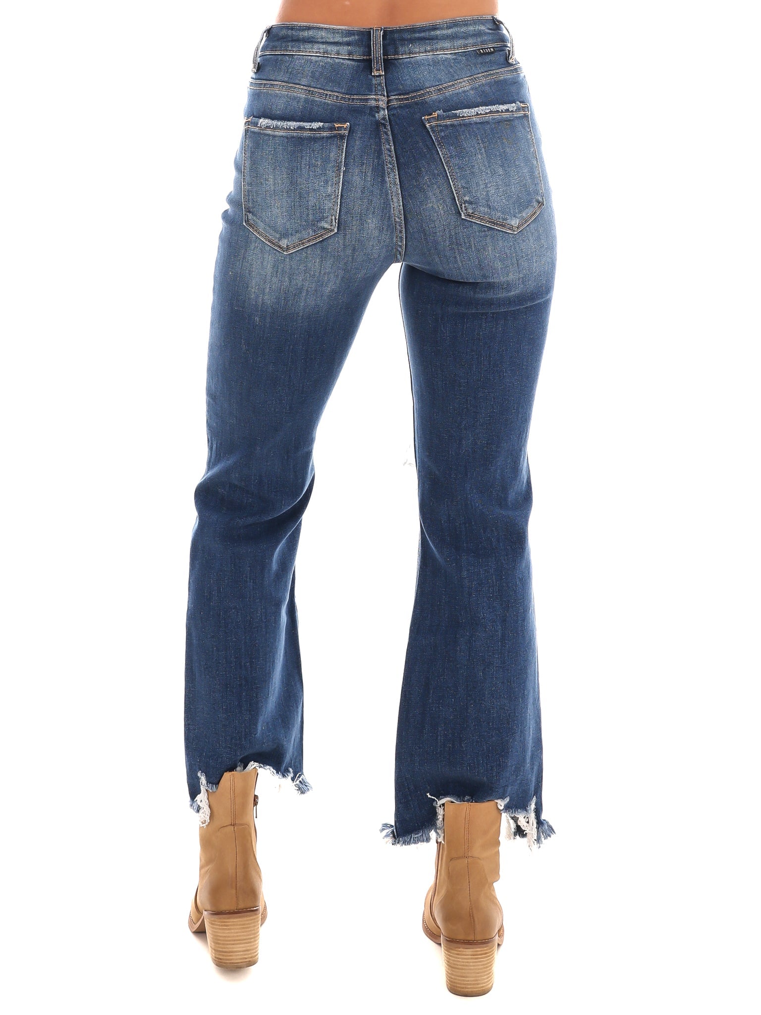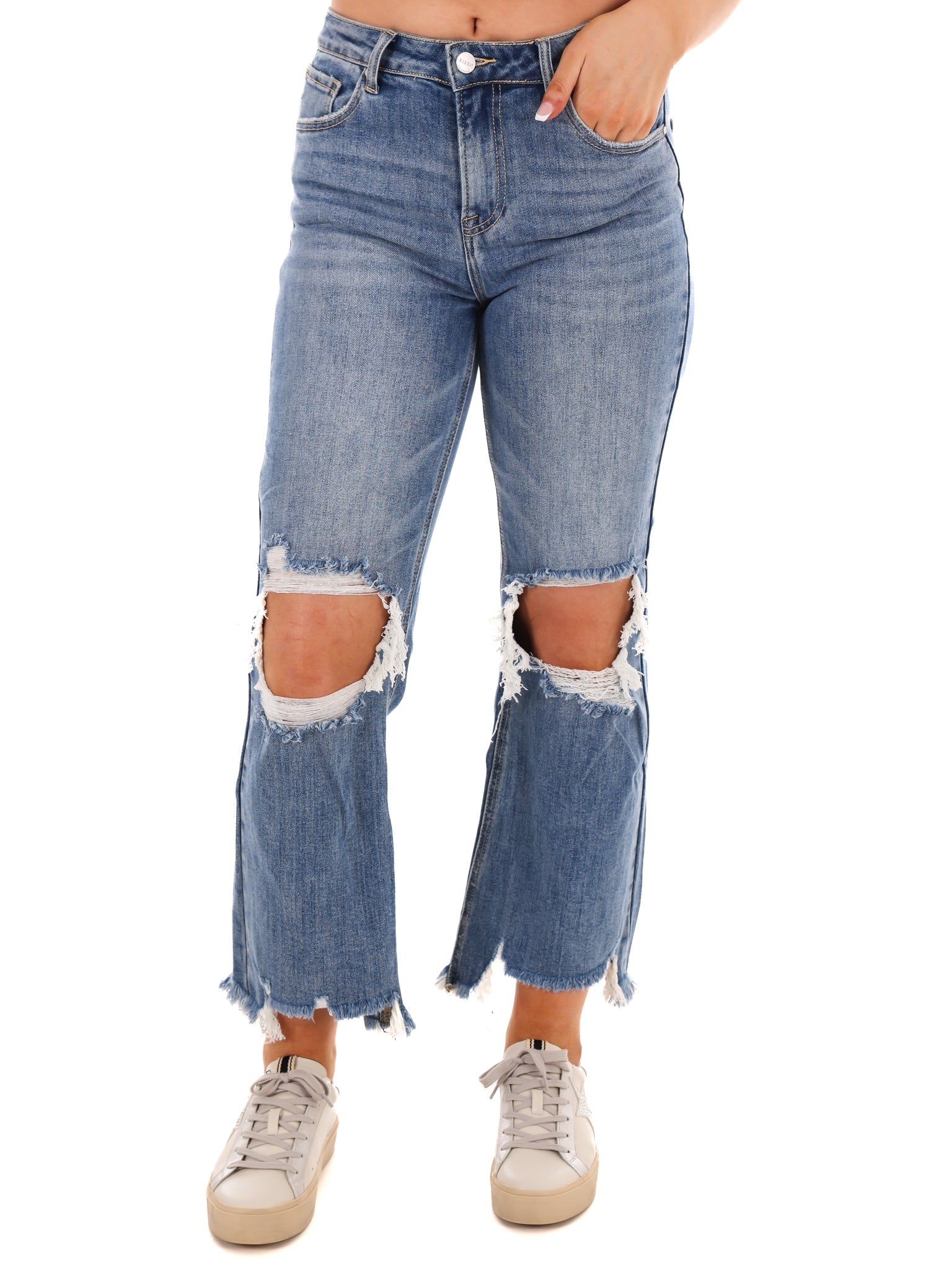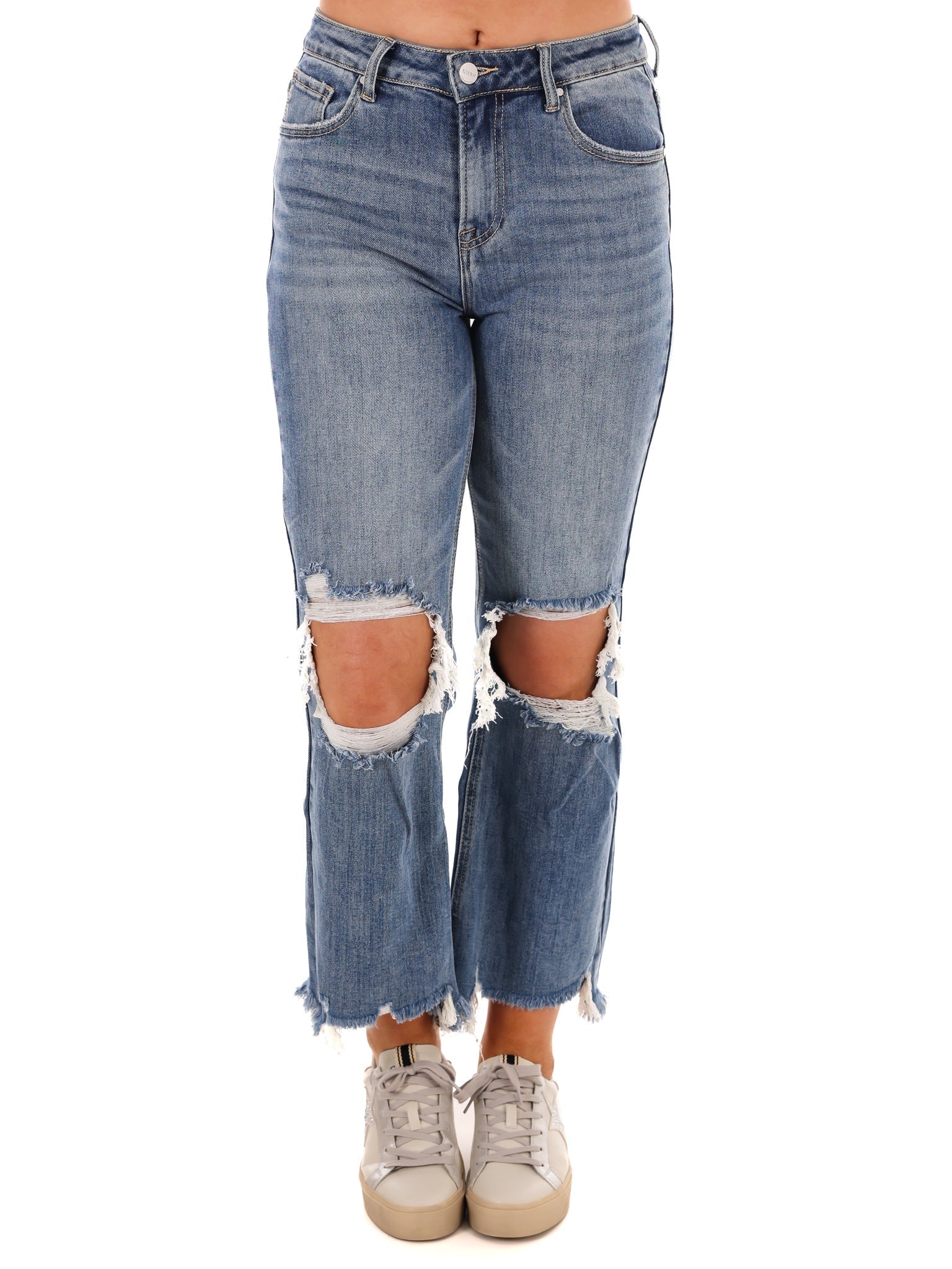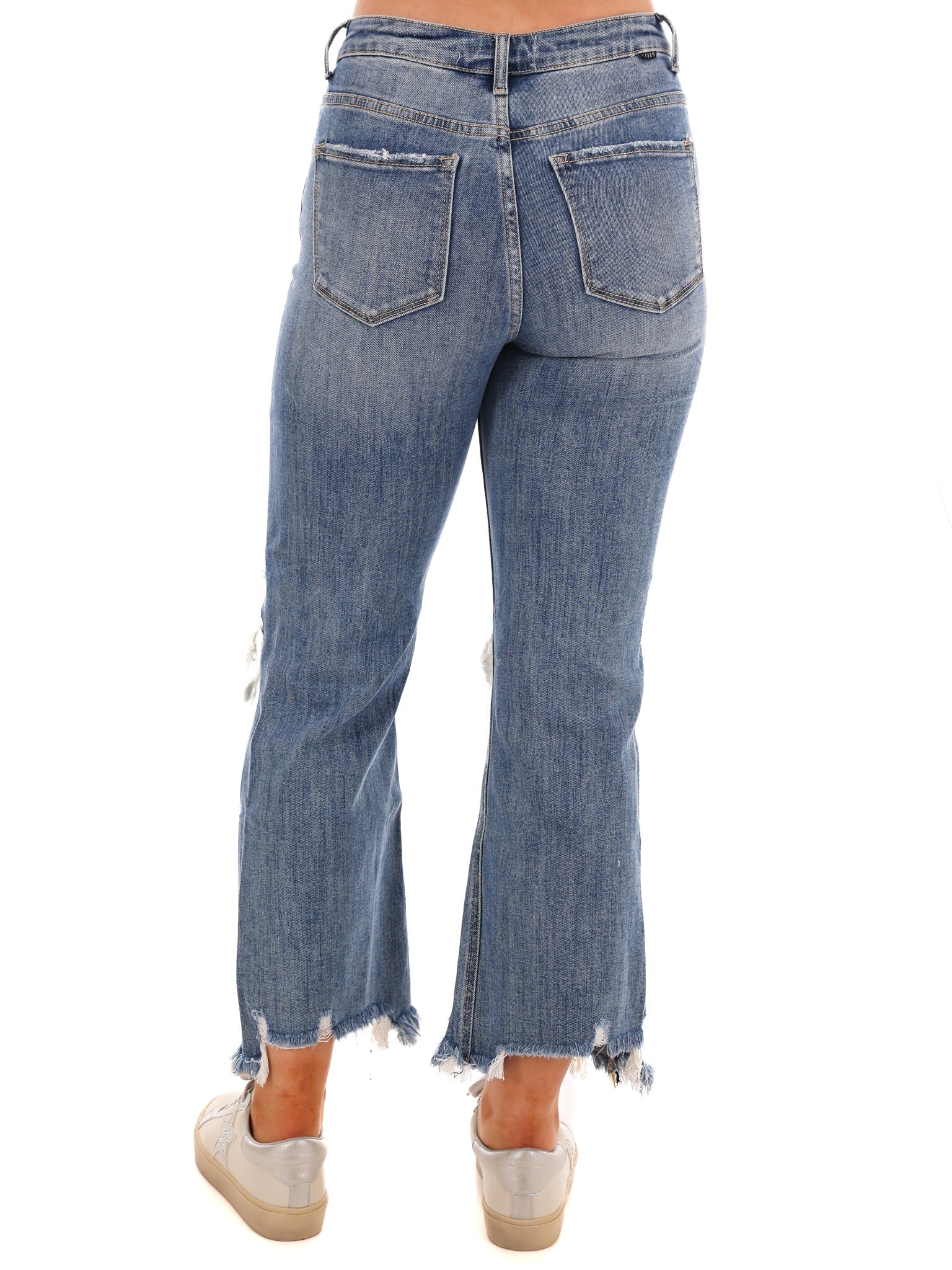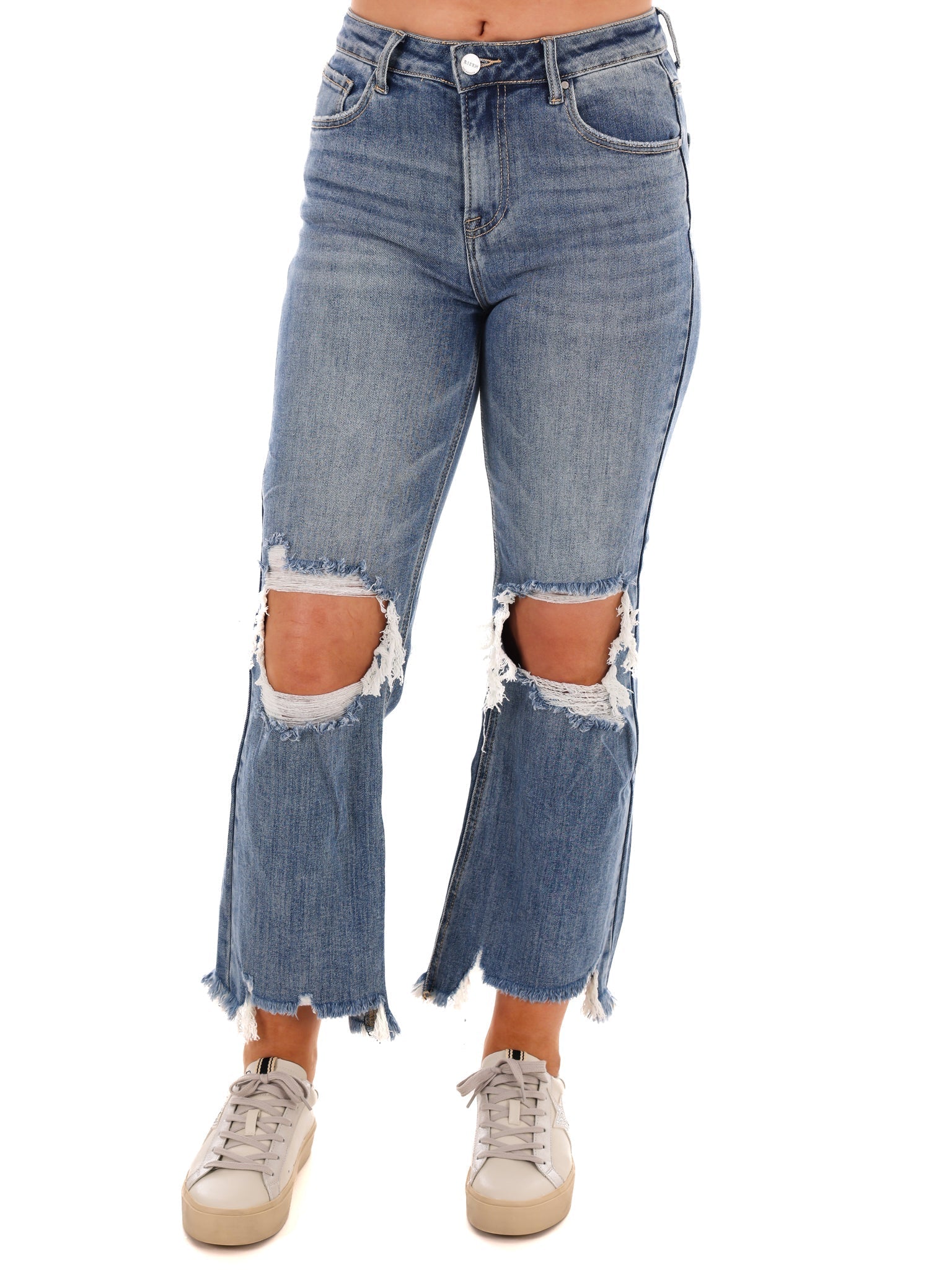 Move freely and feel fabulous in these Let me Go High Rise Crop Jeans. These light denim jeans feature a high-rise waistline, a cropped flare and distressed details for added style - as well as a raw edge hemline to add an extra touch of chic. Look great while enjoying unrestricted mobility.