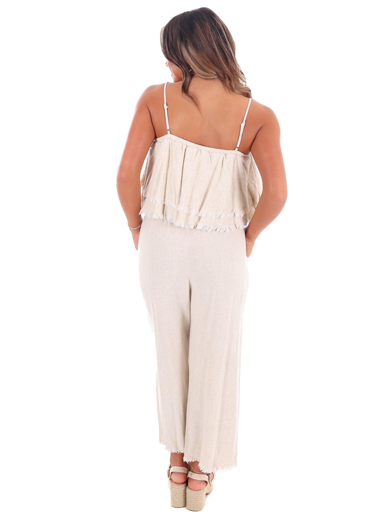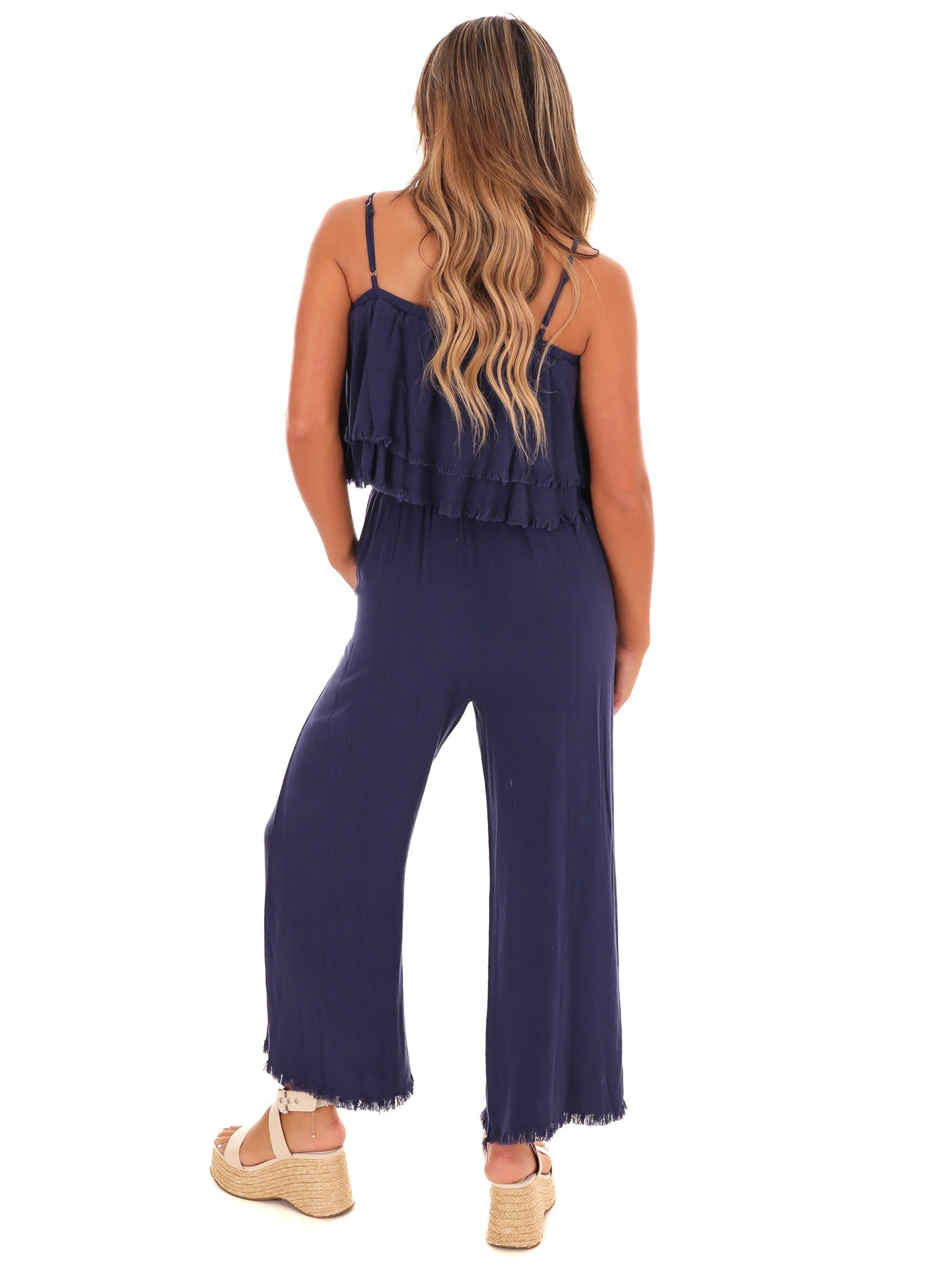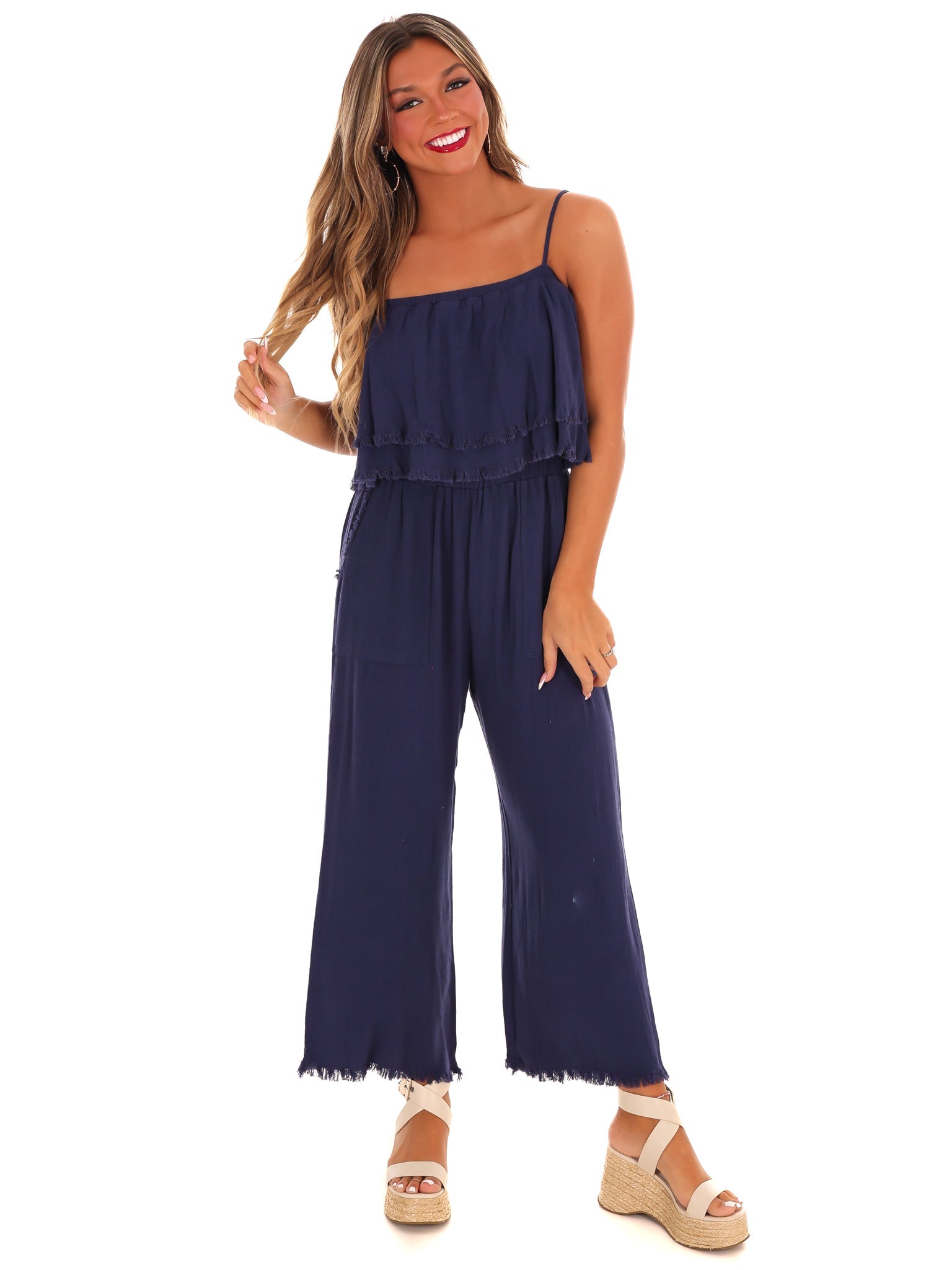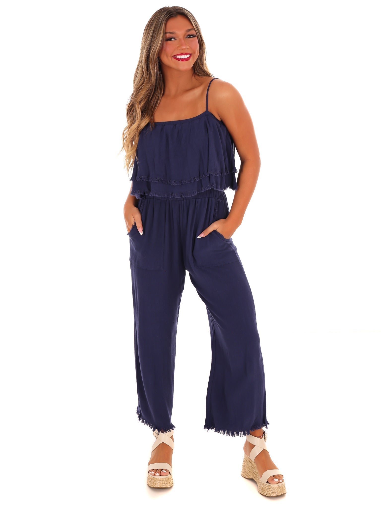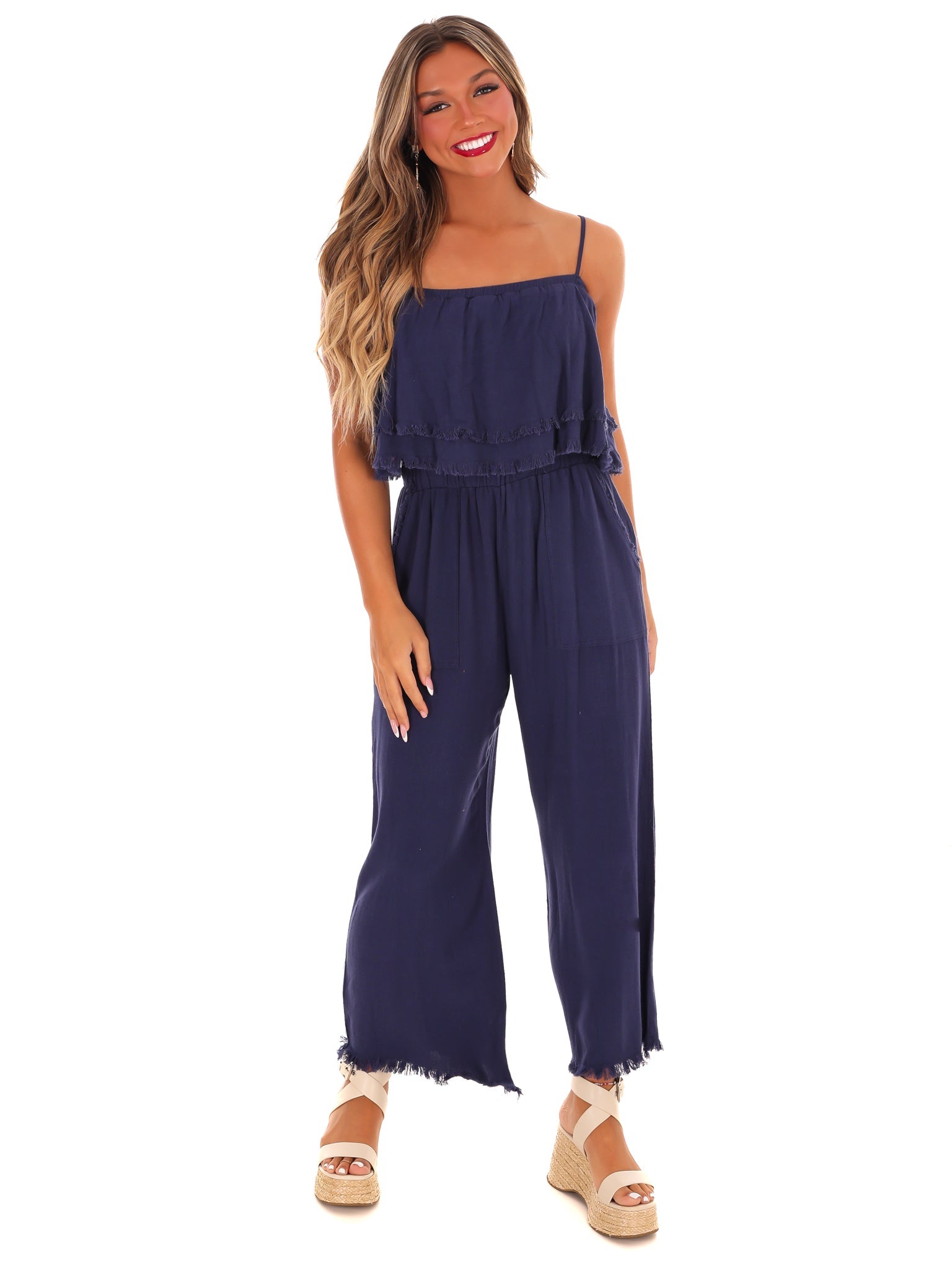 Introducing the Losing My Mind Tiered Jumpsuit, with delicate spaghetti straps and a gorgeous tiered ruffle design. With an unfinished hem, this playful jumpsuit brings a touch of whimsy to your wardrobe. Perfect for those who appreciate a little quirkiness in their style.