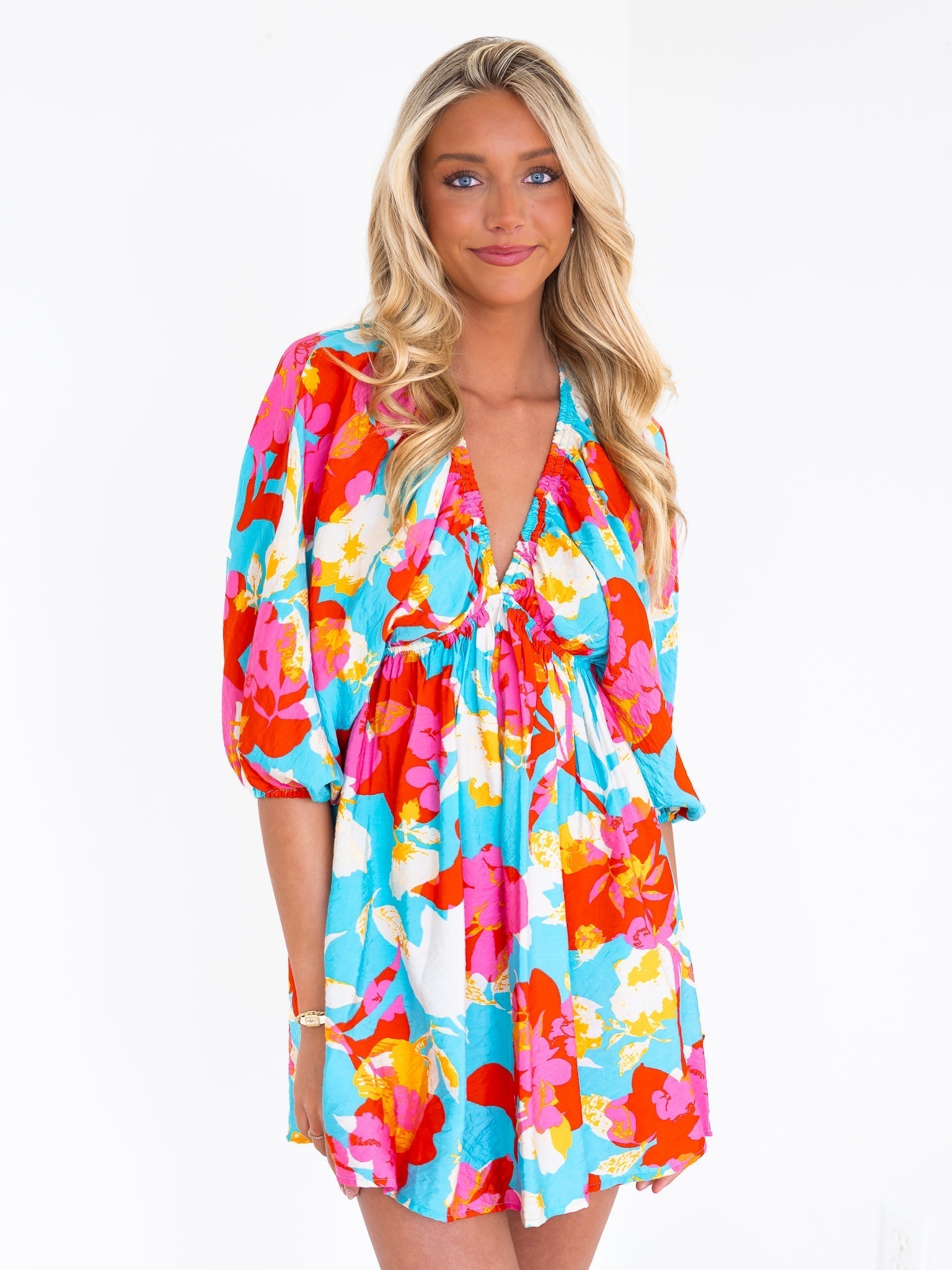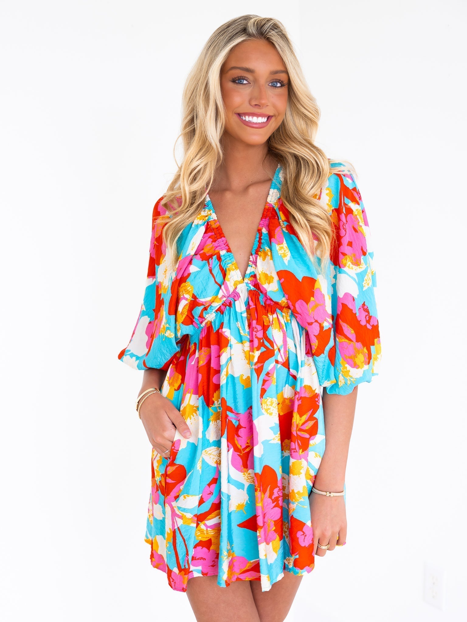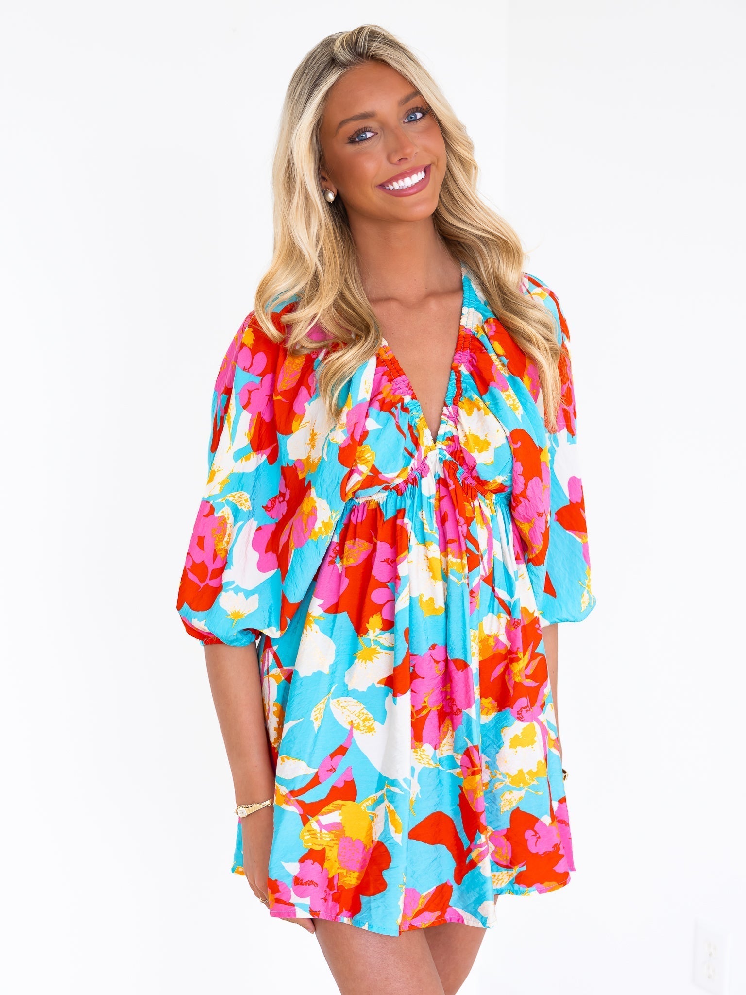 Spread the love (and style) in this bold print mini dress. Features include an elastic v-neckline, exaggerated balloon sleeves, and side pockets. Perfect for any occasion with its colorful flair. (Love it too much? We don't blame you.)