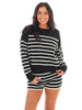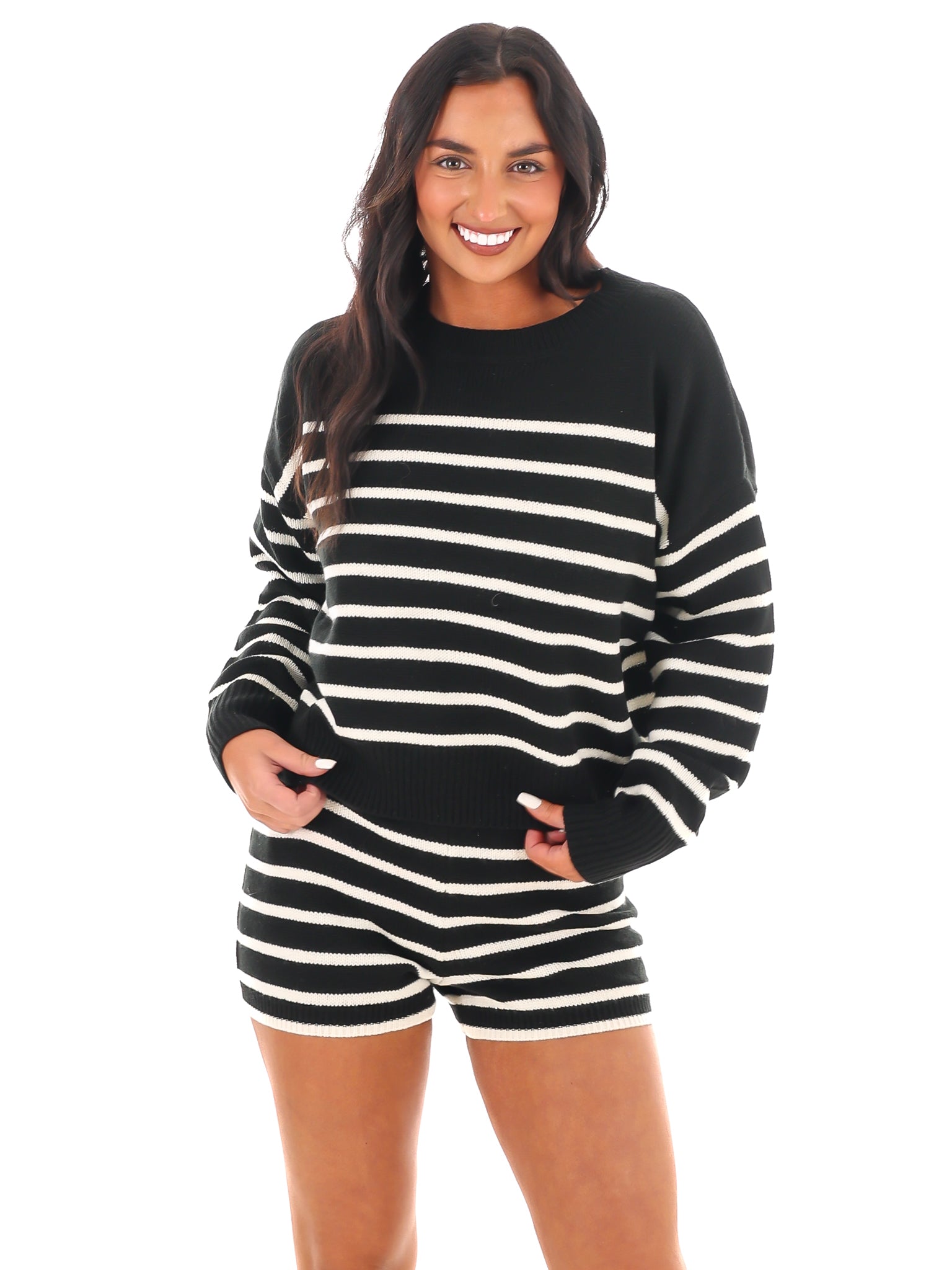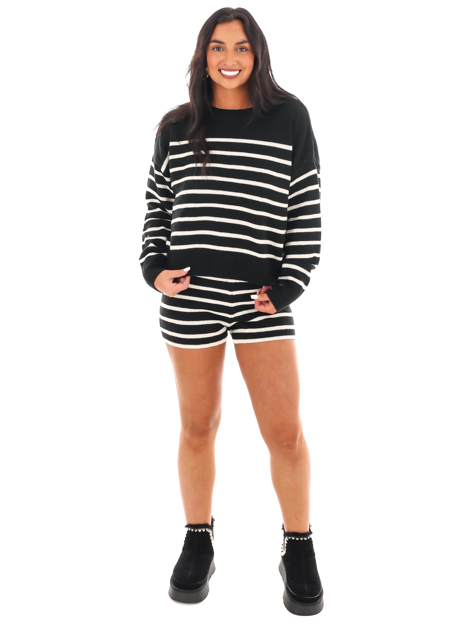 Effortlessly stylish and comfortable, this matching two piece set features playful stripes and solid colors. The relaxed-fit sweater has a crew neck, drop shoulders, and long sleeves, while the shorts have an elastic waist. Stay trendy and cozy all day long.