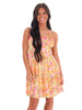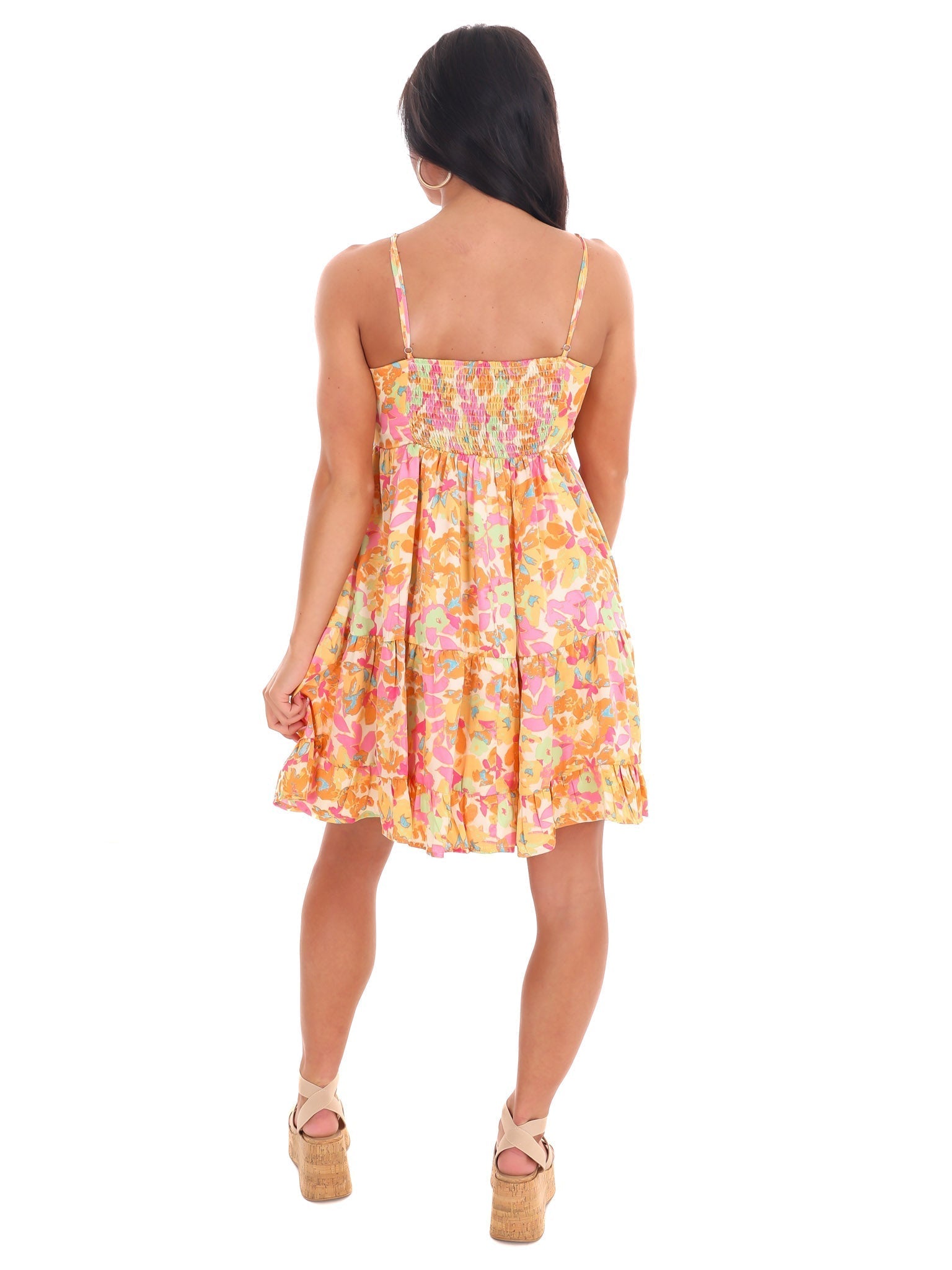 This mini dress is paradise on fabric, with a colorful abstract print and silky satin material. The v-neck and adjustable spaghetti straps provide a flattering fit, while the ruching detail adds a touch of texture. The smocked back and peplum waistline complete this fun and flirty look.