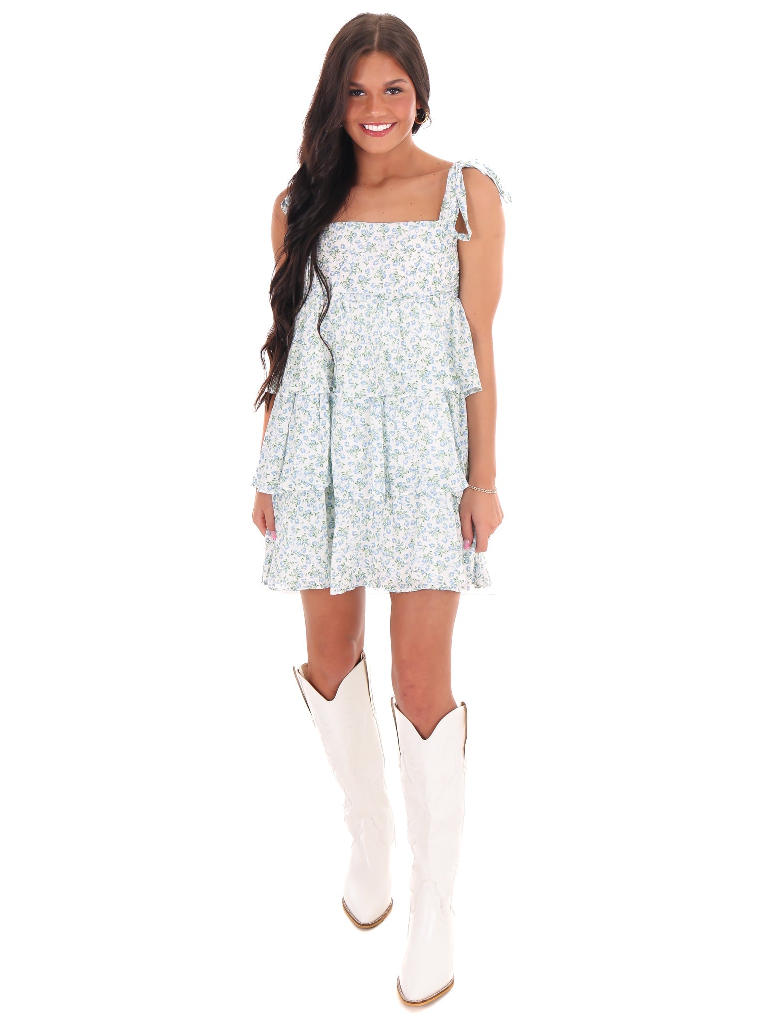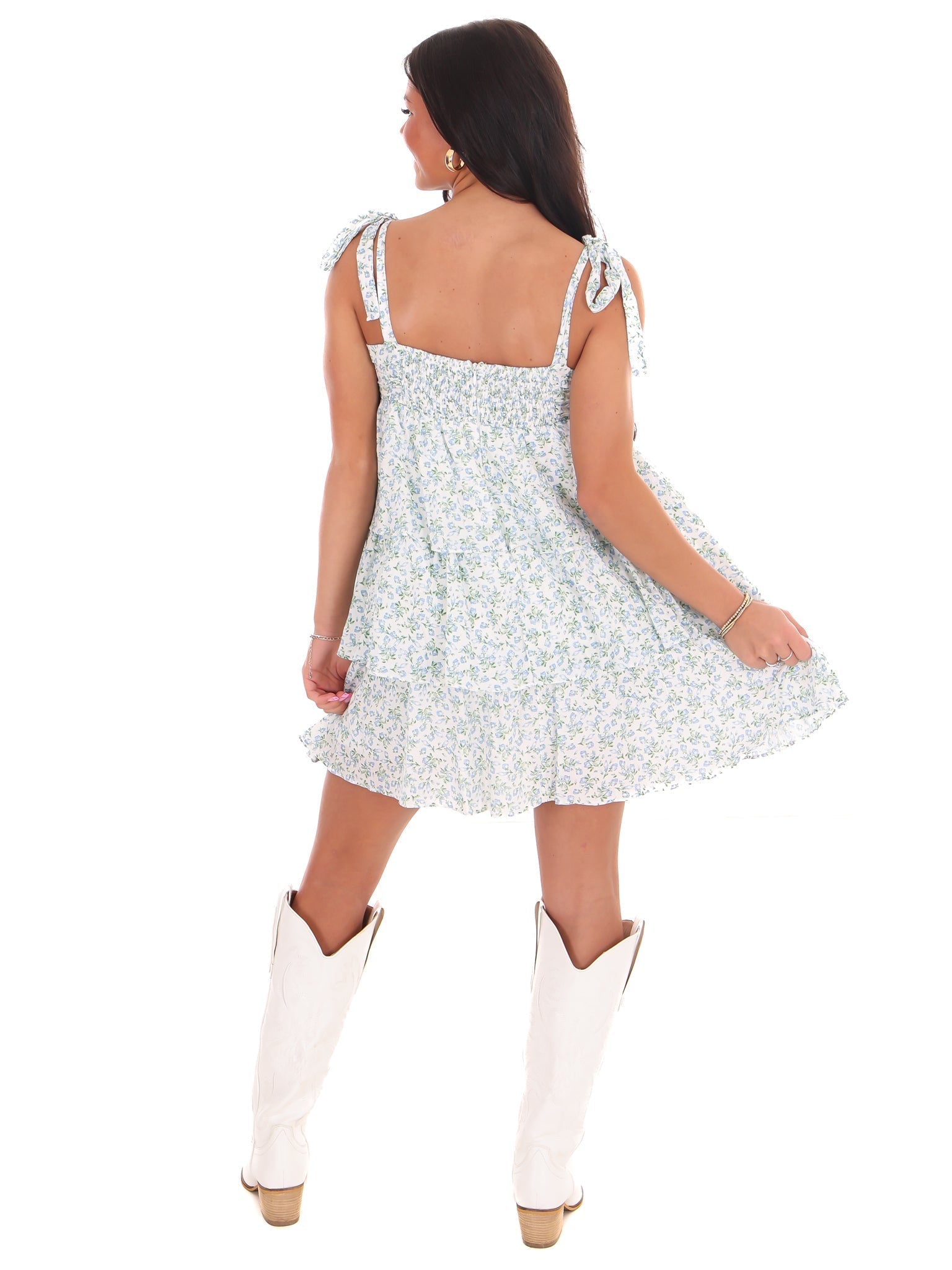Discover your playful side with the Moments of Me Floral Mini Dress. This ditsy floral dress features a flattering a-line silhouette with a straight neckline and playful self-tie ribbon sleeves. The smocked upper back and invisible back zipper ensure a comfortable and secure fit, while the ruffled tiered bottom adds a flirty touch to this must-have dress. Let your inner free spirit shine in this fun and flirty mini dress!