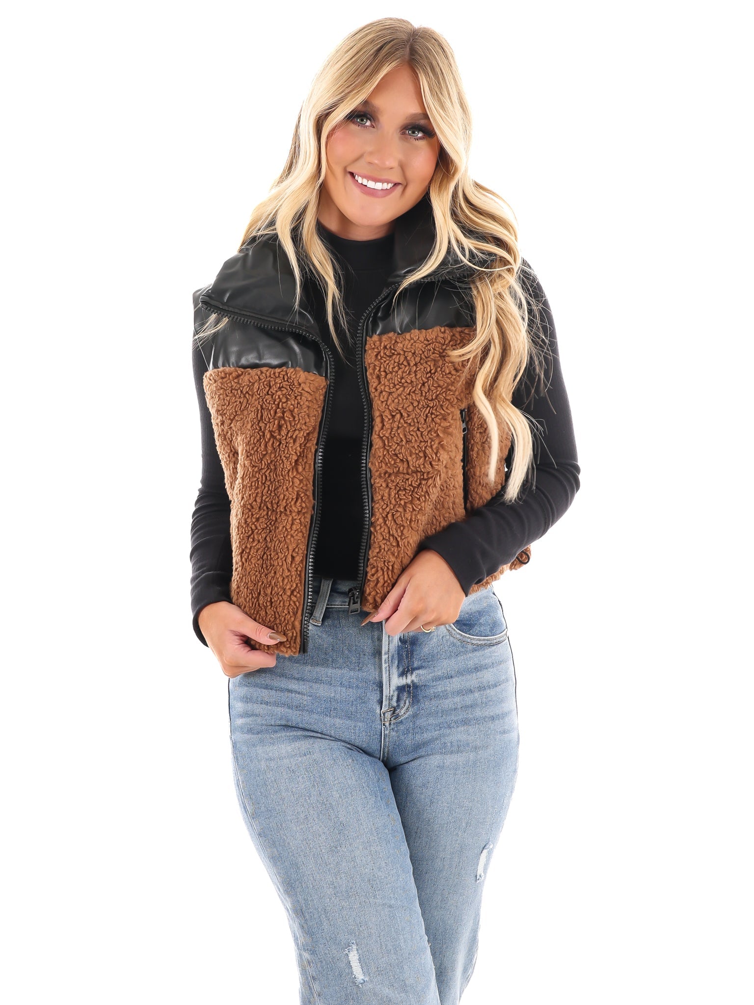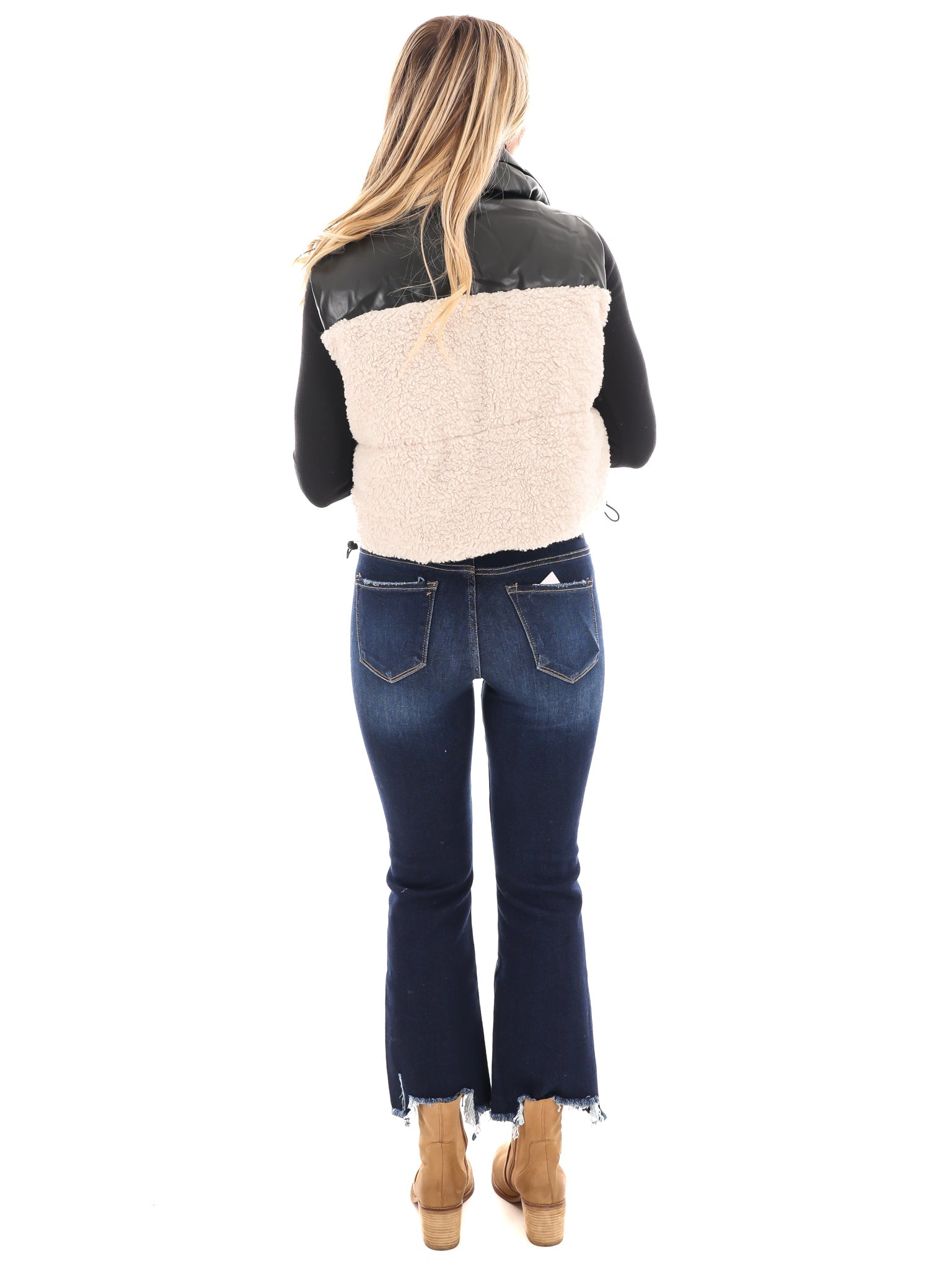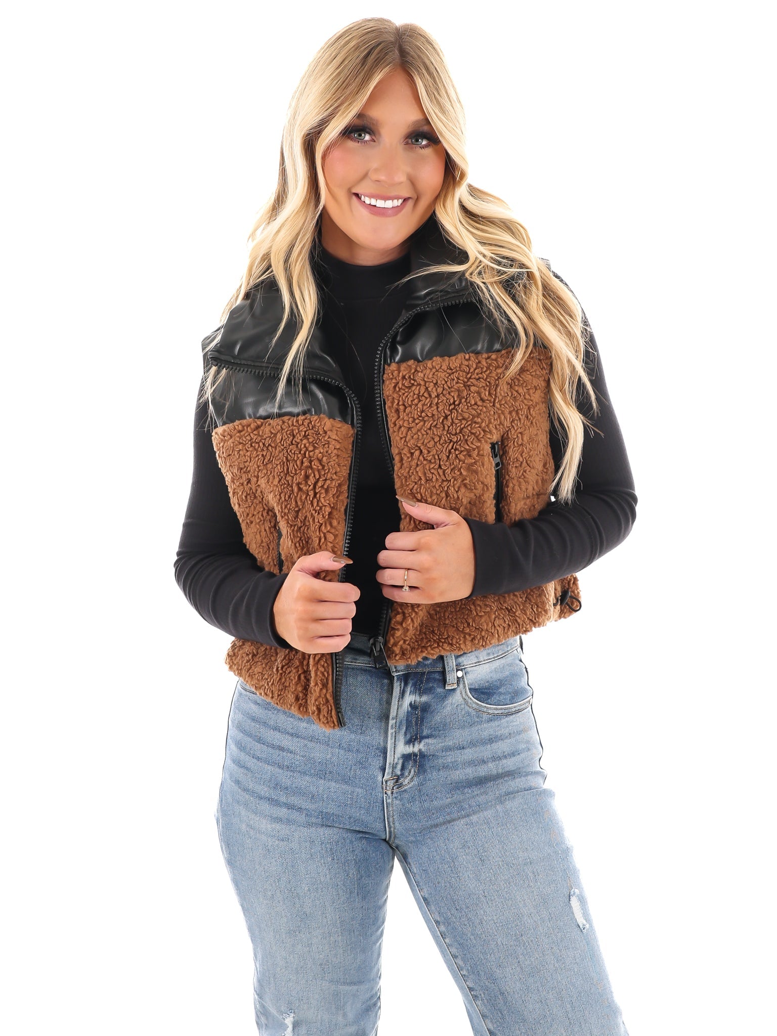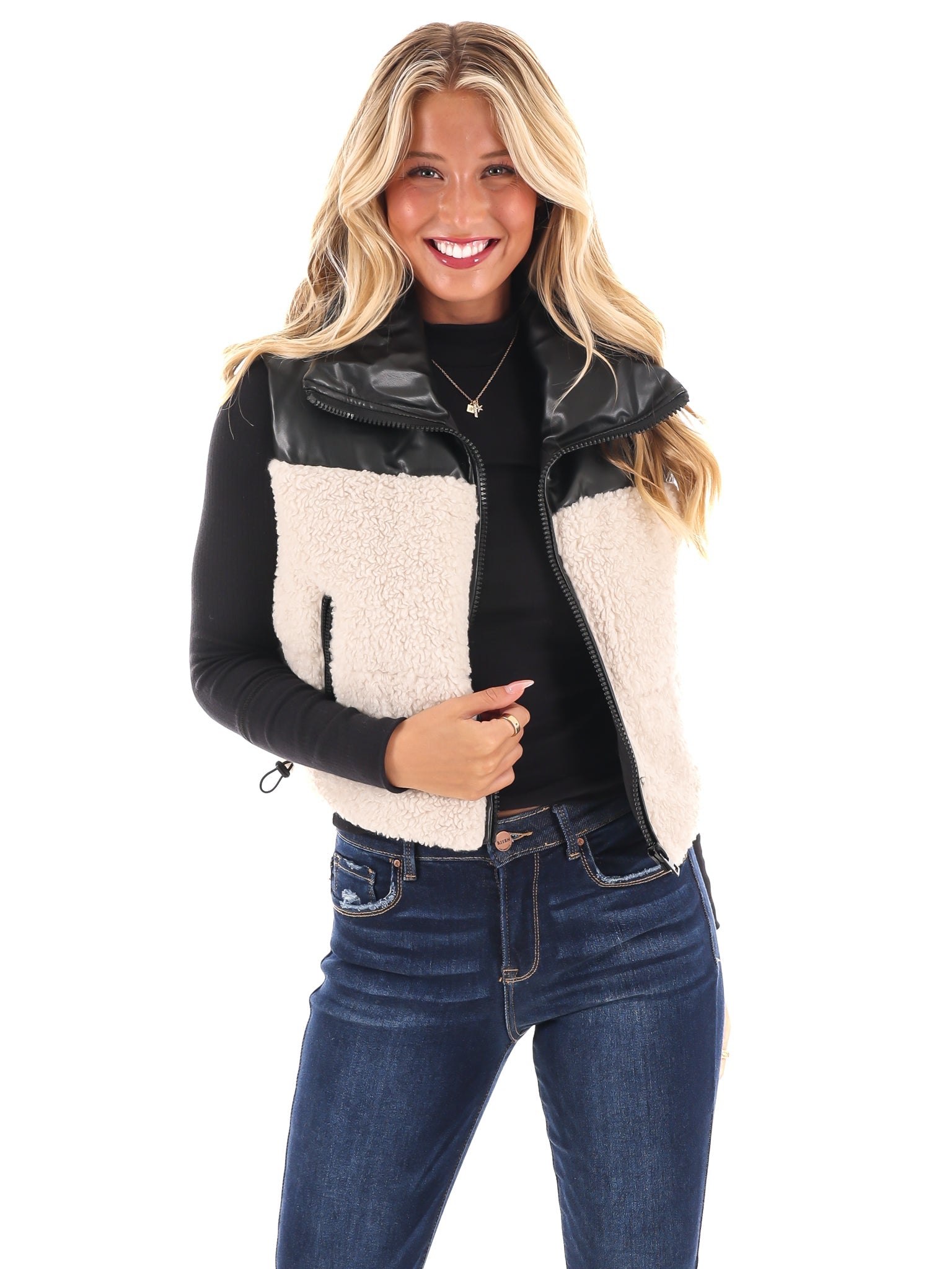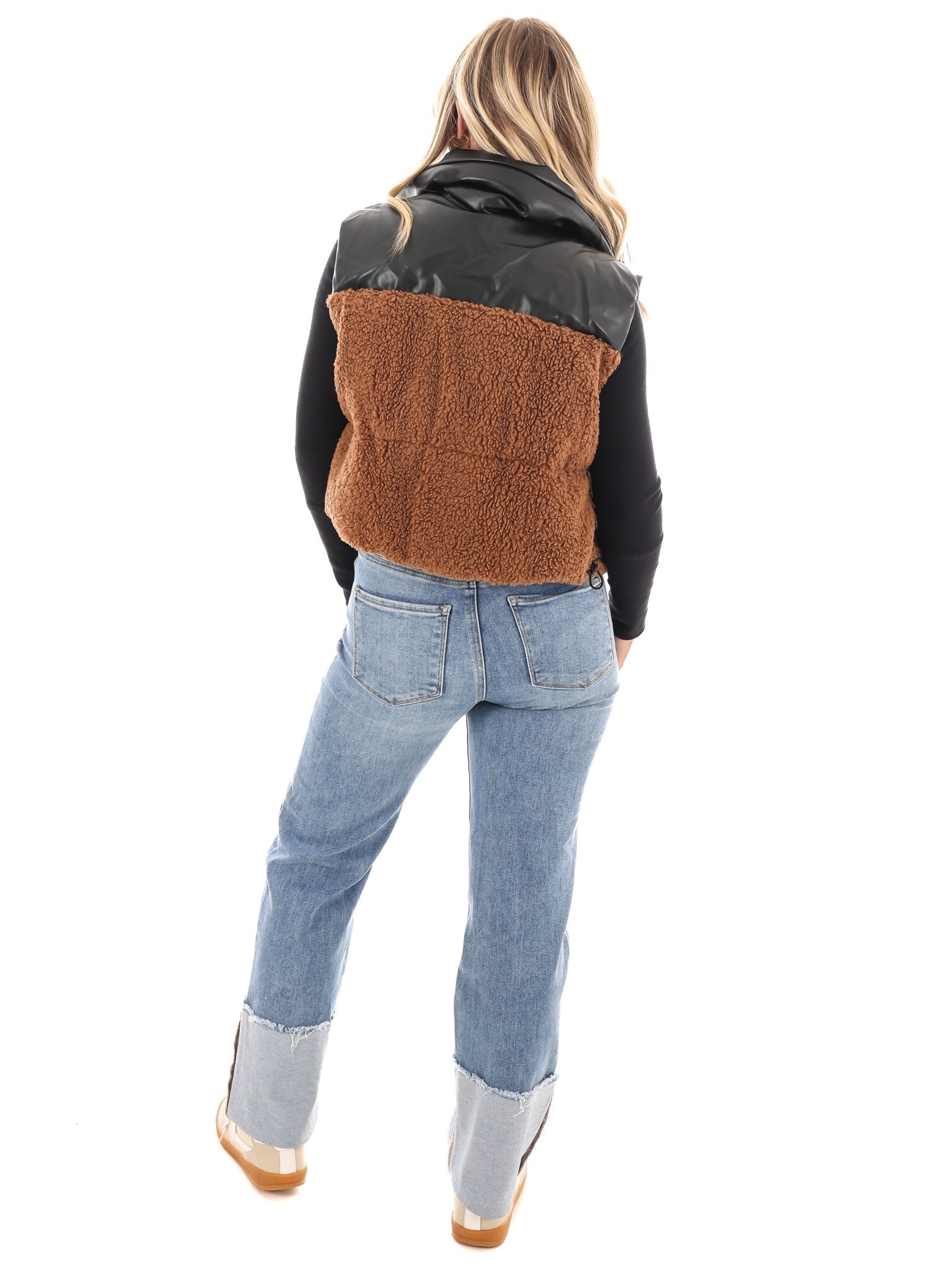 Add a touch of chic warmth and style to your wardrobe with the Mountain Edge Puffer Vest. Made from contrasting PU and sherpa, this vest features an oversized collar, front zipper closure, and side slit pockets. Stay cozy and effortlessly stylish in this classic silhouette.