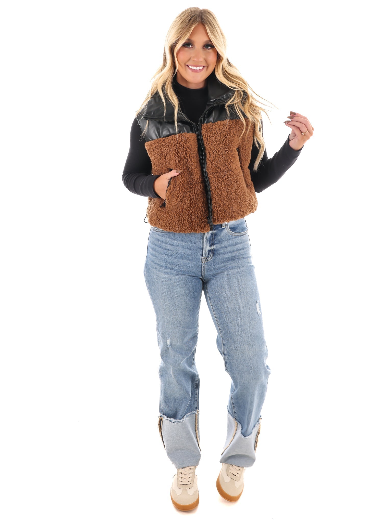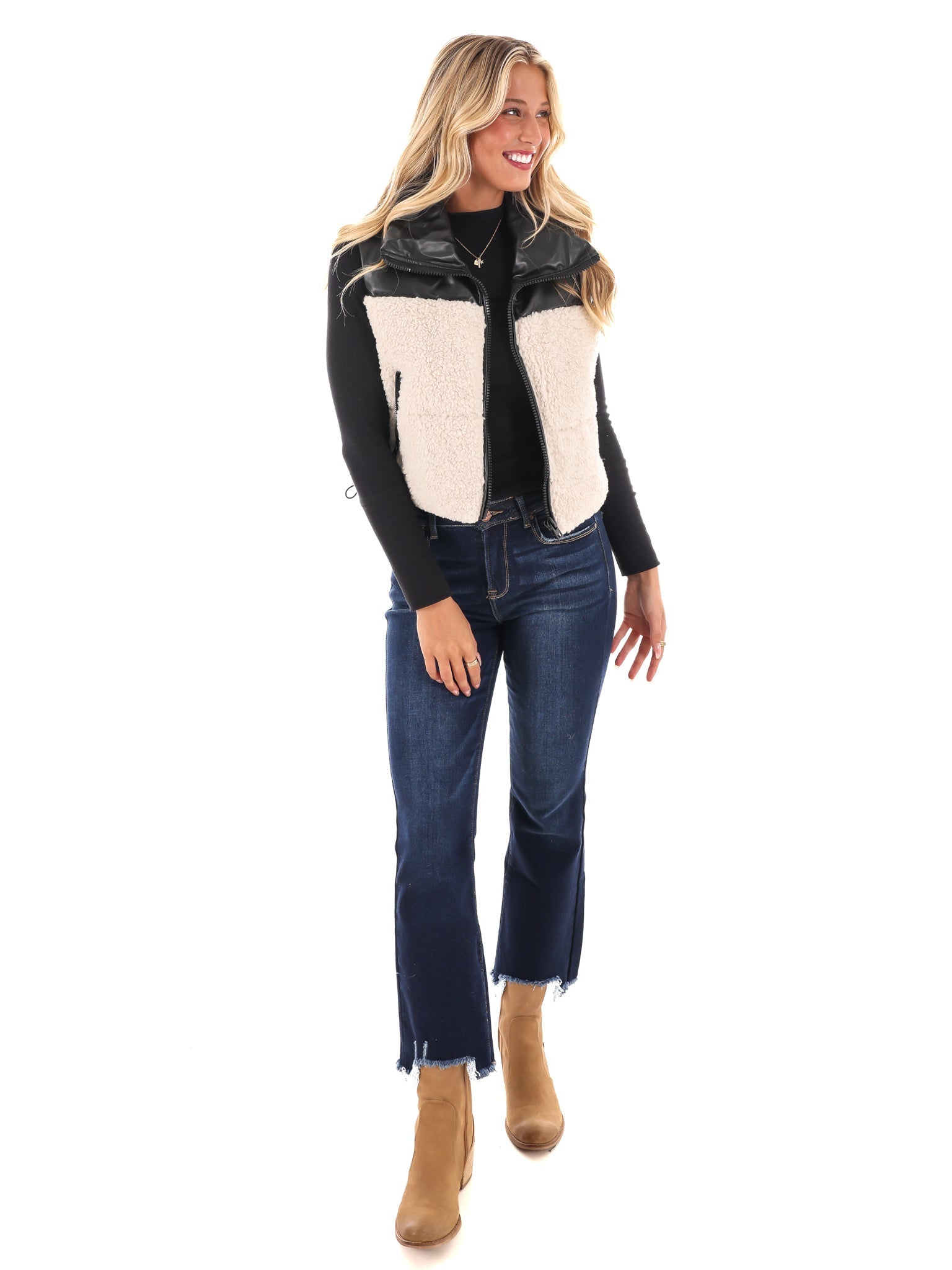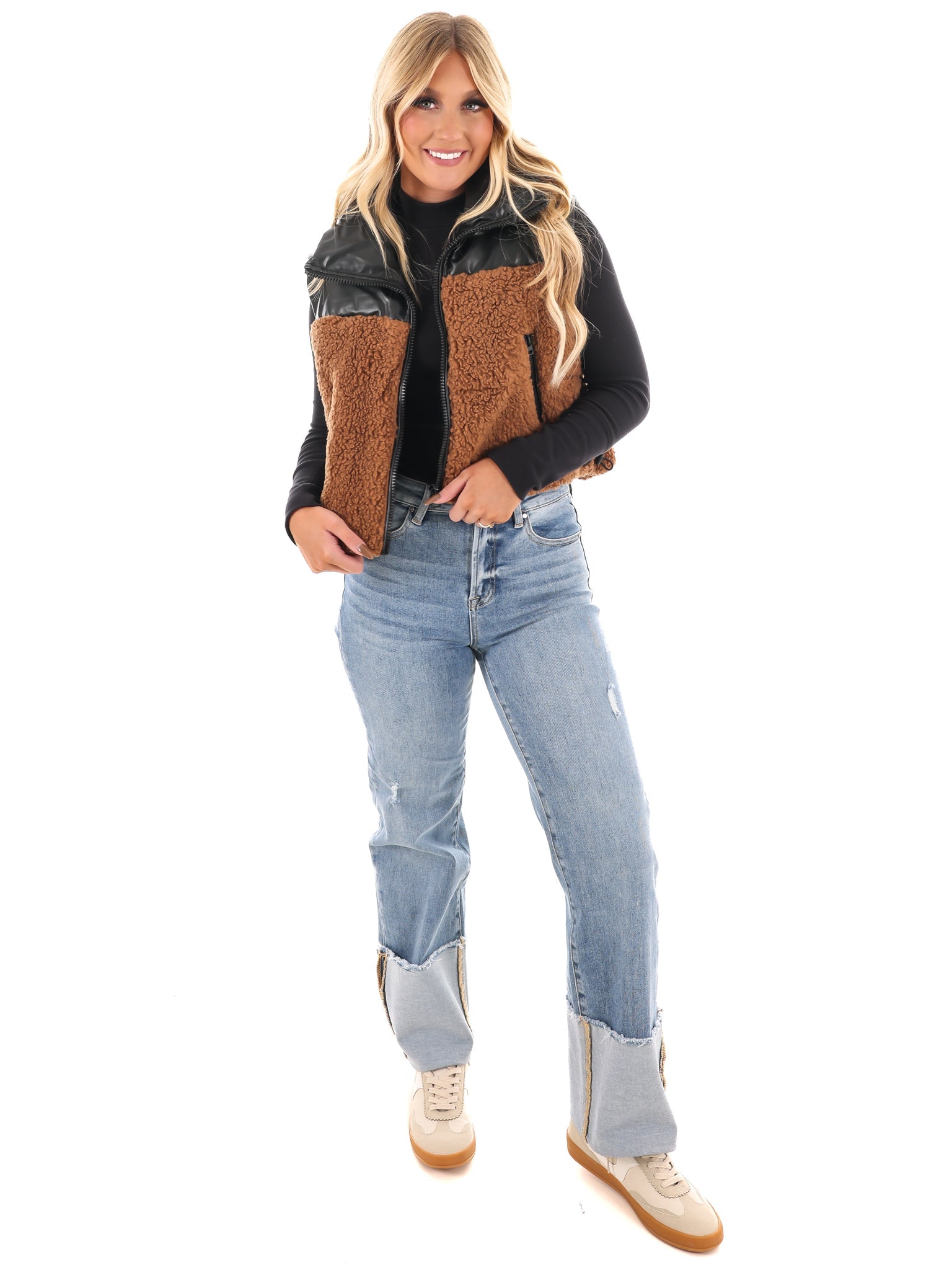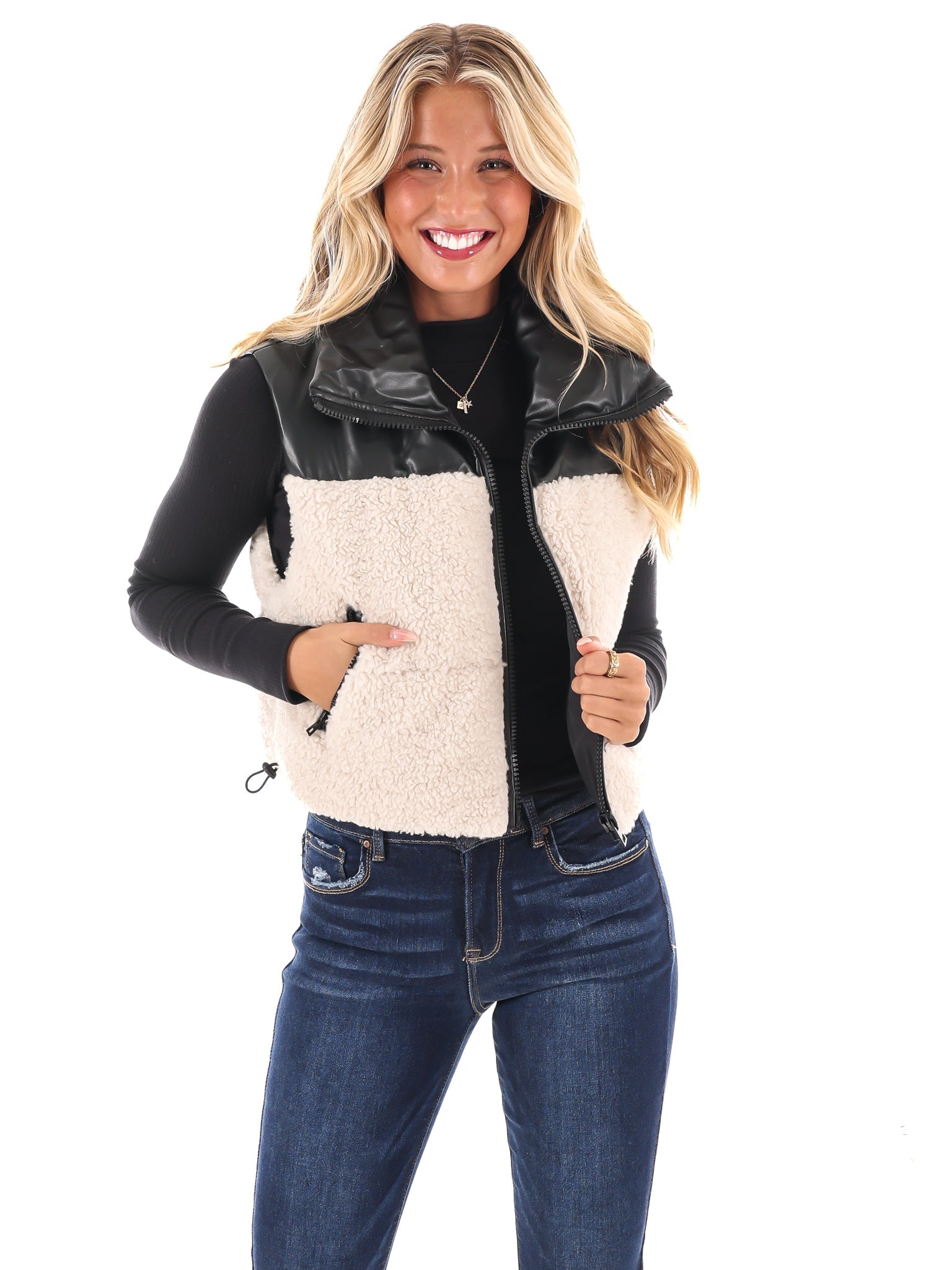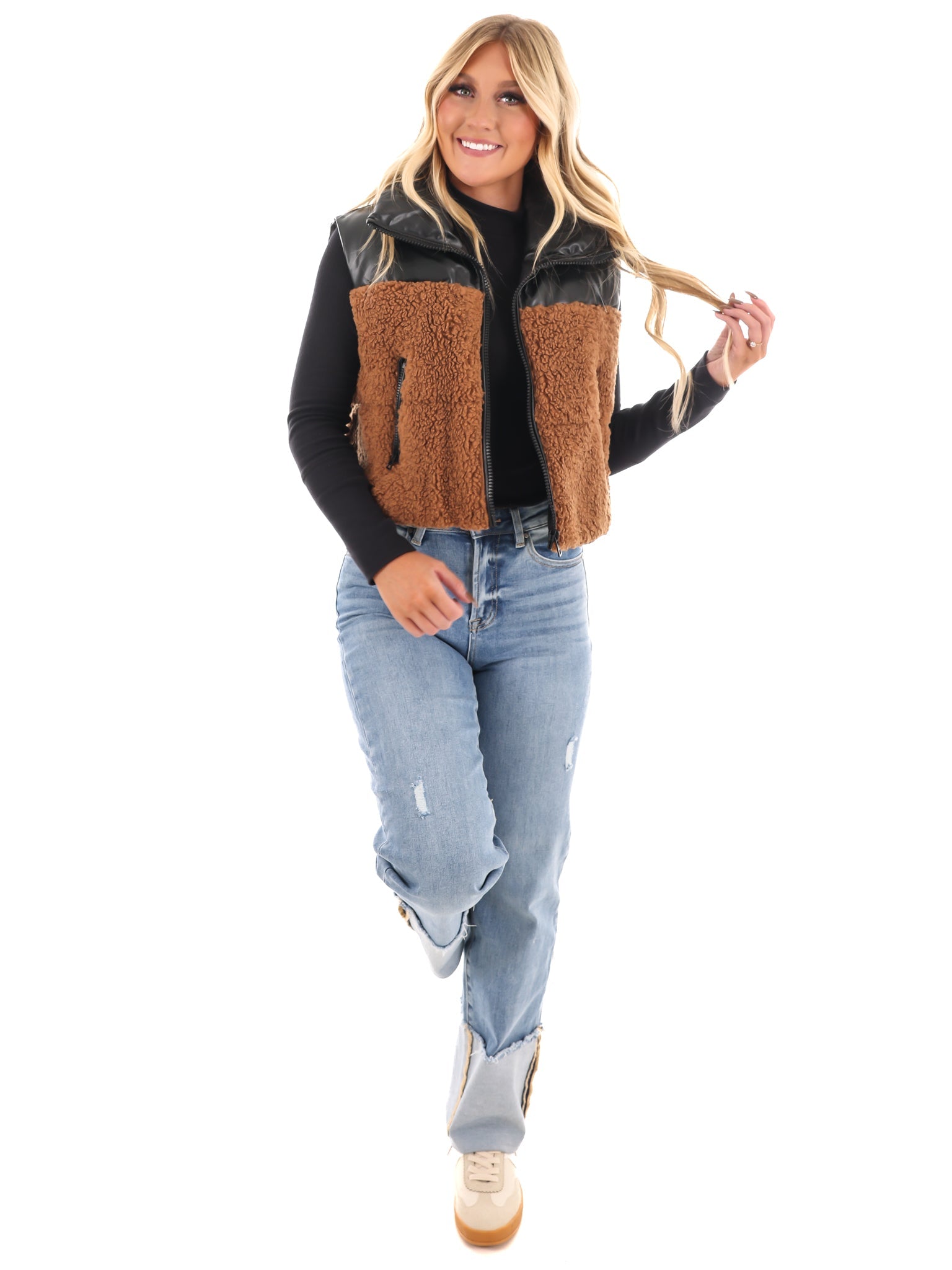 Add a touch of chic warmth and style to your wardrobe with the Mountain Edge Puffer Vest. Made from contrasting PU and sherpa, this vest features an oversized collar, front zipper closure, and side slit pockets. Stay cozy and effortlessly stylish in this classic silhouette.