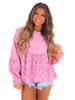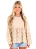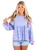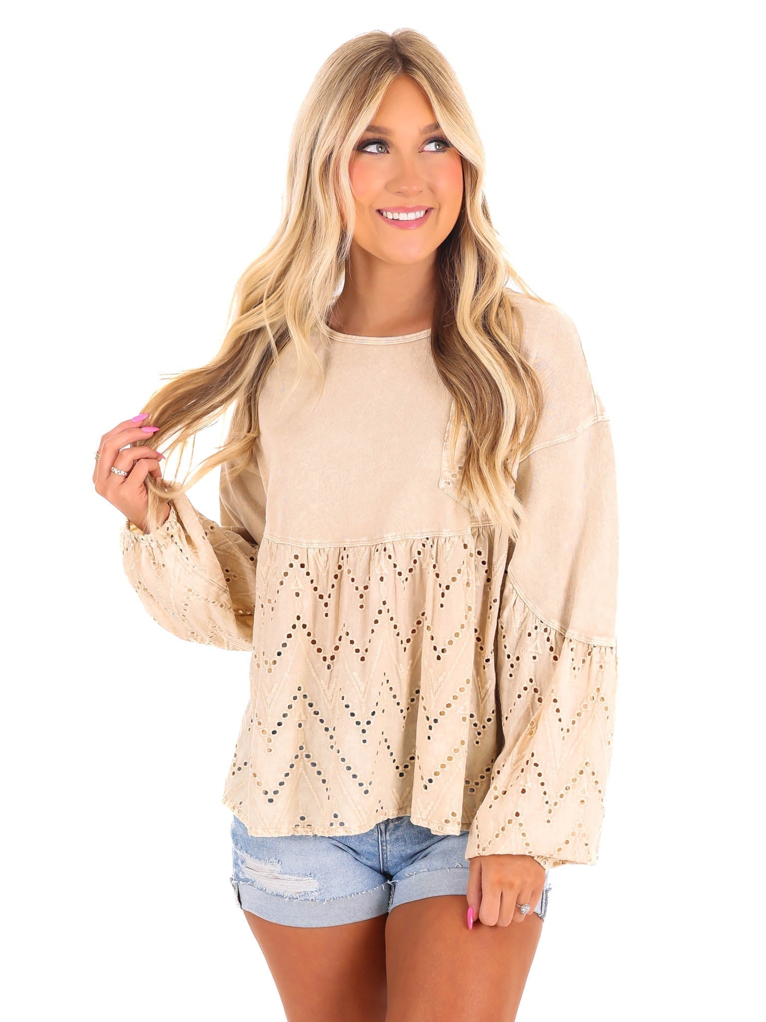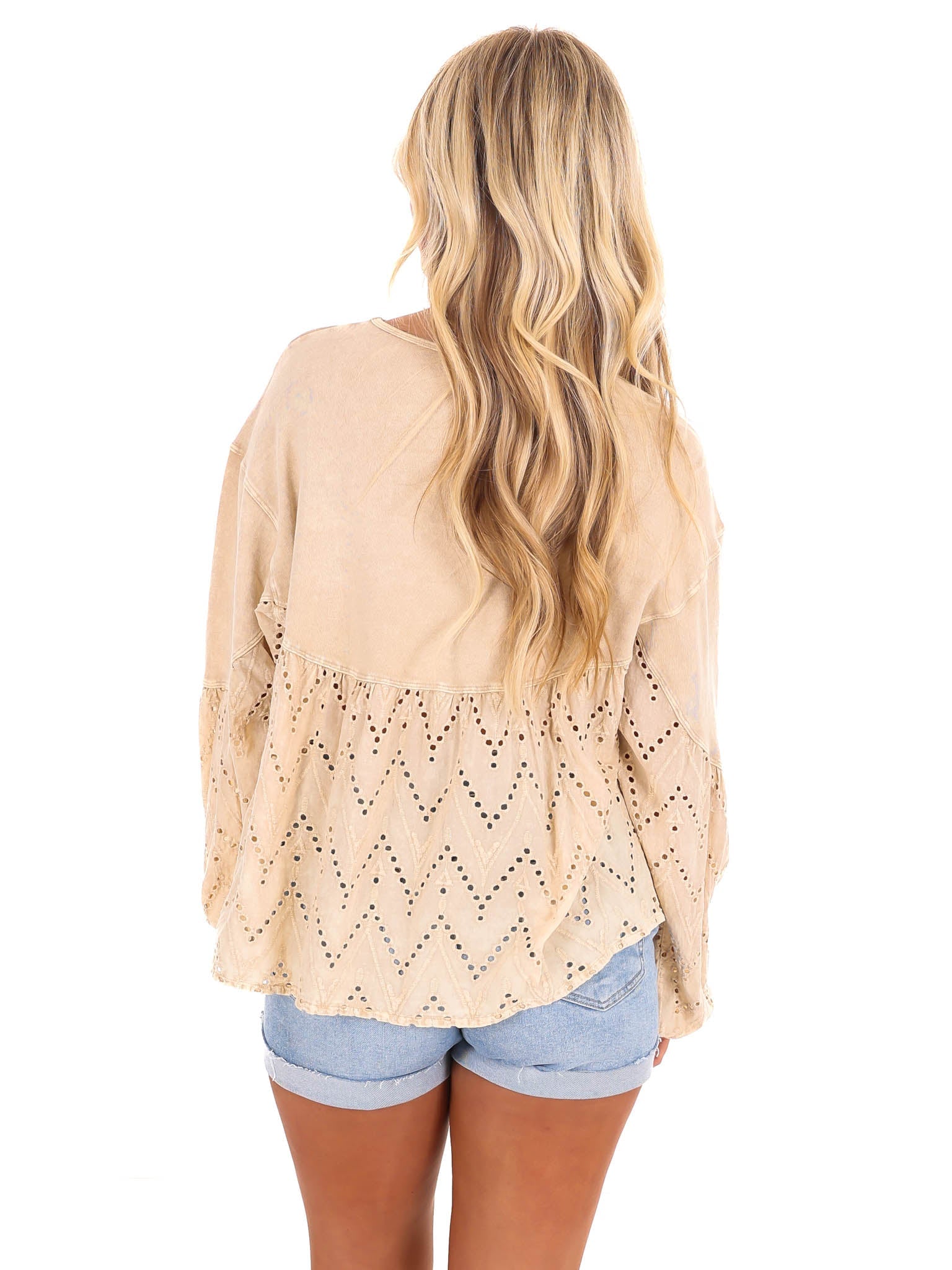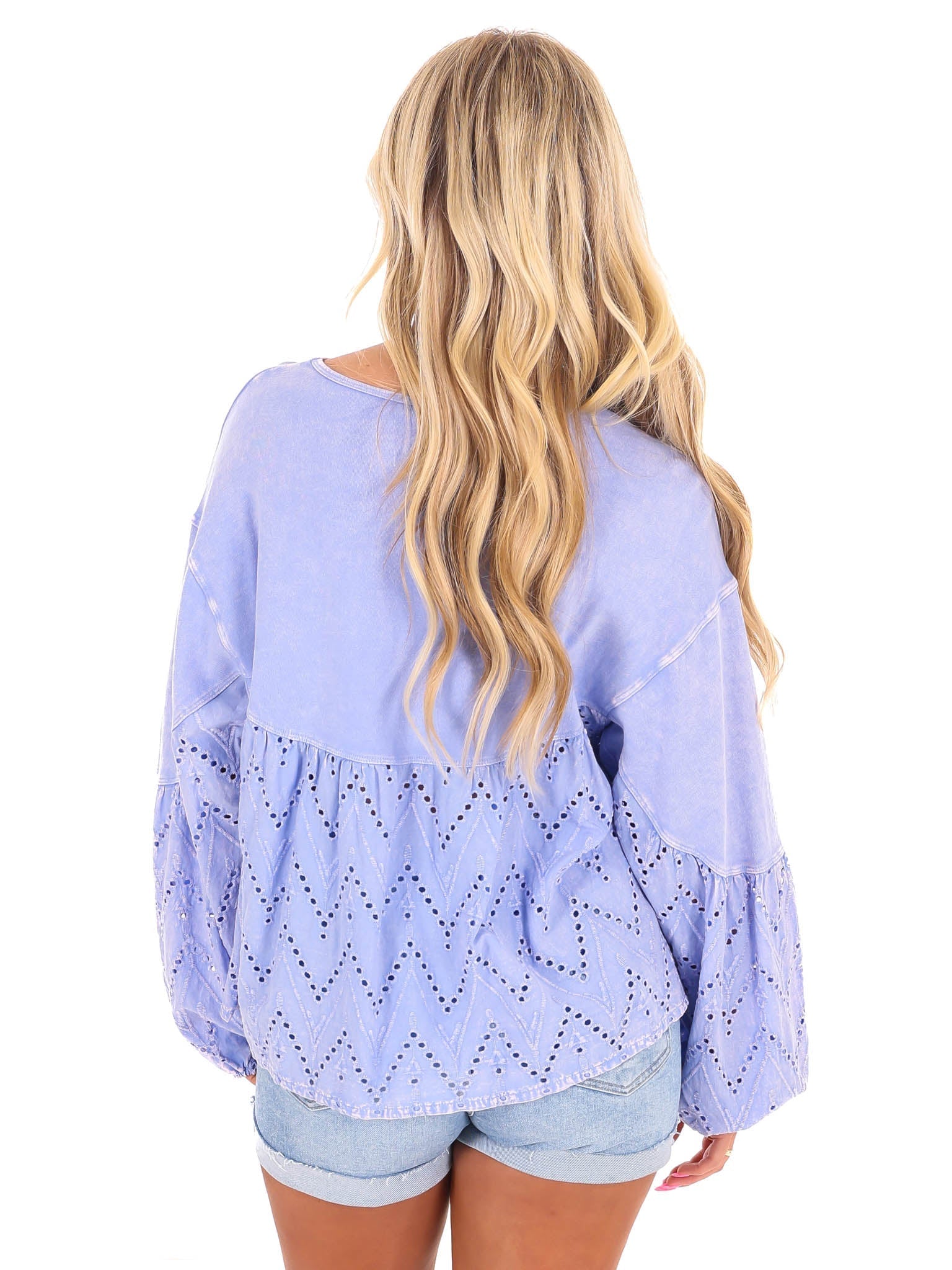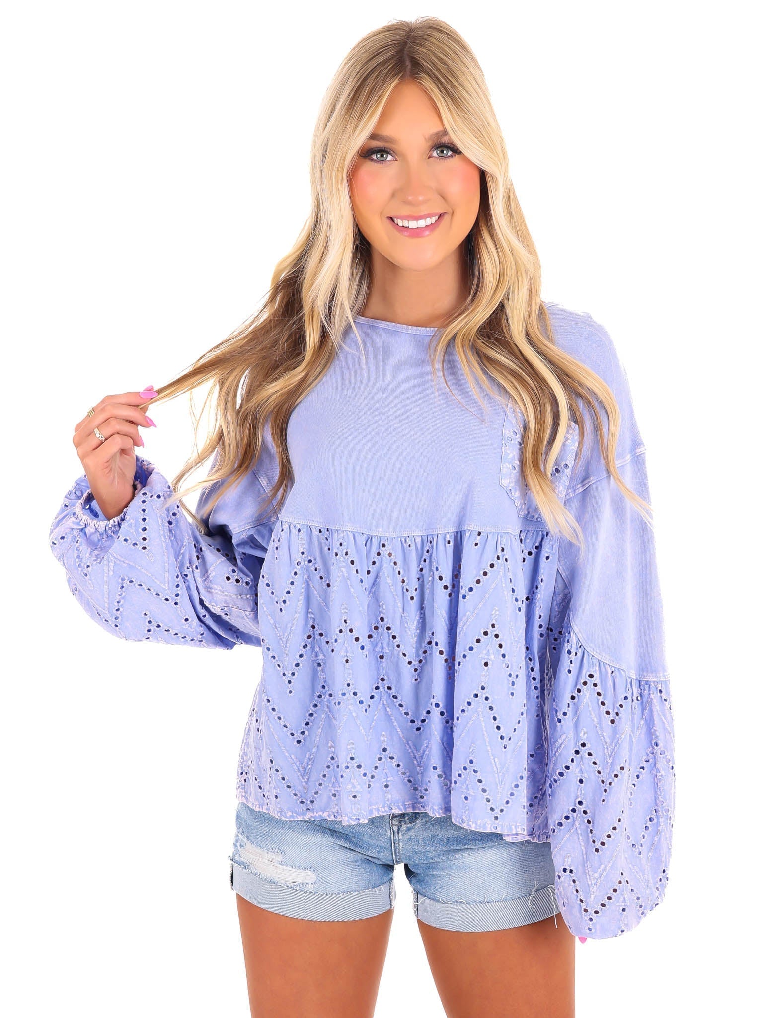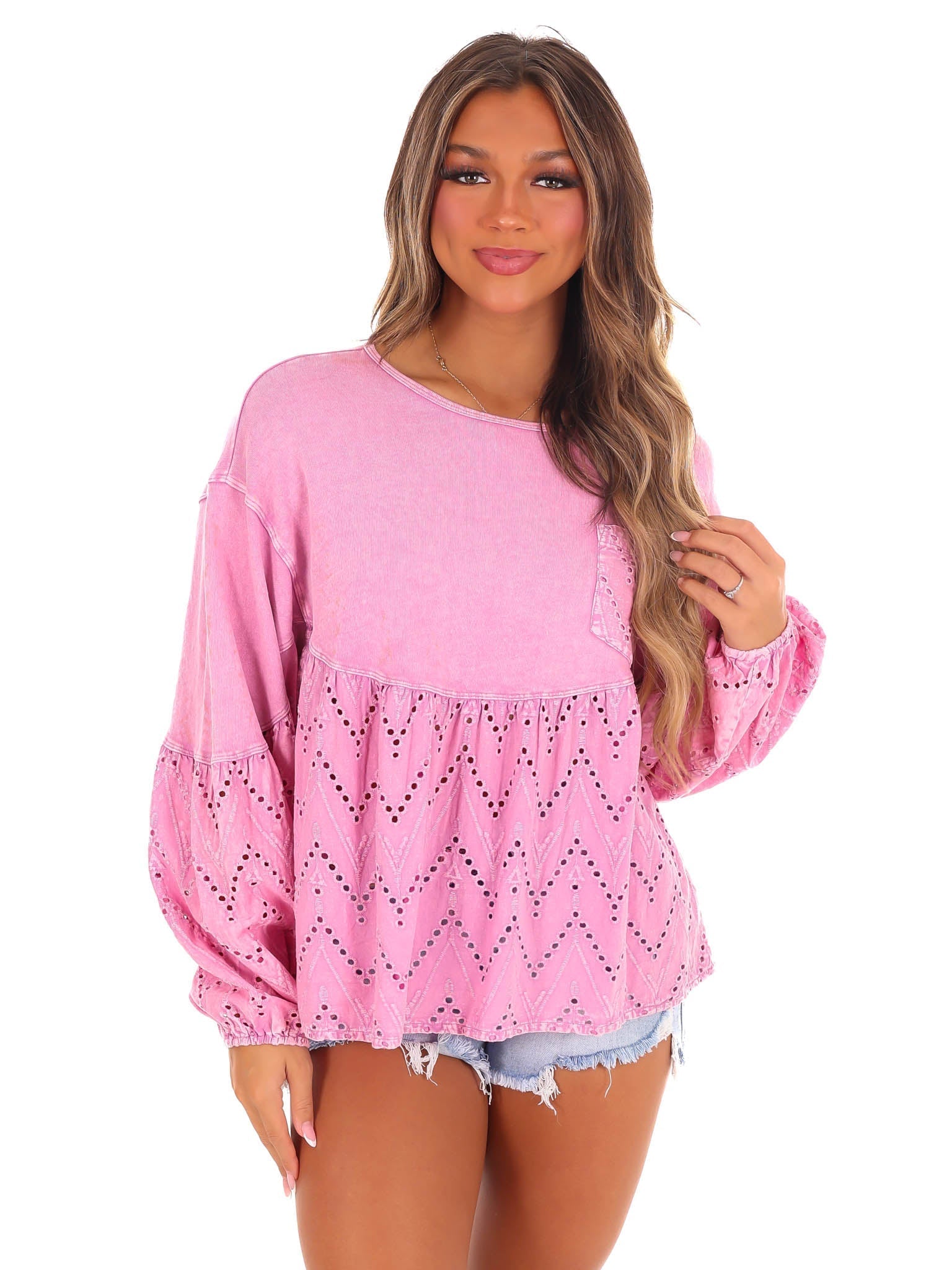 Need You Now Eyelet Babydoll Top brings the best of both worlds with eyelet lace and terry mineral wash. The rounded neckline and dropped shoulders add a comfortable touch while the lace mix bottom and chest pocket give it a playful edge. Elastic cuffs and a loose fit make it a relaxed addition to your wardrobe.
