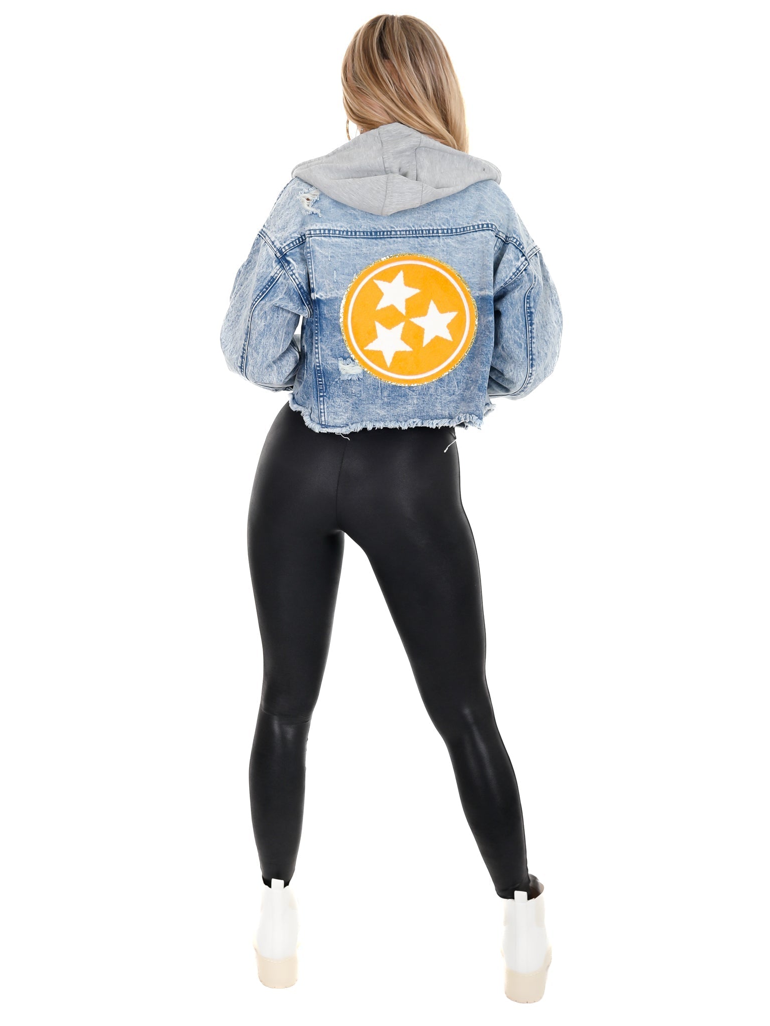 Orange Tri-Star Cropped Denim Hoodie Jacket