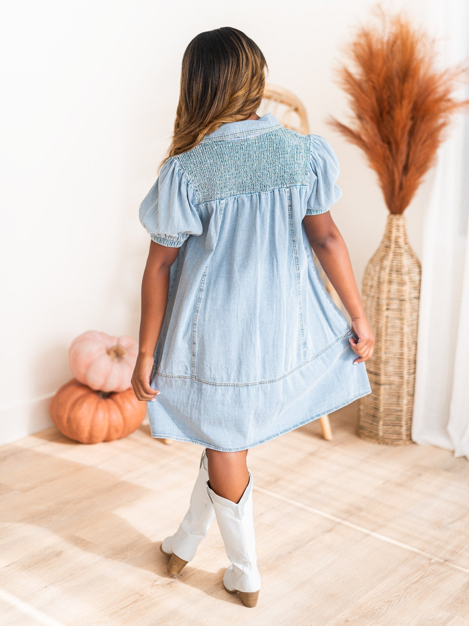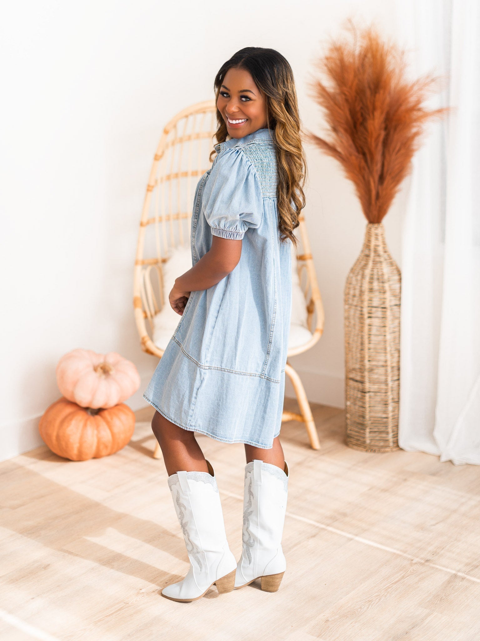 Let 'em know you mean business in the Out of Love Denim Mini Dress. Crafted from top-shelf denim and featuring smocking at the shoulders for an elevated look, this dress is sure to turn heads - no love lost!