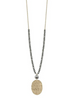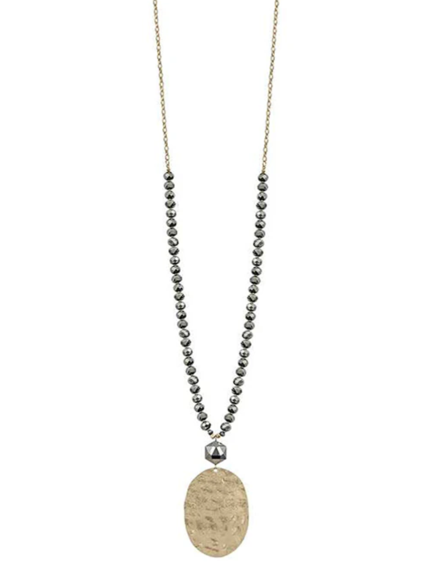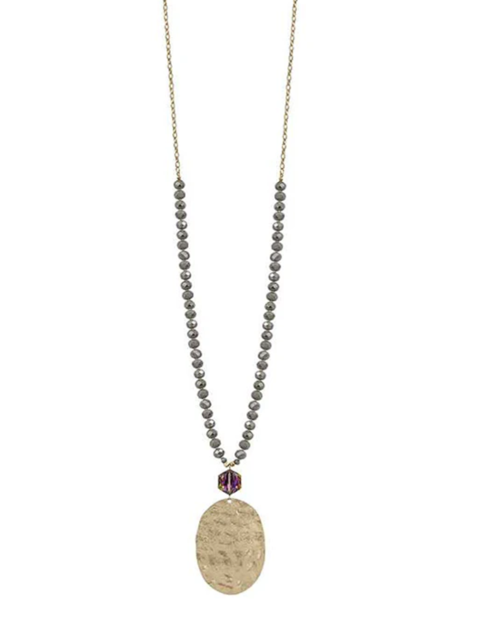 Rock this Oval Hammered Metal Necklace and make a statement! The unique hammered texture and beaded accents add a touch of personality to any outfit. Perfect for dressing up or down, this long necklace will be your new go-to accessory.