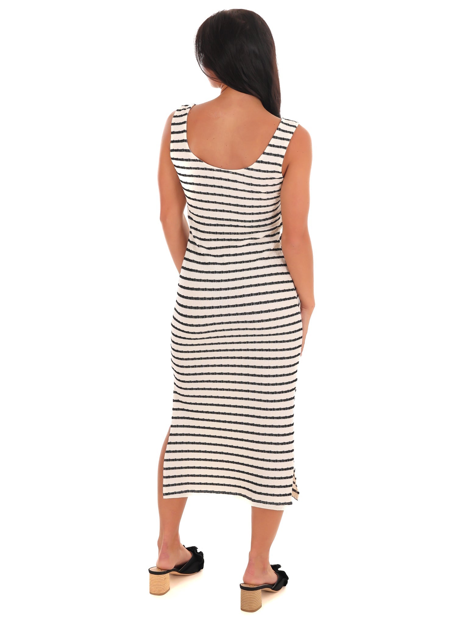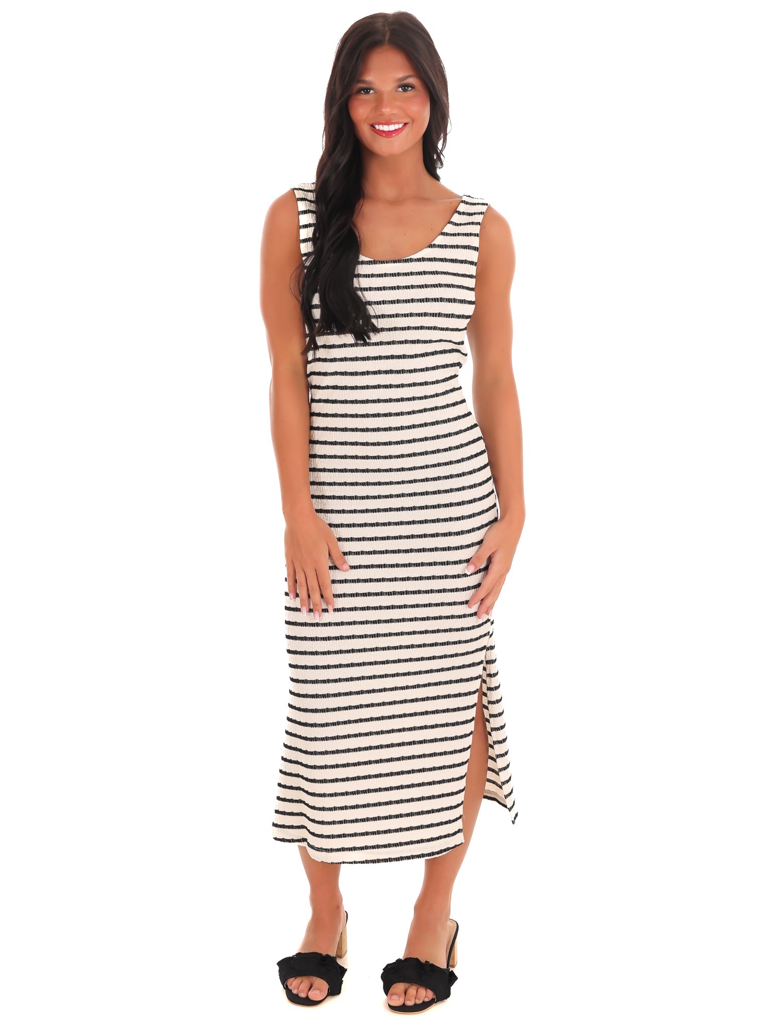 Unleash your playful side with our Part of Me Stripe Midi Dress. The textured knit fabric with a stripe print adds a unique touch while the scoop neck and sleeveless design keep you cool. Show off some leg with the side slit and rock a fun, midi length. Get ready to turn heads!