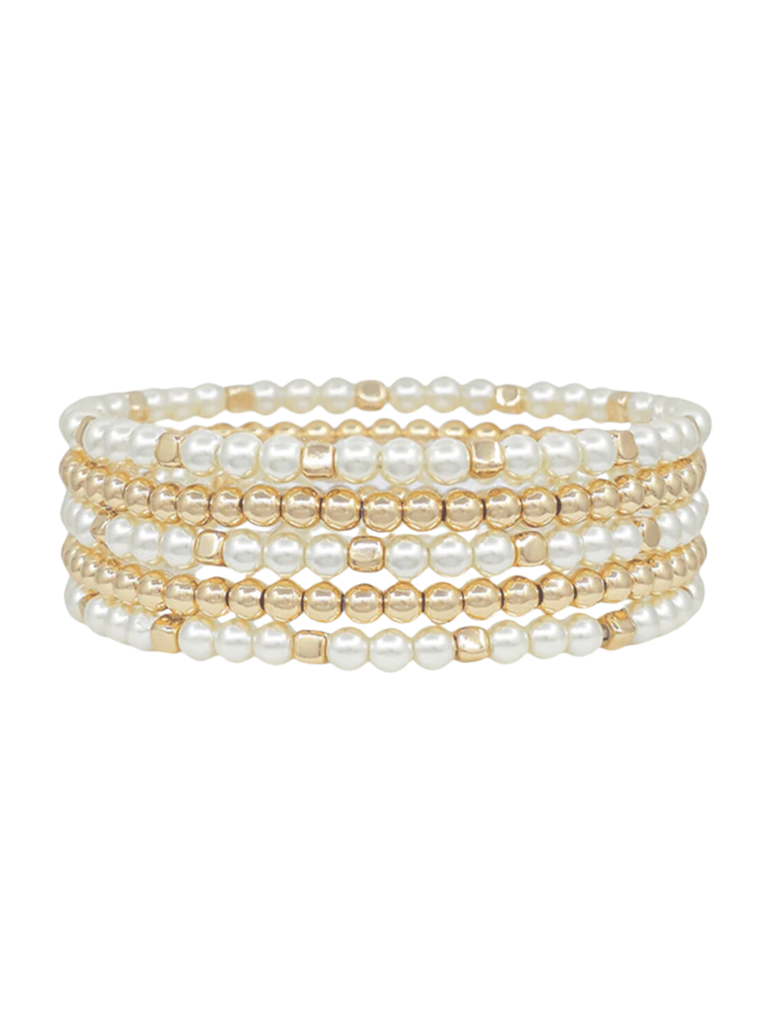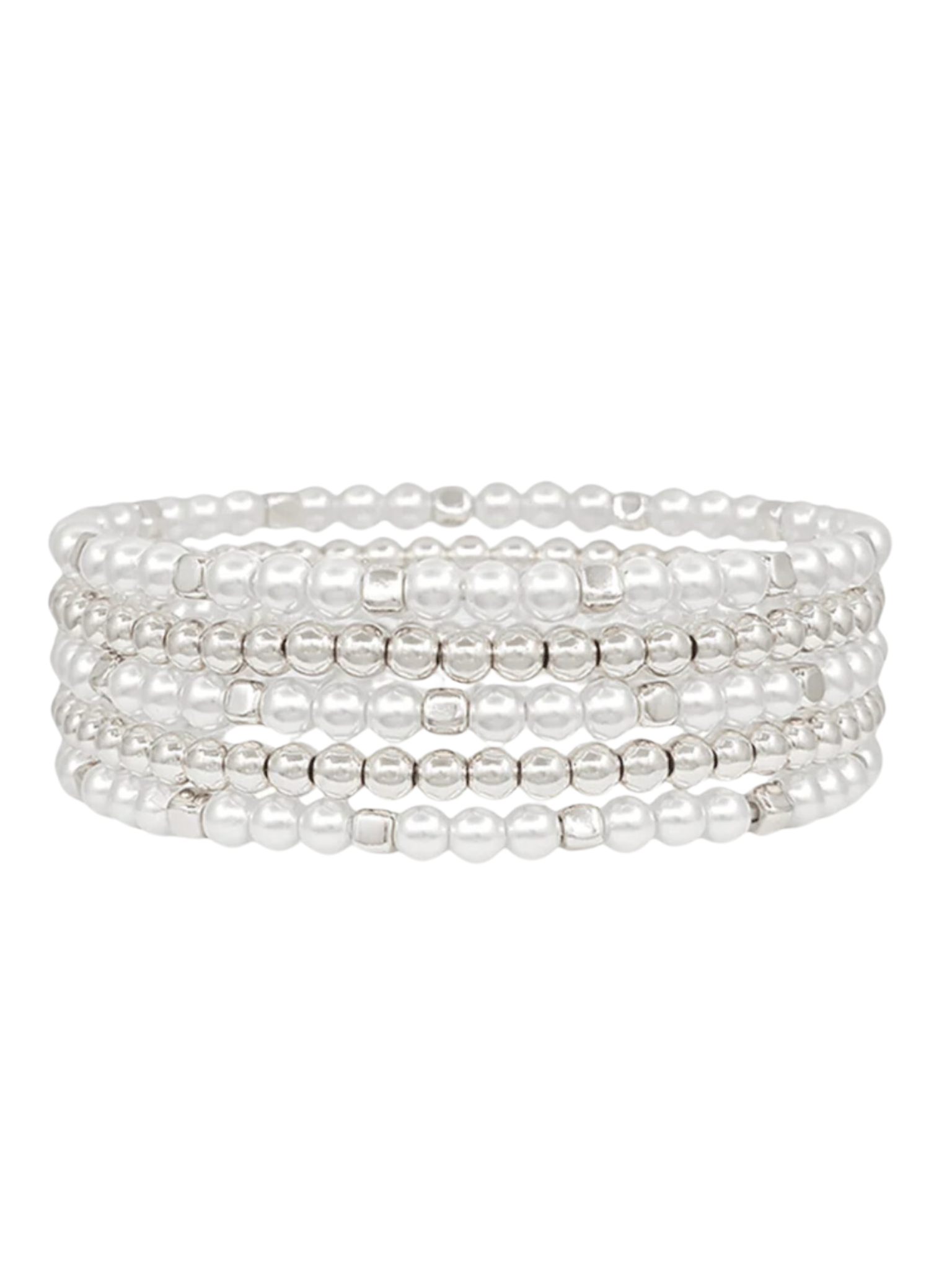 Add a touch of elegance to your outfit with our Pearl & Metal Beaded Stretch Stack Bracelet. This bracelet features a beautiful combination of pearls and metal beads, creating a unique and sophisticated look. Stretch design ensures a comfortable fit for all wrist sizes. Shine on, you beautiful pearl!