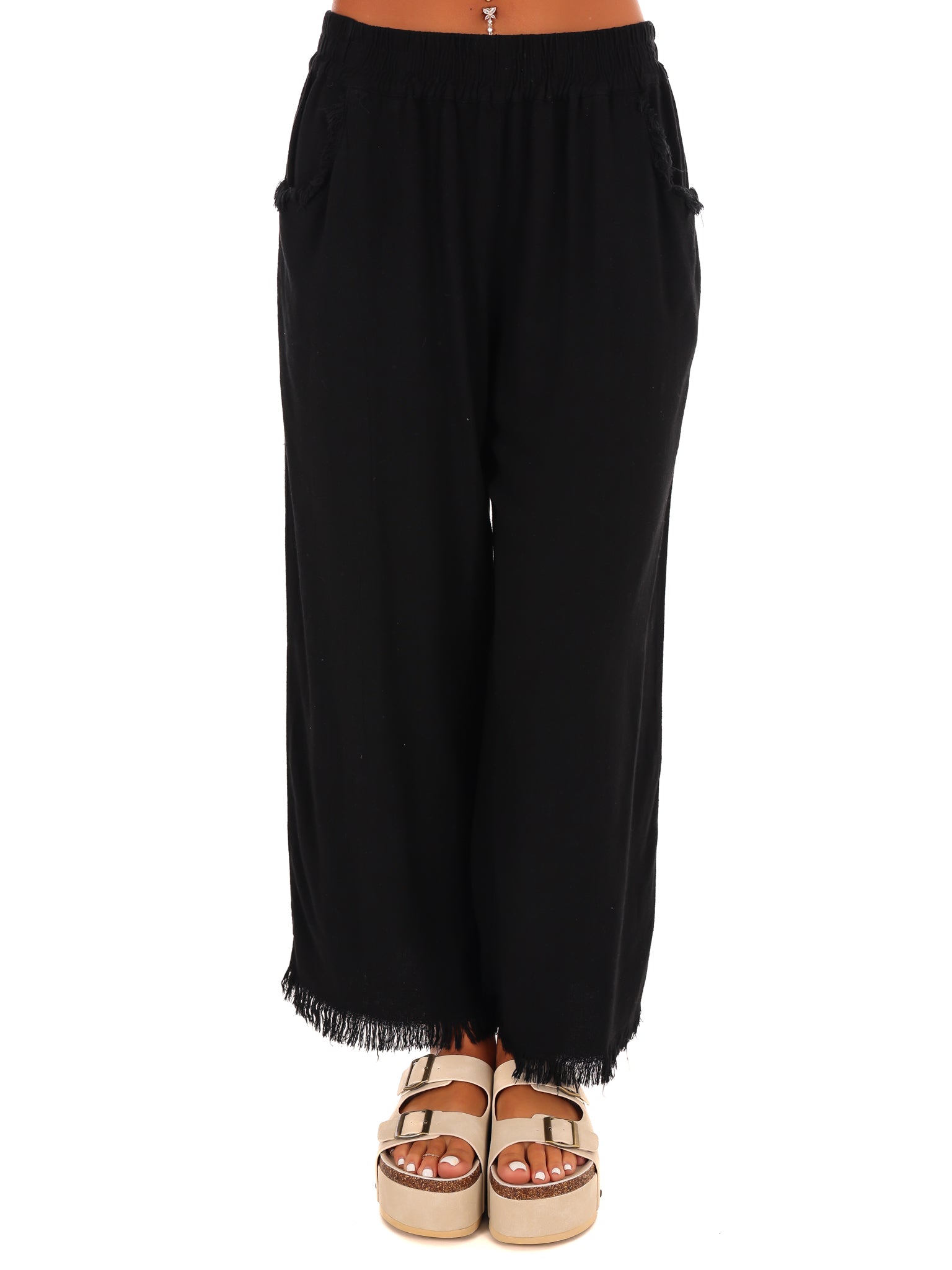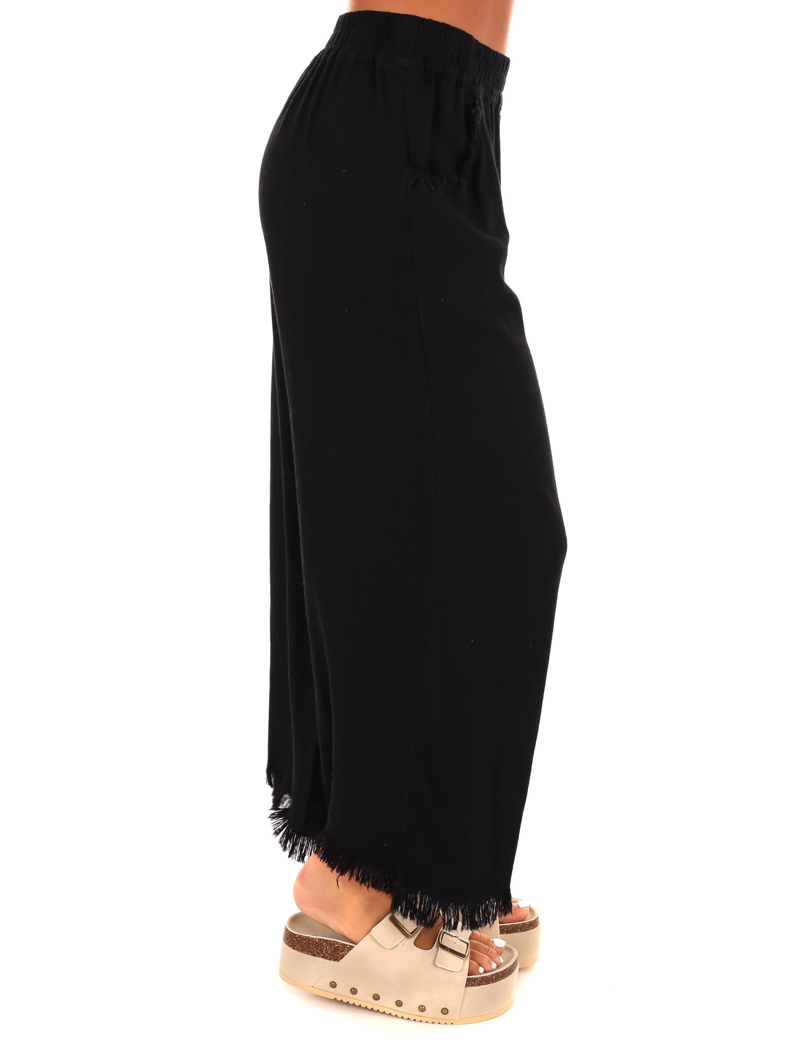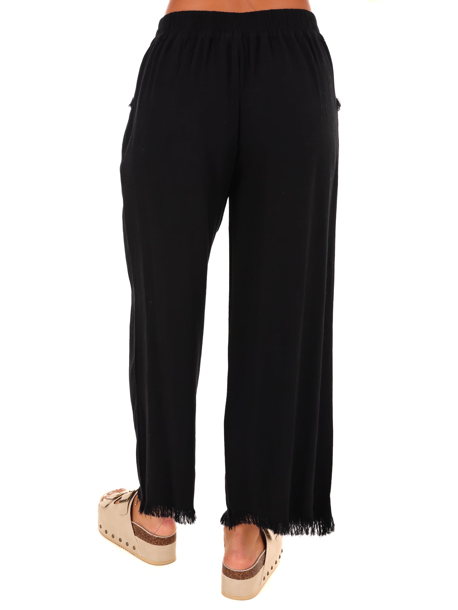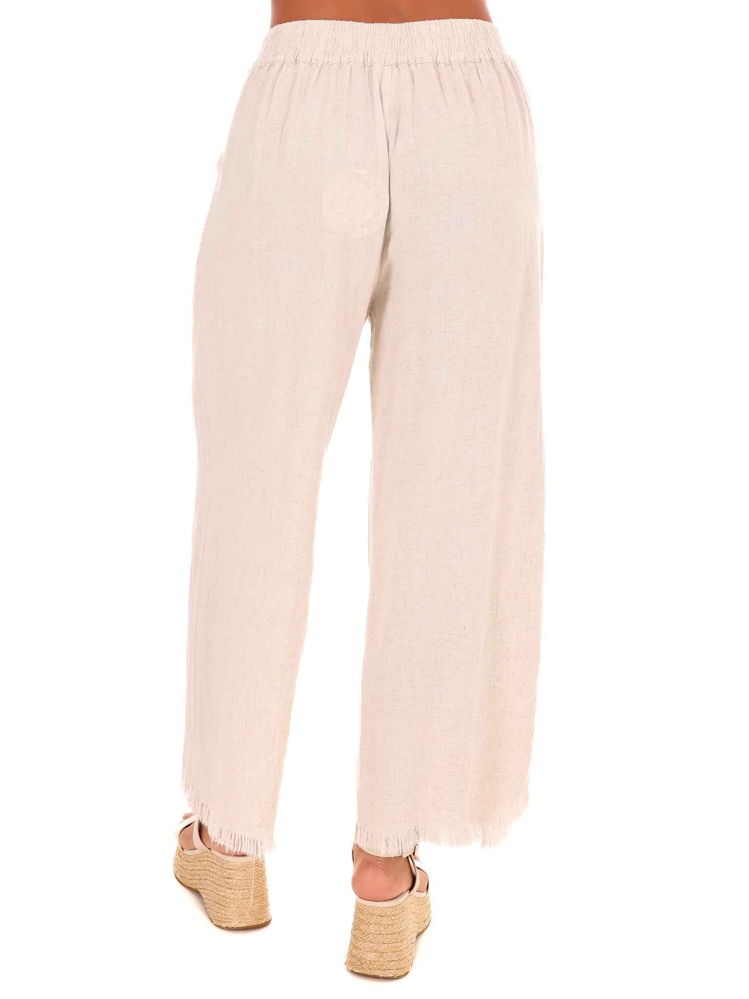 Get the perfect fit with our linen blend wide leg pants! The elastic waistband ensures comfort while the wide leg and frayed hemline add a touch of style. Say goodbye to uncomfortable pants and hello to effortless cool.