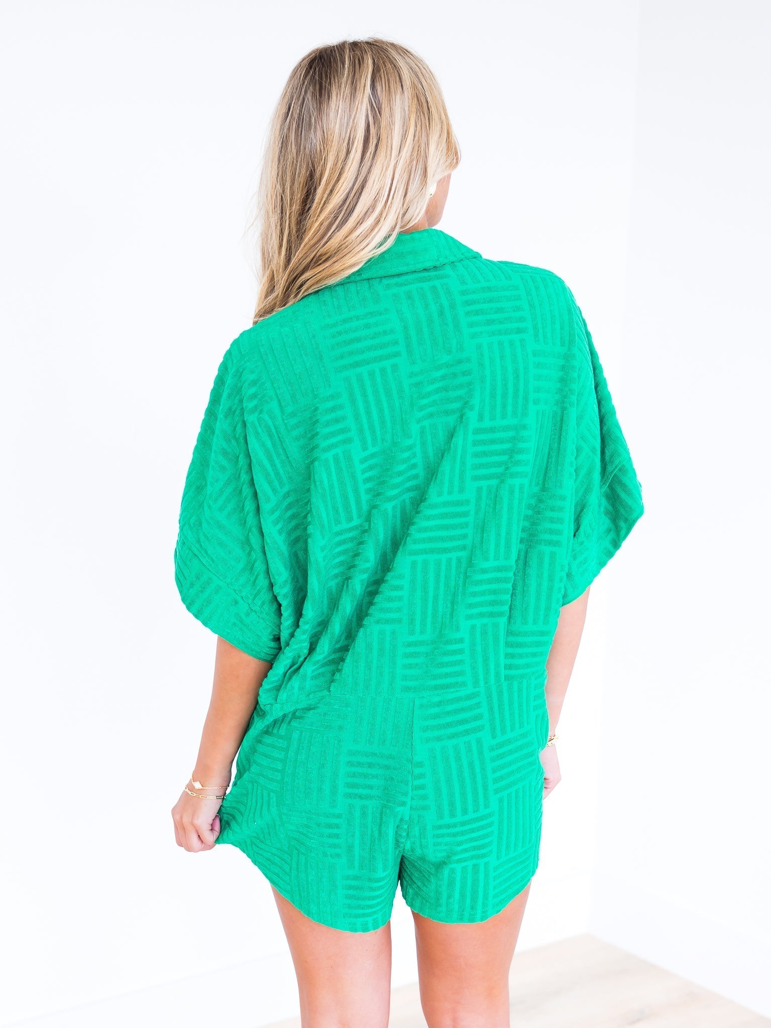 Get ready to rock the summer with our Perfect for Me Textured Romper! This short sleeve romper features a textured terry fabric, collared neckline, and hidden button closure for a unique and playful look. Plus, it's lightweight, non-sheer, and unlined, making it perfect for any occasion. So why wait? Add it to your wardrobe today!