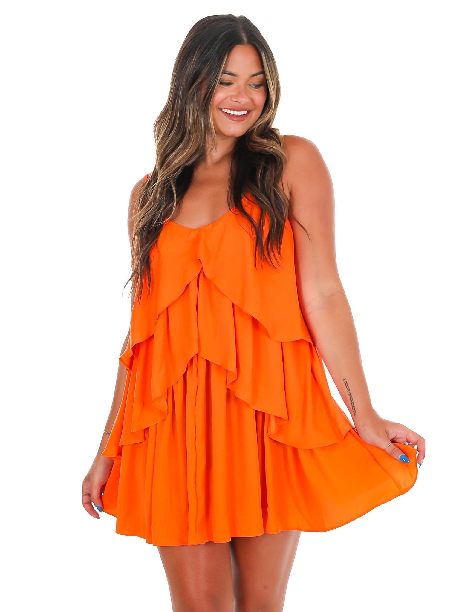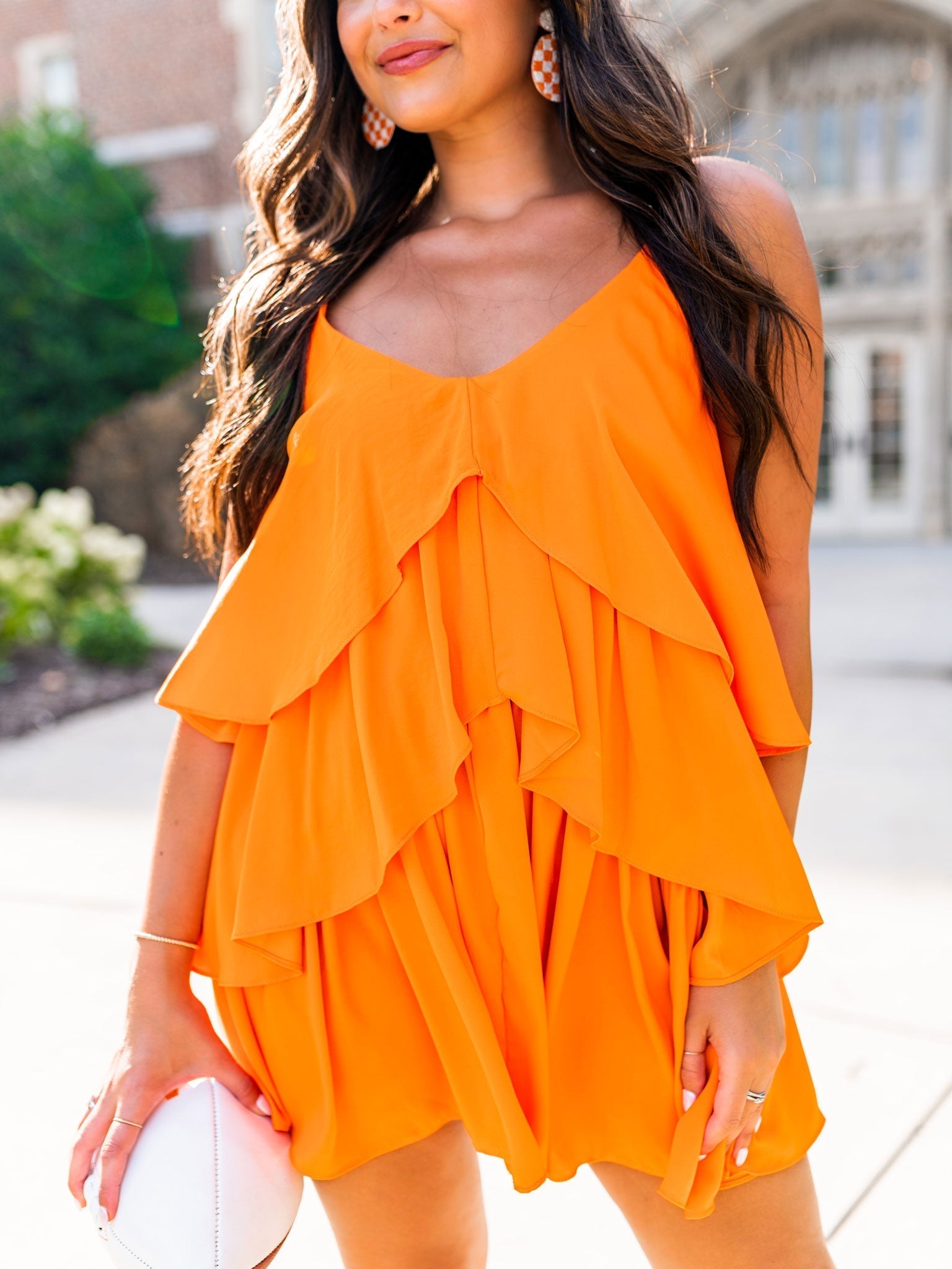 Be ready for game day with the Prepare to Dominate Mini Dress! Featuring a v-neckline, spaghetti straps, and a tiered ruffle hemline, this dress will ensure you look like a total MVP at your next Tennessee Football tailgate! Show your spirit, girl - you got this! 🏈
