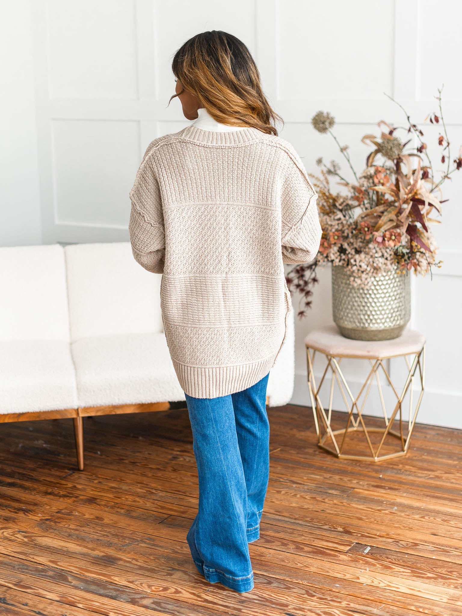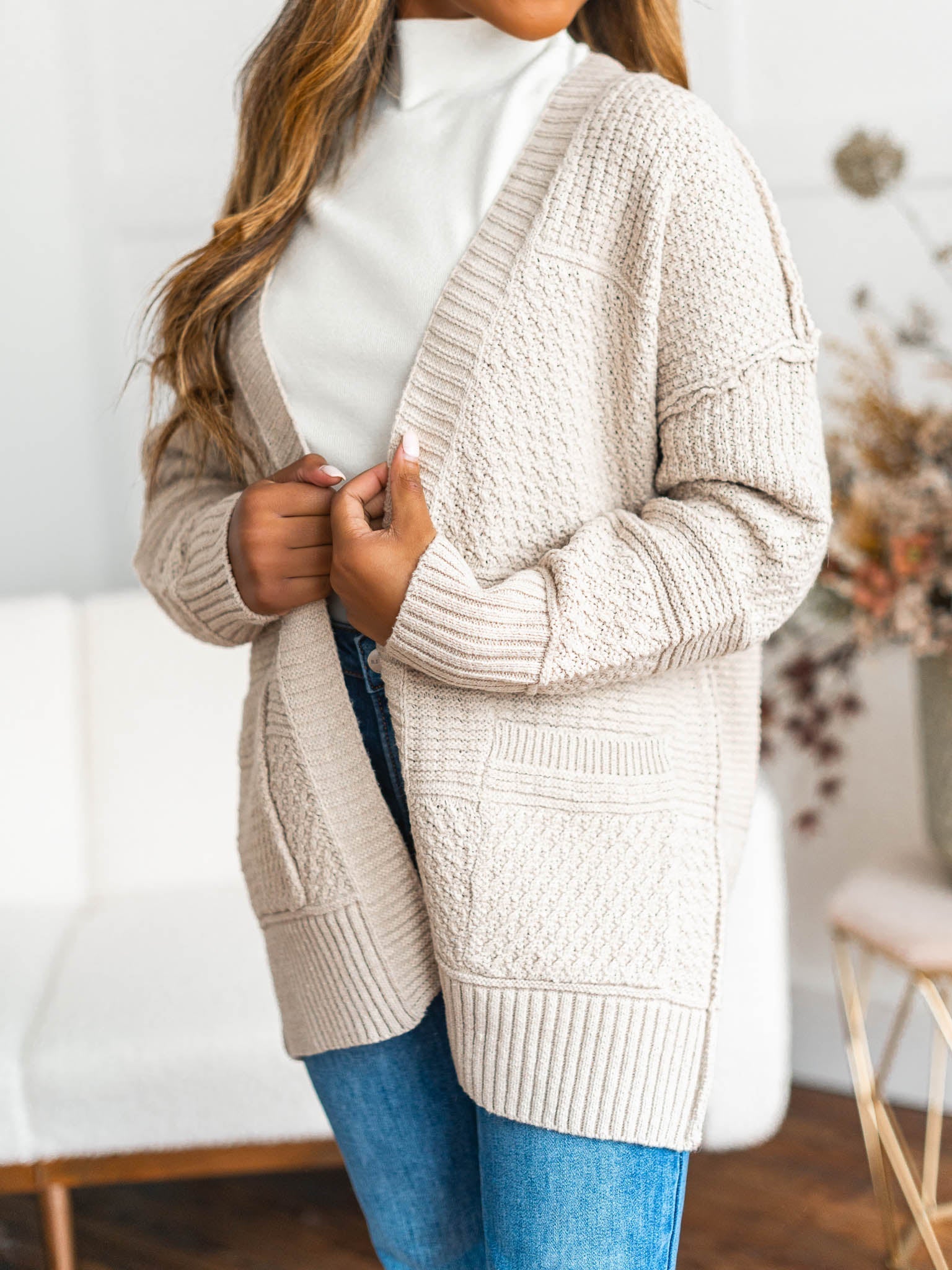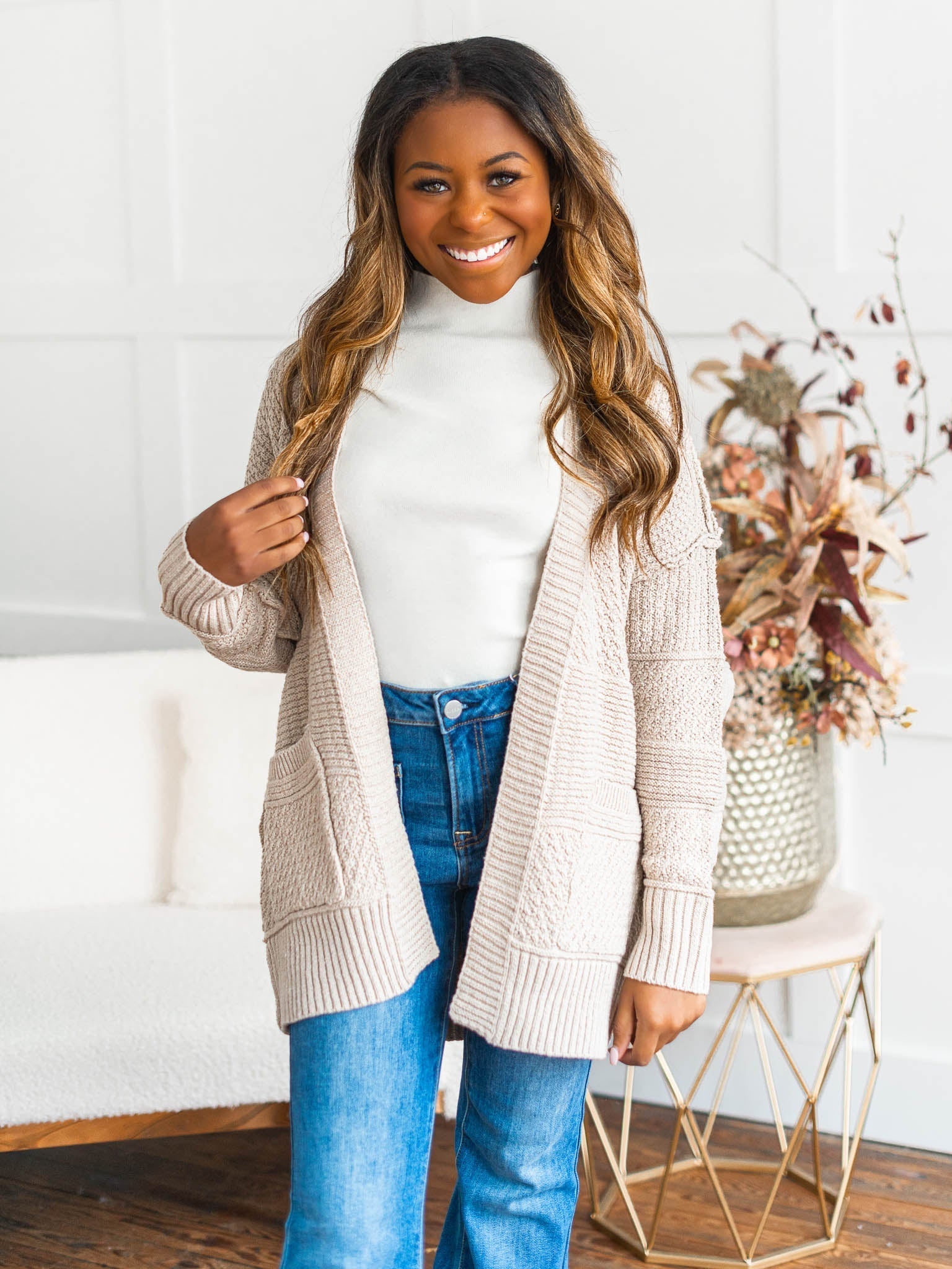 Stay cozy and fashionable with Pretty Smiles' long-sleeve knit cardigan. The tunic length, exposed seams, and ribbed cuffs and bottom band make for the perfect cool-weather accessory. The two open front pockets add detail and functionality. Look stylish and feel comfortable this season.