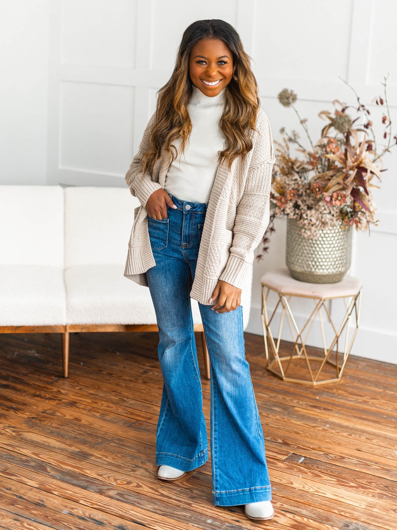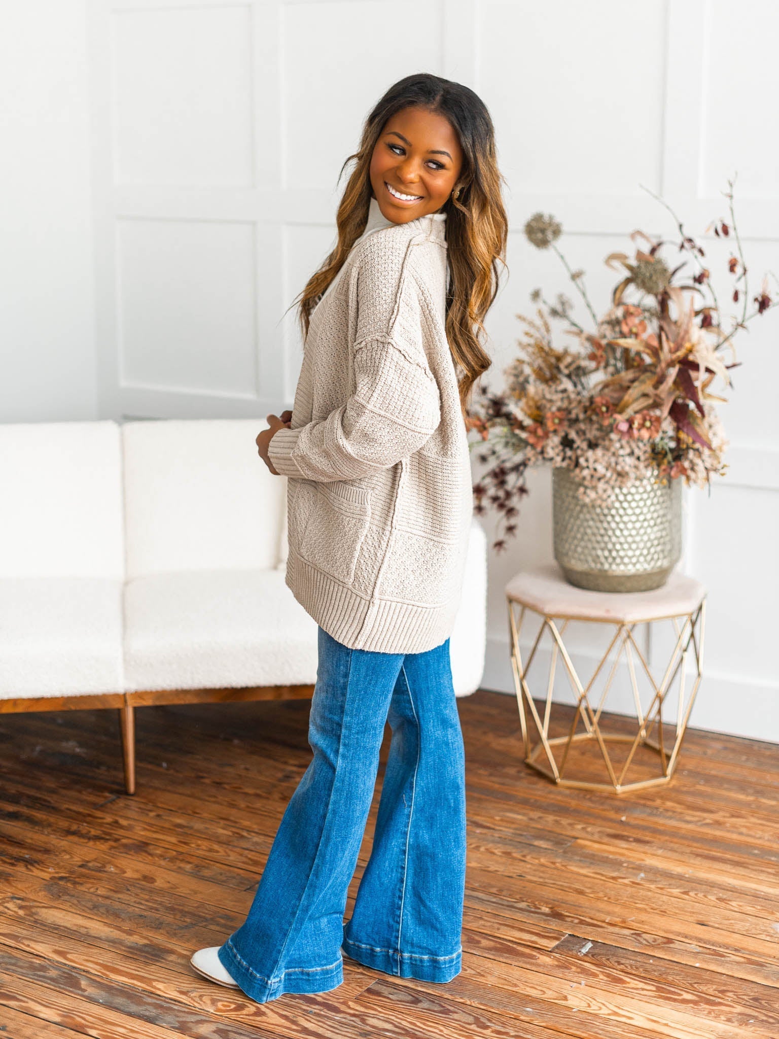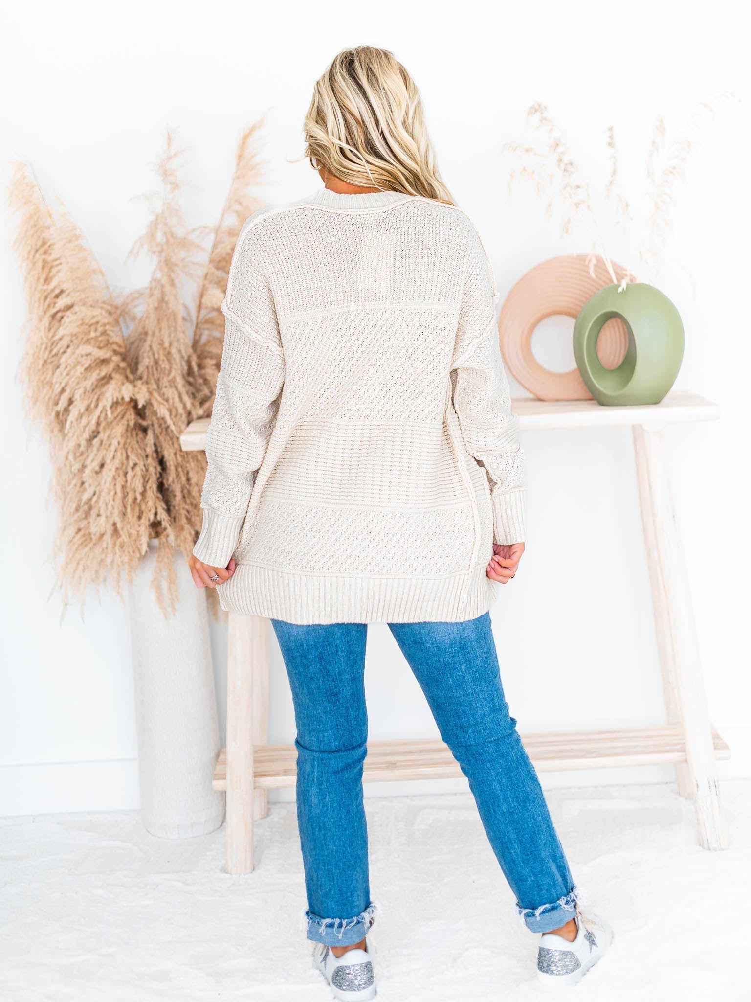 Stay cozy and fashionable with Pretty Smiles' long-sleeve knit cardigan. The tunic length, exposed seams, and ribbed cuffs and bottom band make for the perfect cool-weather accessory. The two open front pockets add detail and functionality. Look stylish and feel comfortable this season.