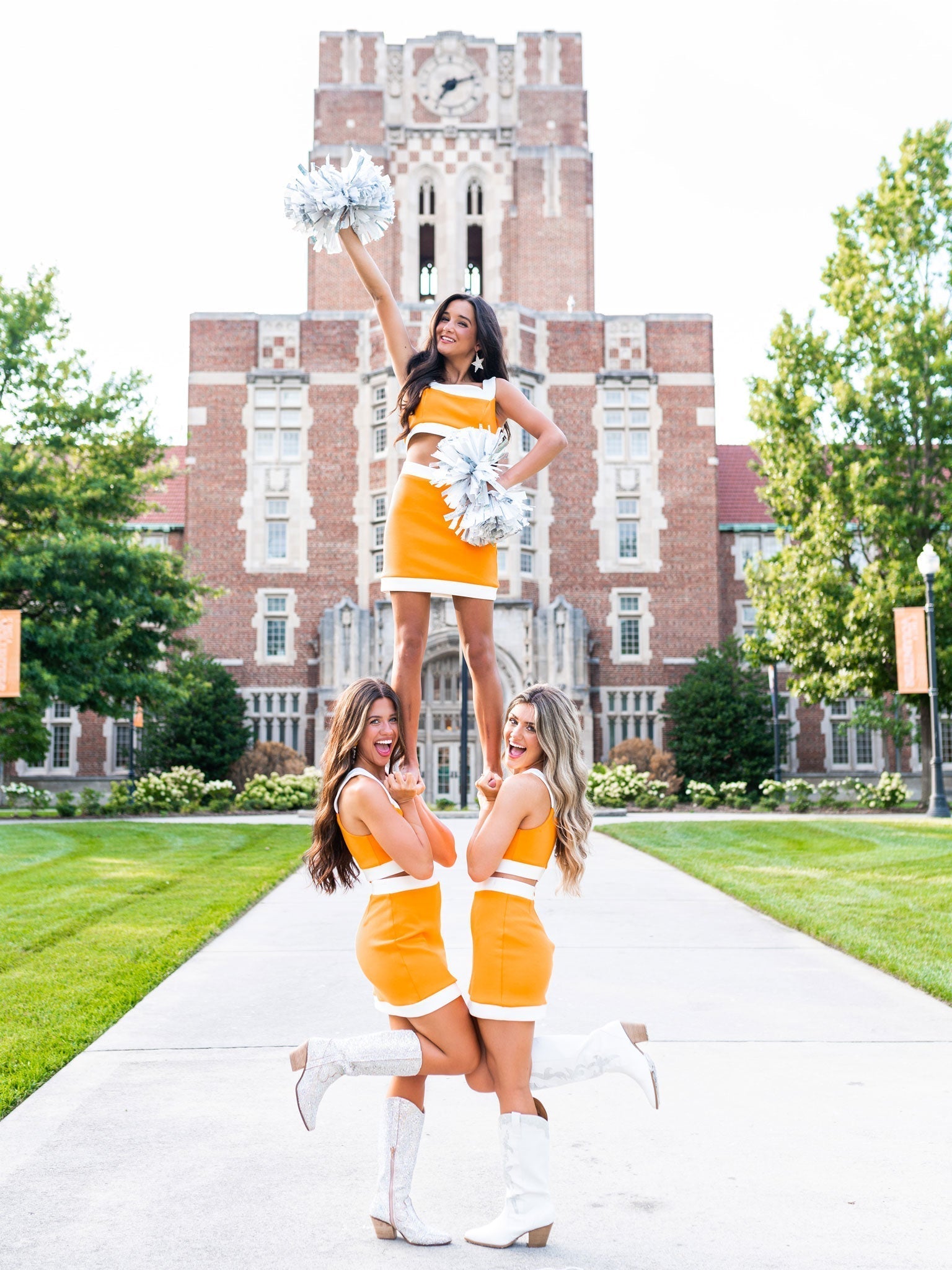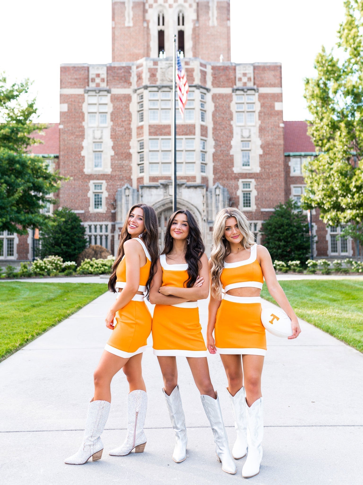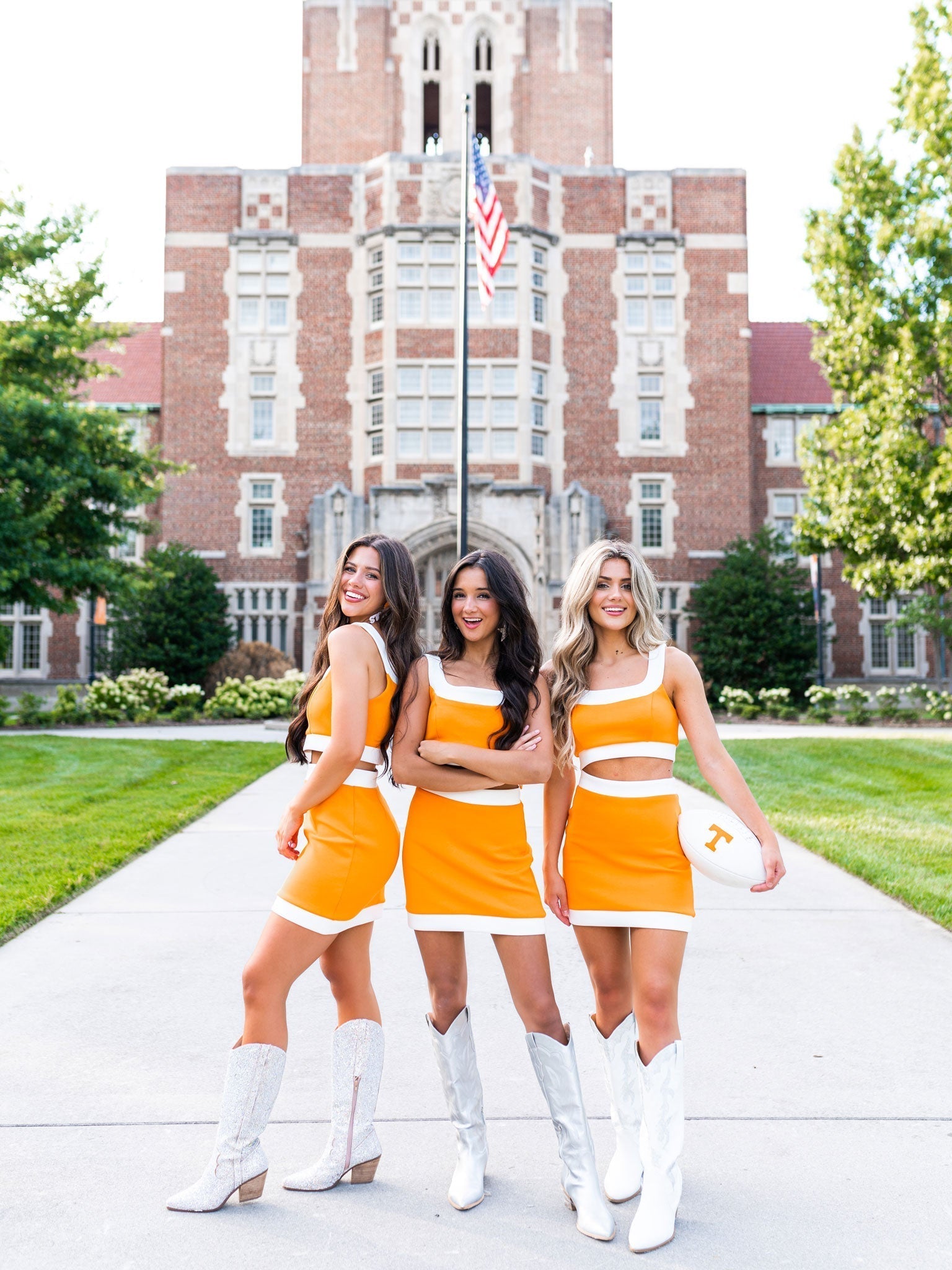 Cheer on your favorite team as they pull out a win in this sweet two-piece set! With its bright orange and white colors, this cropped tank top and high waisted mini skirt combo will have you standing out in the crowd like a “T” - for touchdown, of course! Go team!