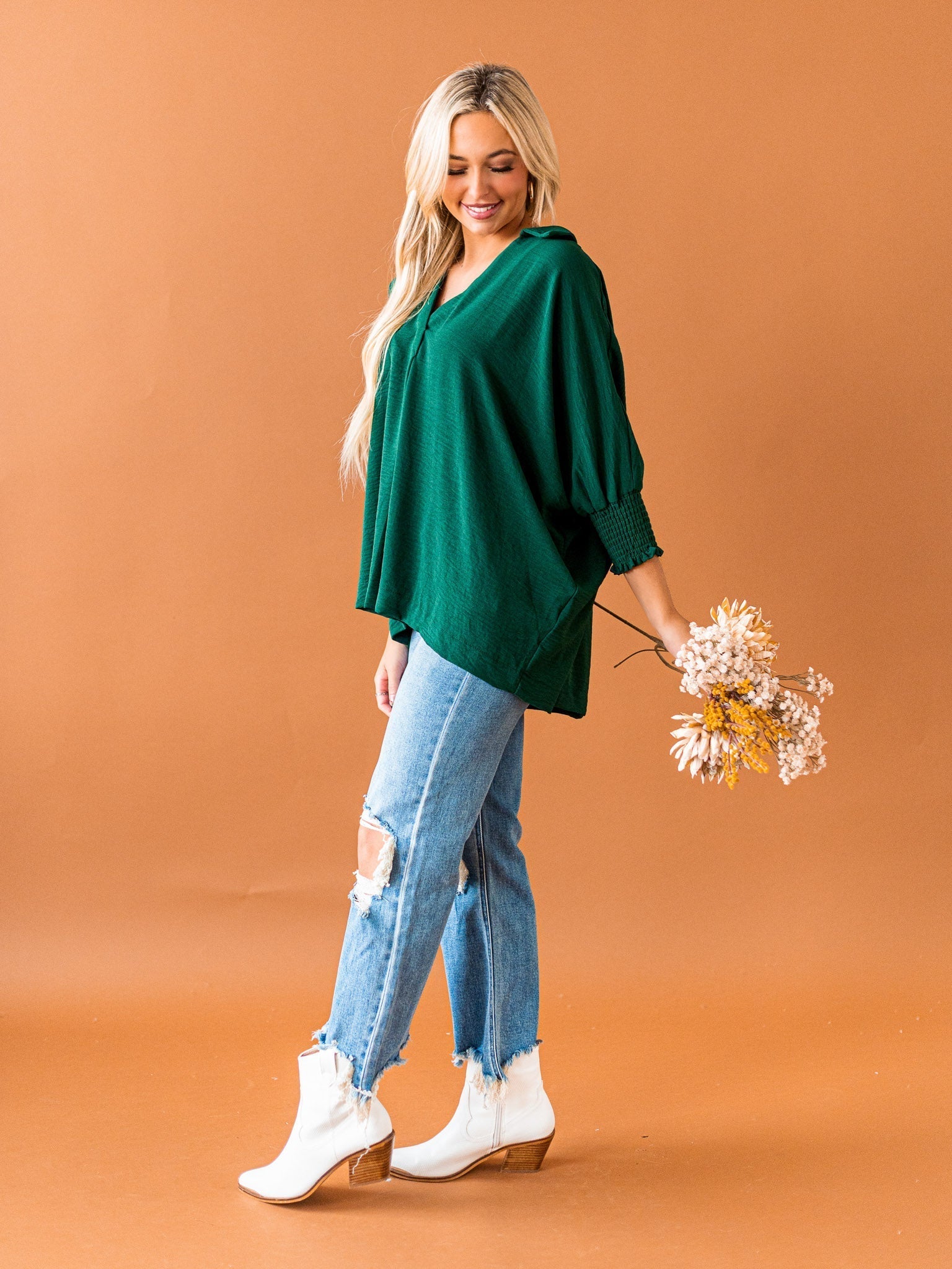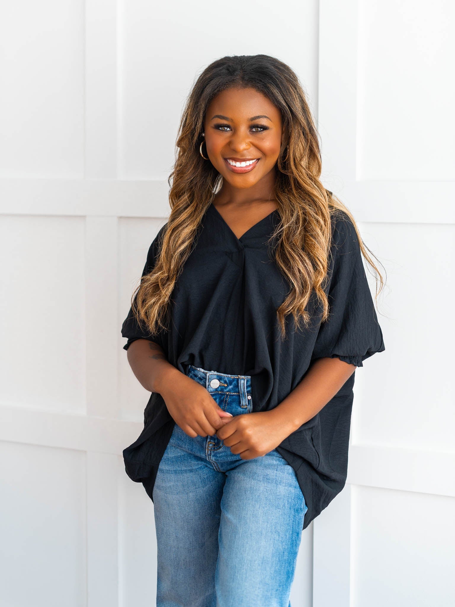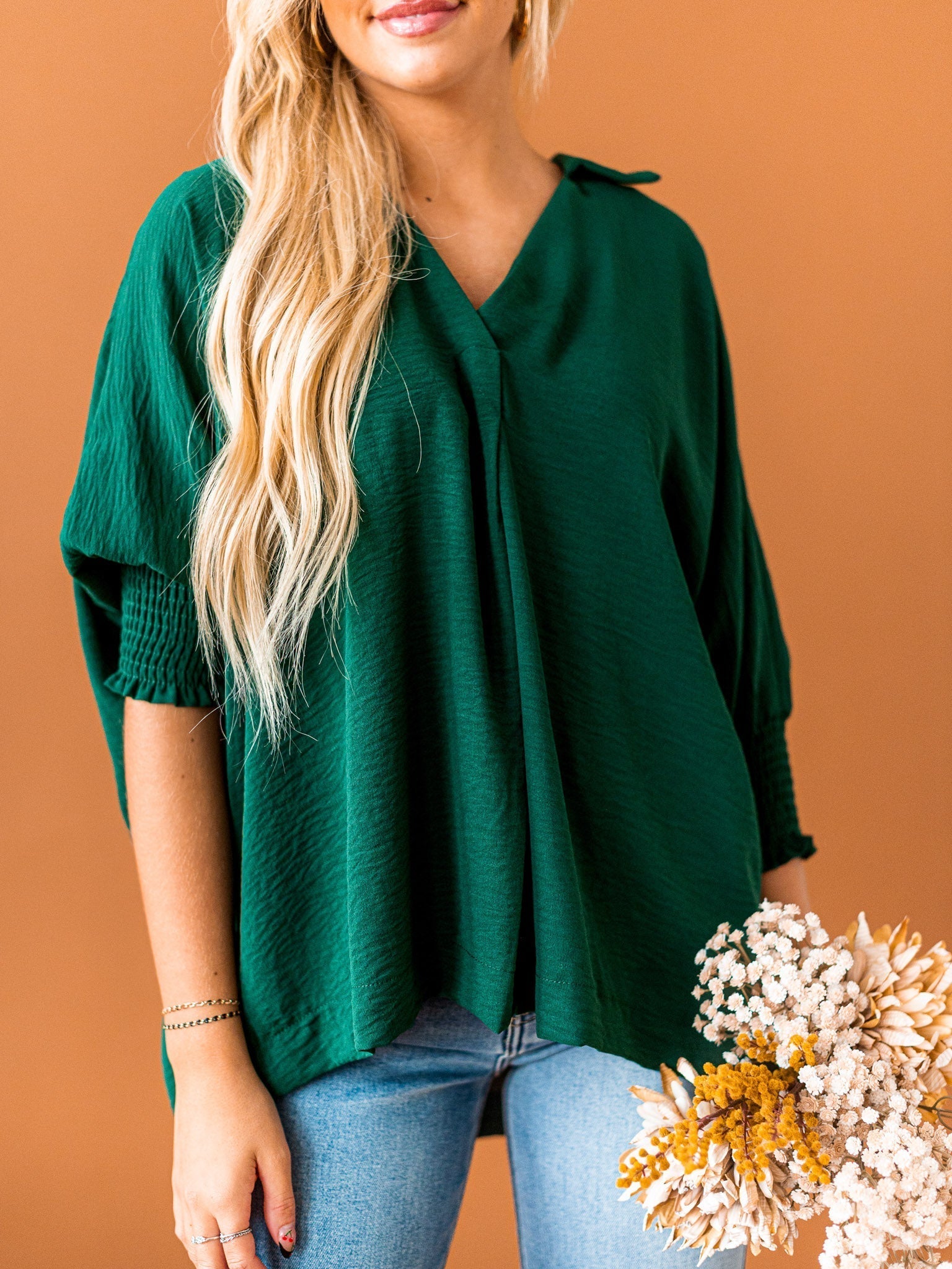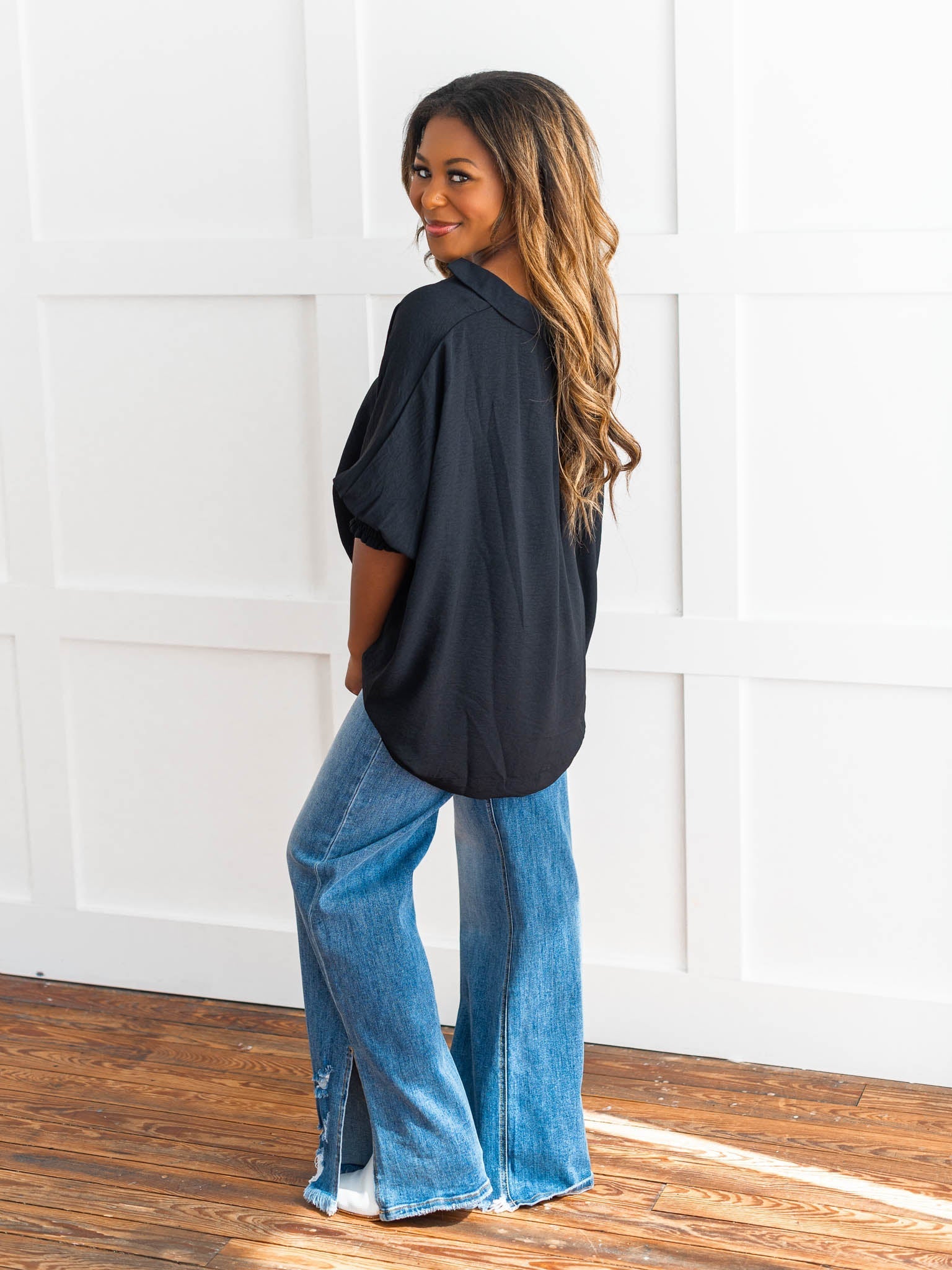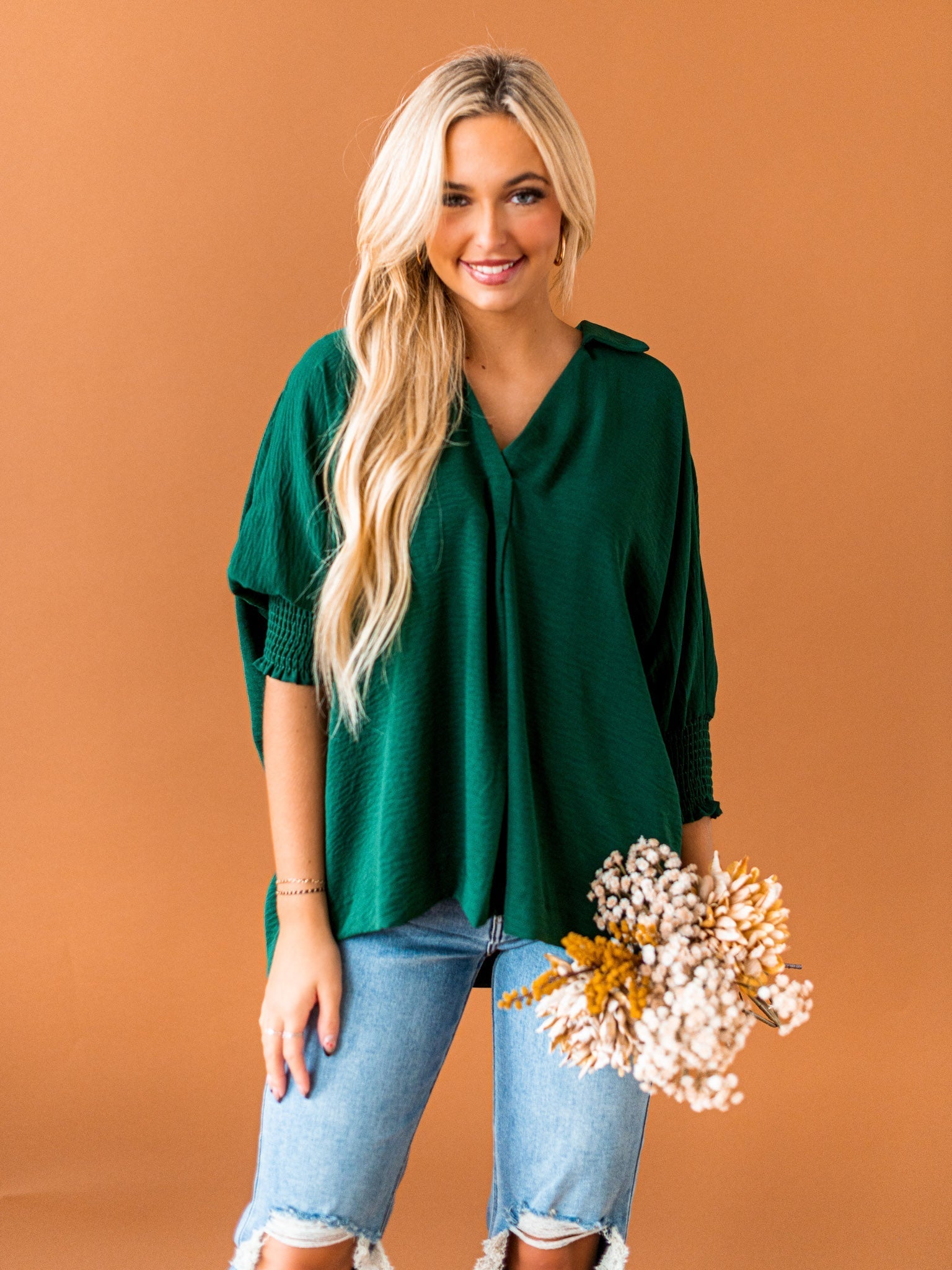 It's time to Put You First with this cute collared top! Get that sophisticated look while feeling comfy and cozy with the split neck, smocked 3/4 length sleeves, and breathable fabric. You'll be looking coll-ected and confident in this top!