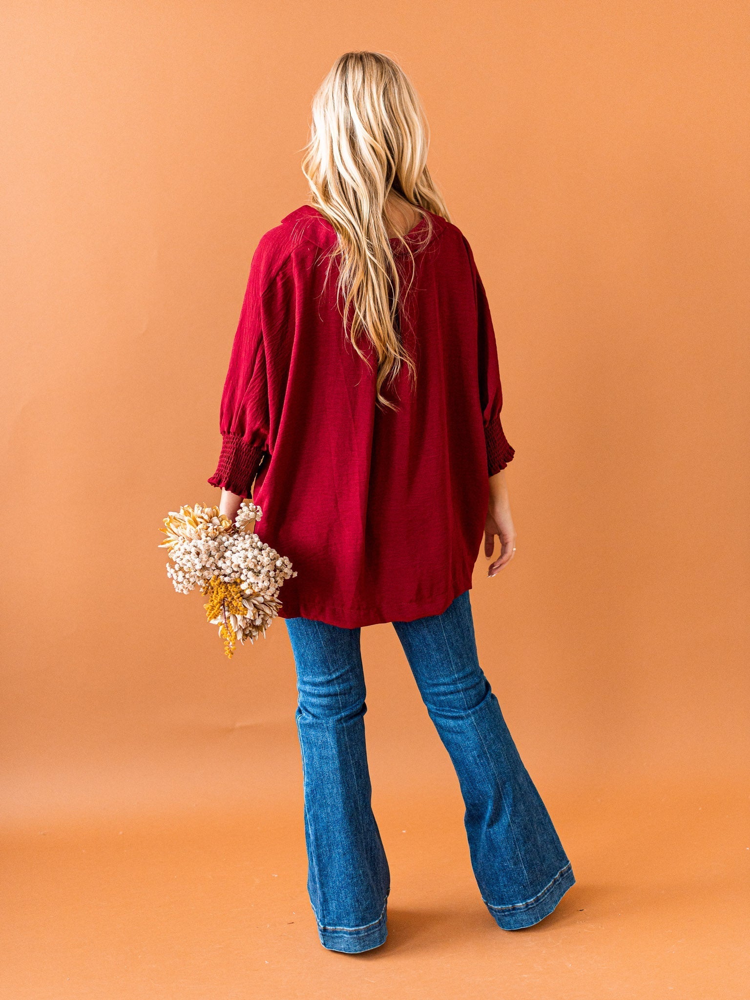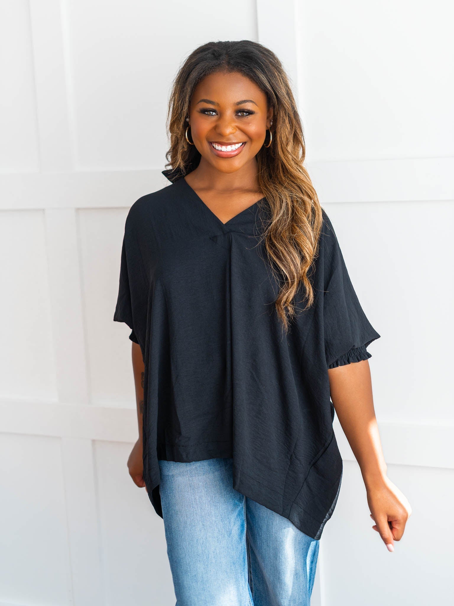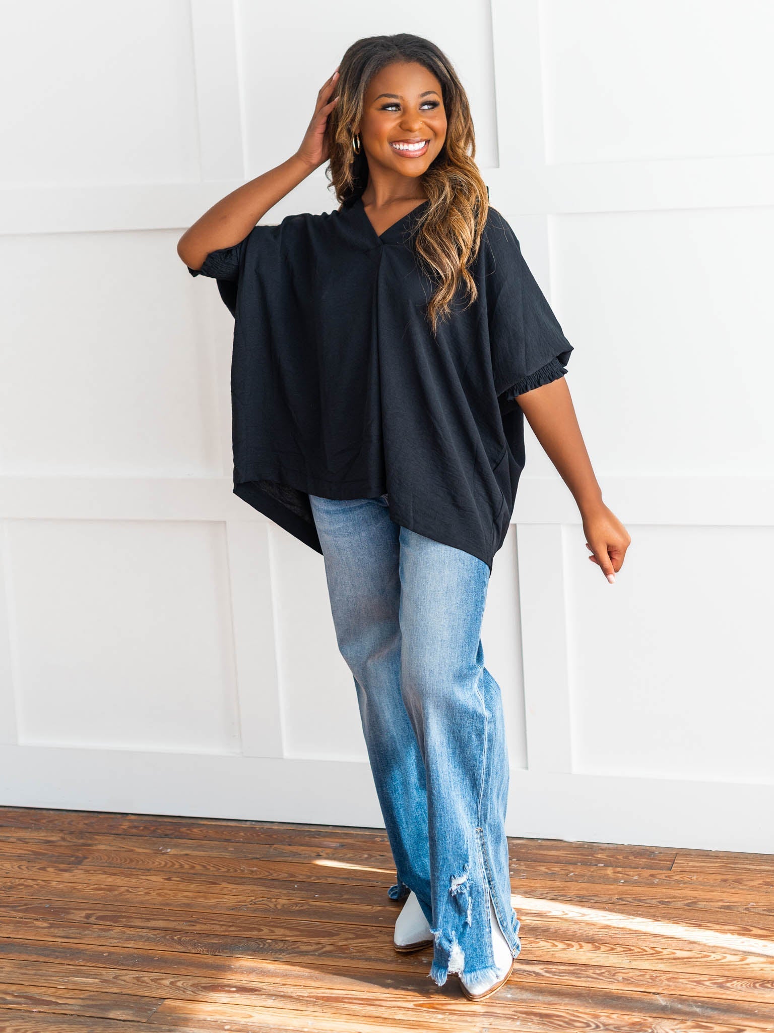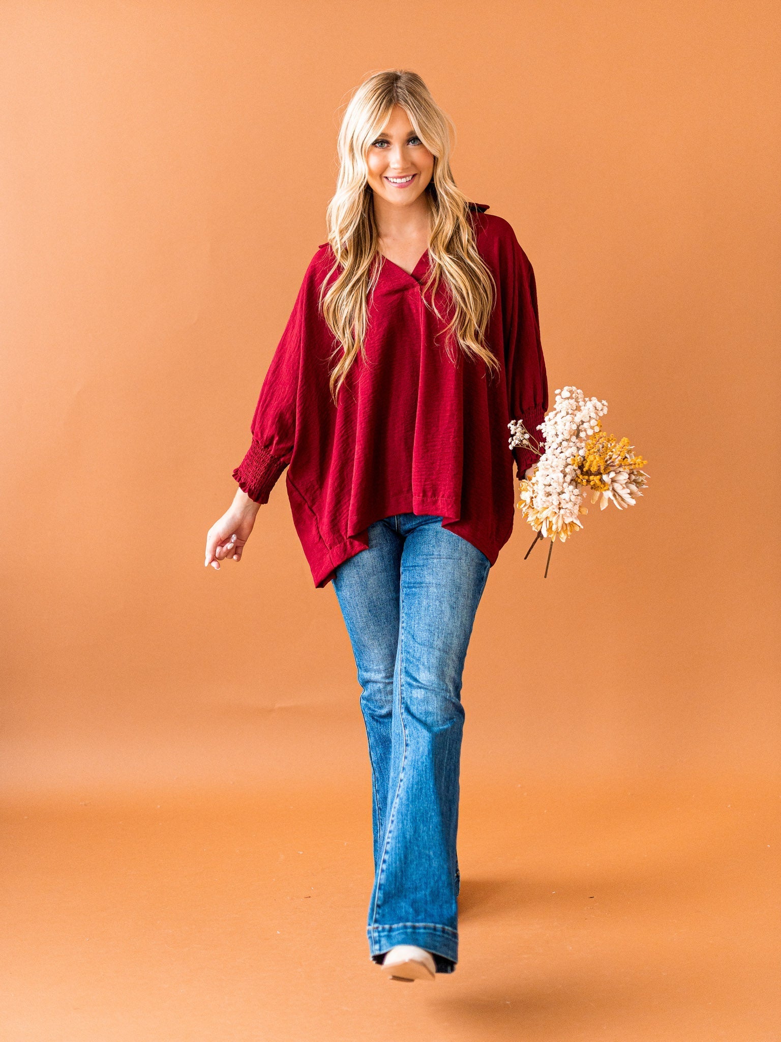 It's time to Put You First with this cute collared top! Get that sophisticated look while feeling comfy and cozy with the split neck, smocked 3/4 length sleeves, and breathable fabric. You'll be looking coll-ected and confident in this top!