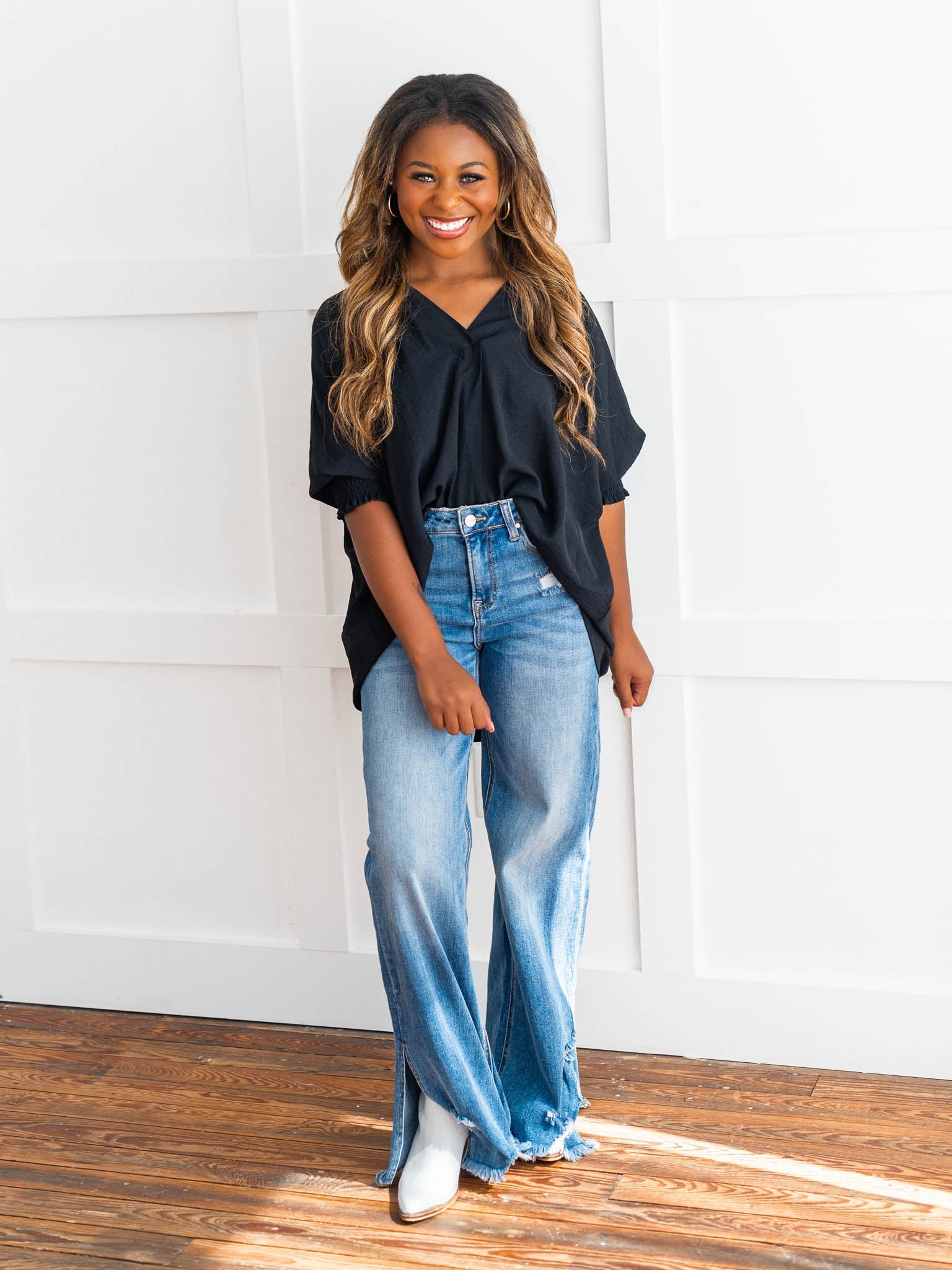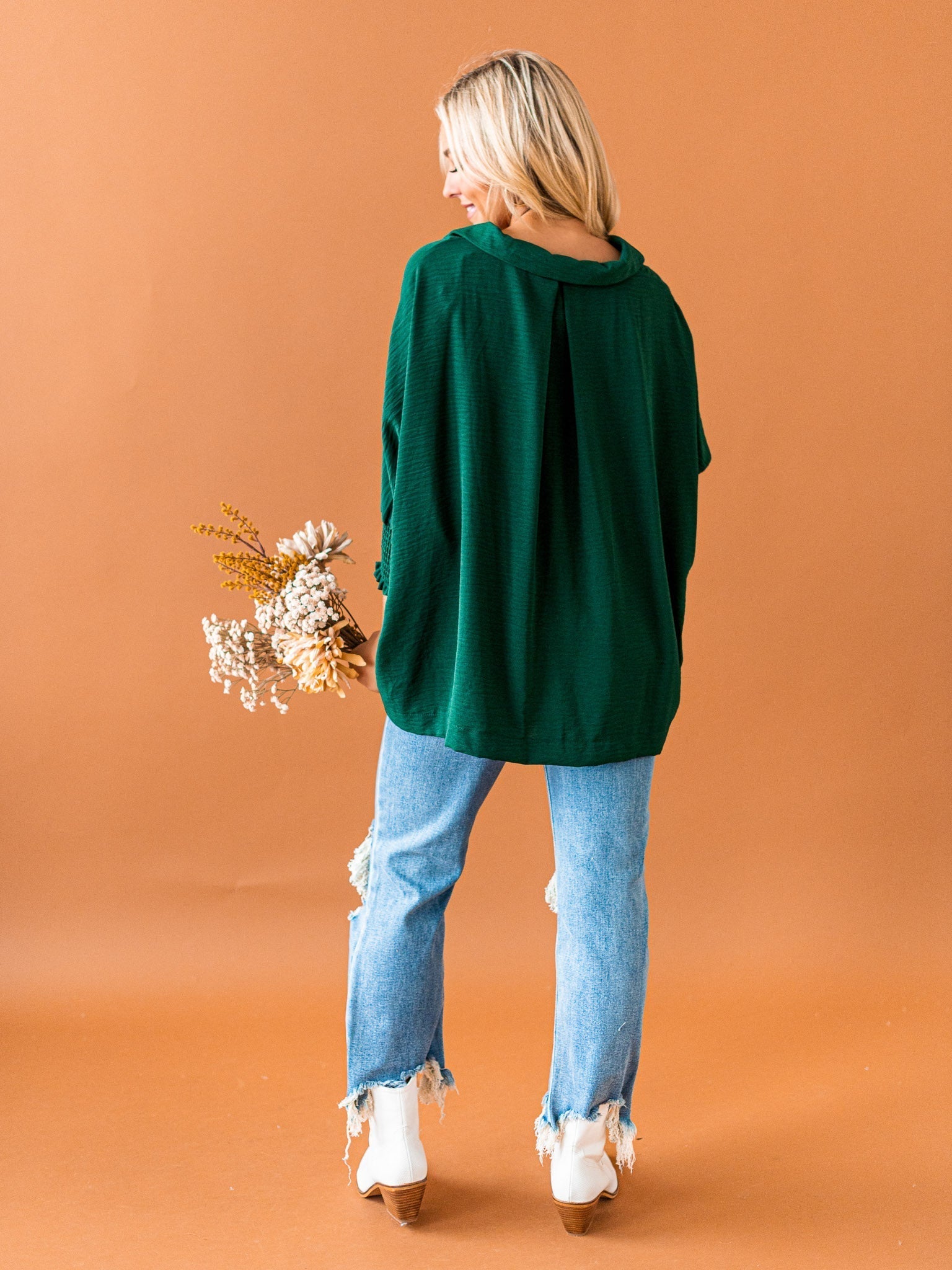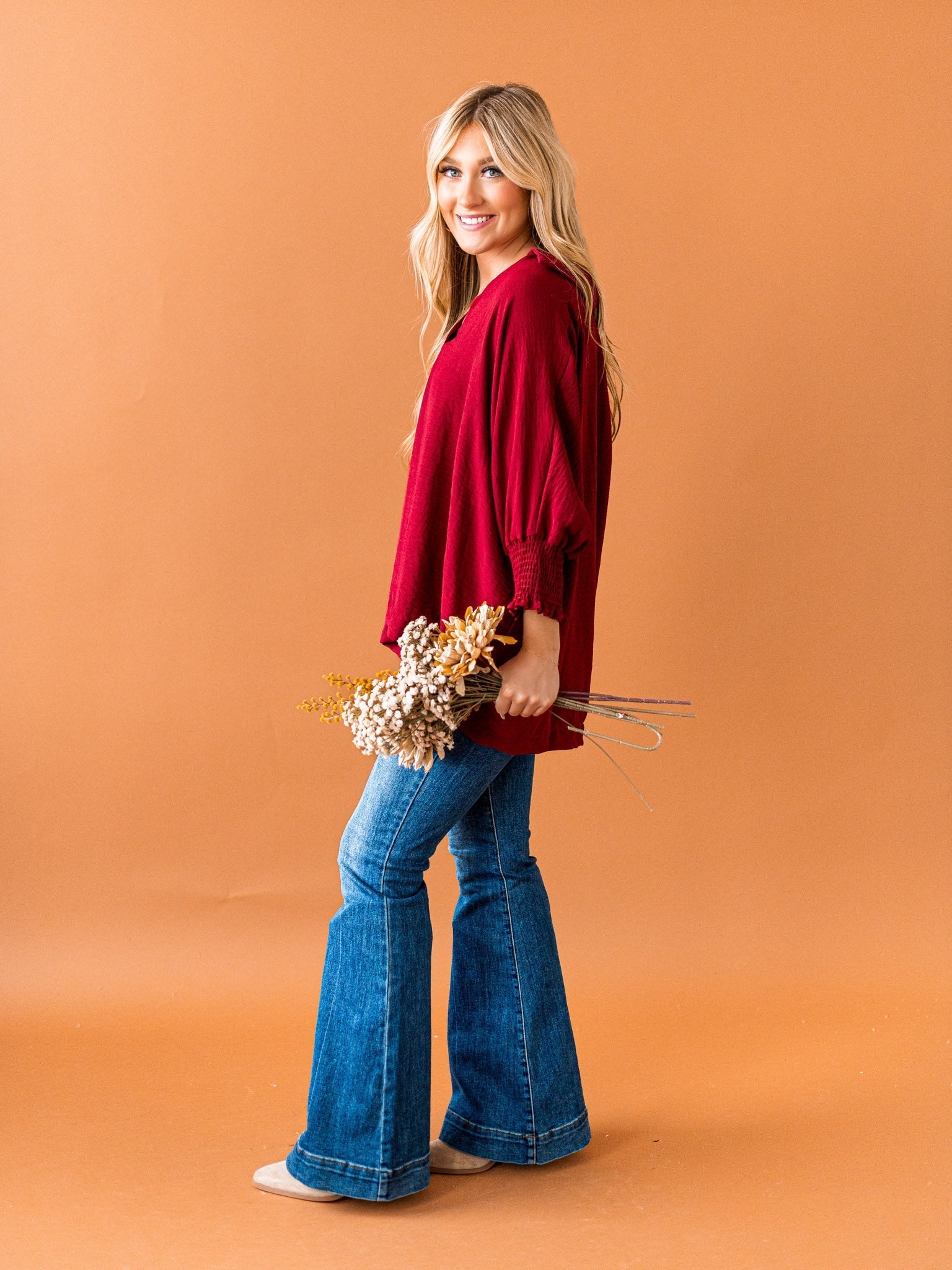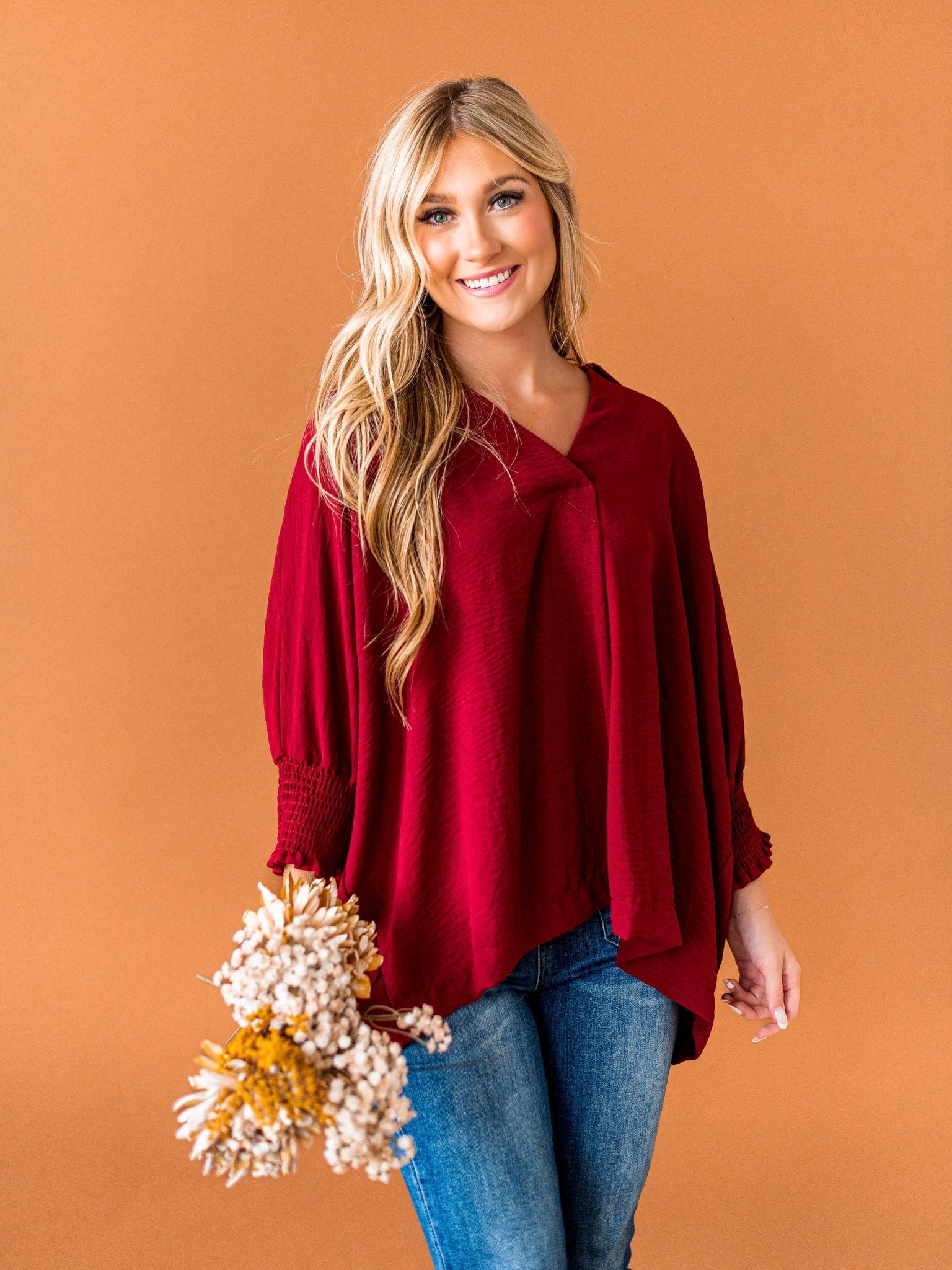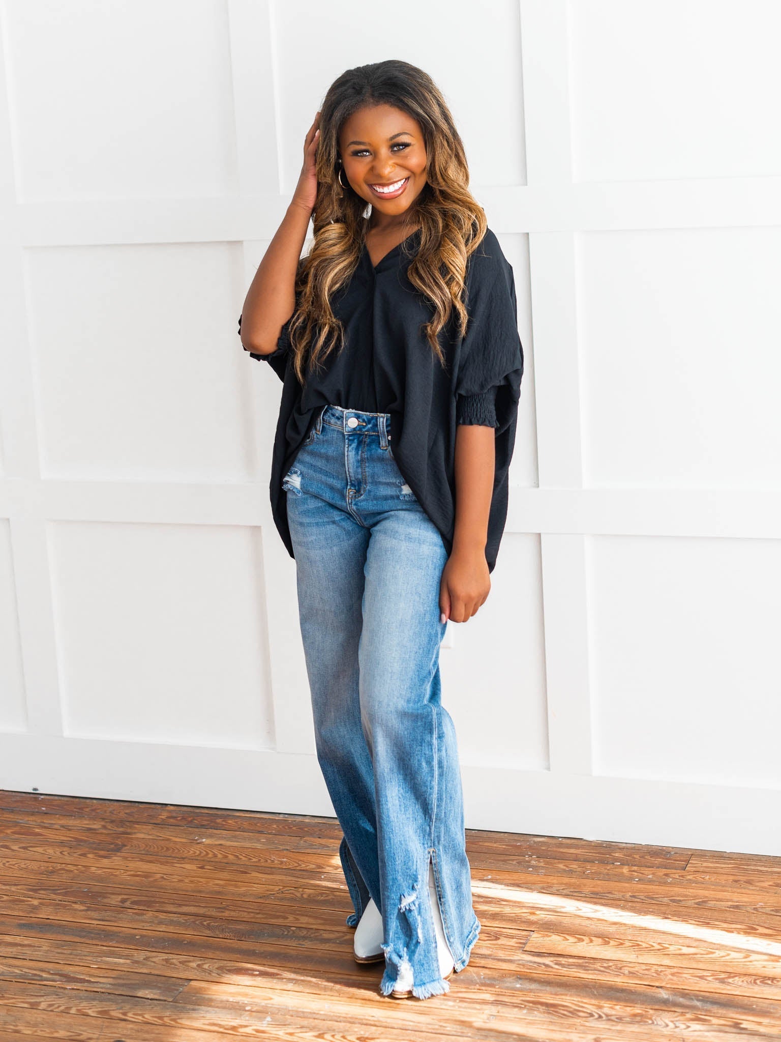 It's time to Put You First with this cute collared top! Get that sophisticated look while feeling comfy and cozy with the split neck, smocked 3/4 length sleeves, and breathable fabric. You'll be looking coll-ected and confident in this top!
