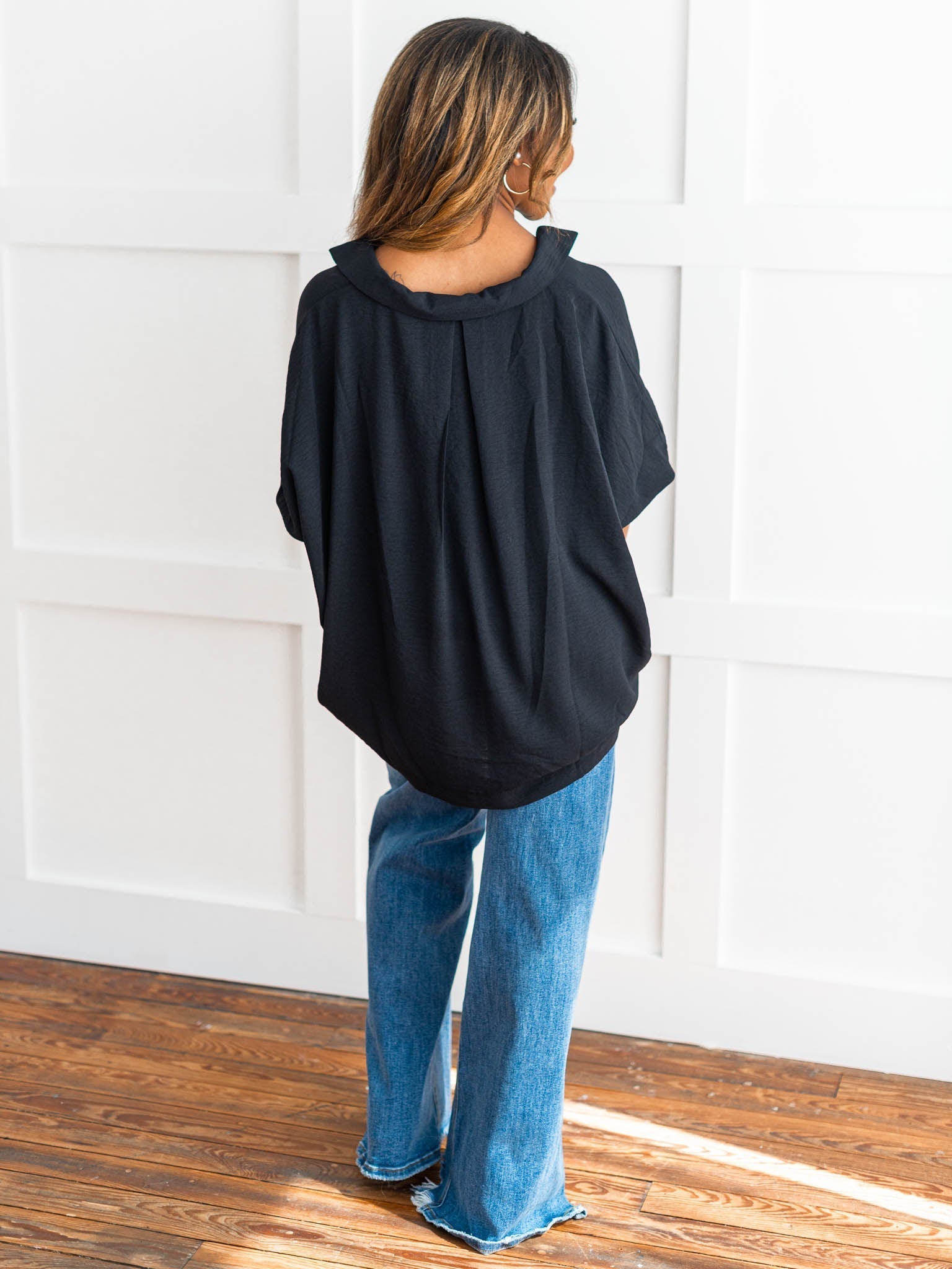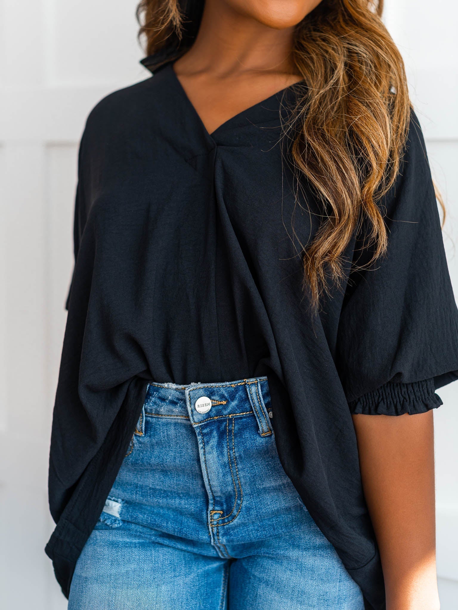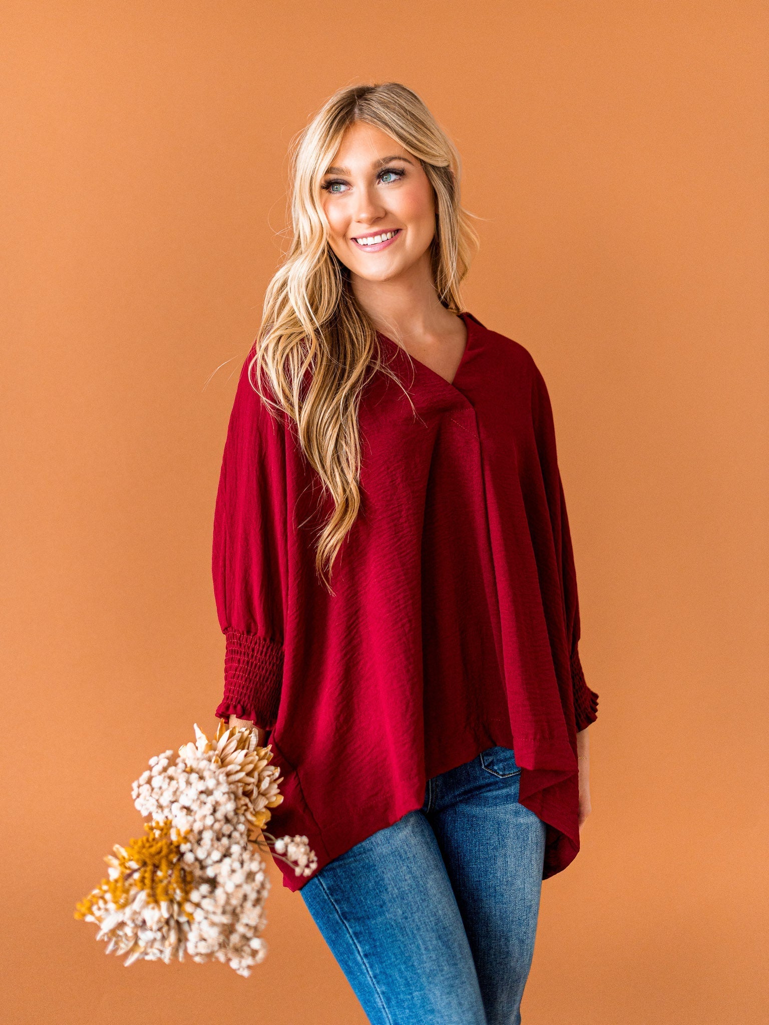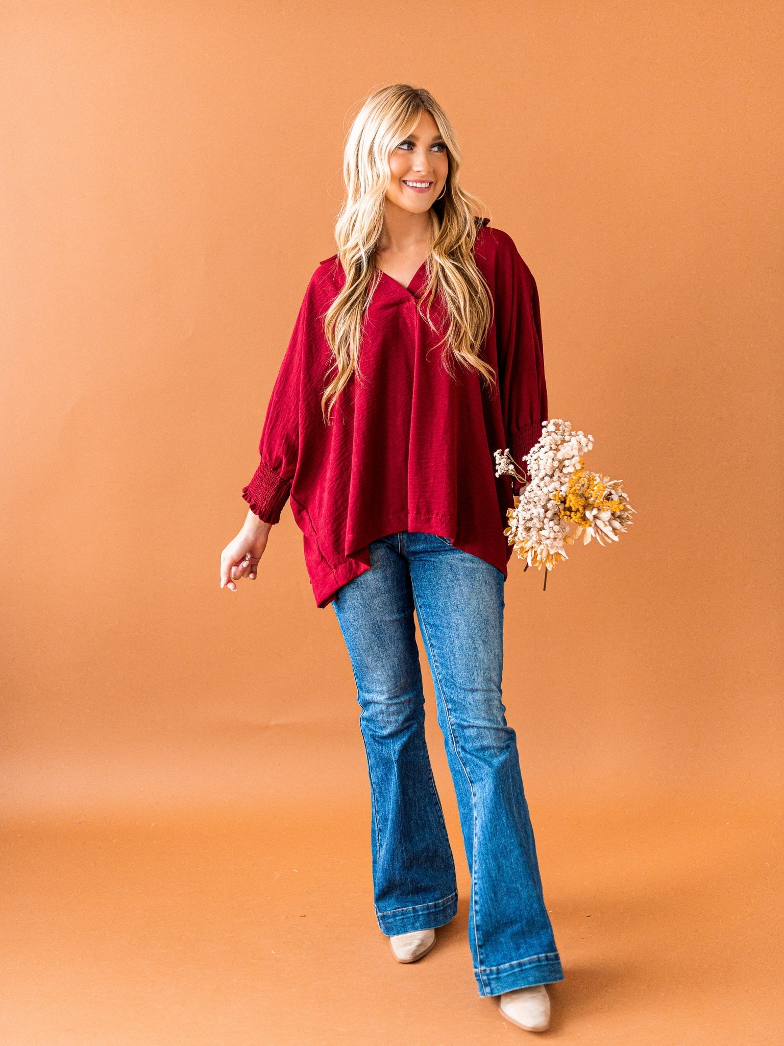 It's time to Put You First with this cute collared top! Get that sophisticated look while feeling comfy and cozy with the split neck, smocked 3/4 length sleeves, and breathable fabric. You'll be looking coll-ected and confident in this top!