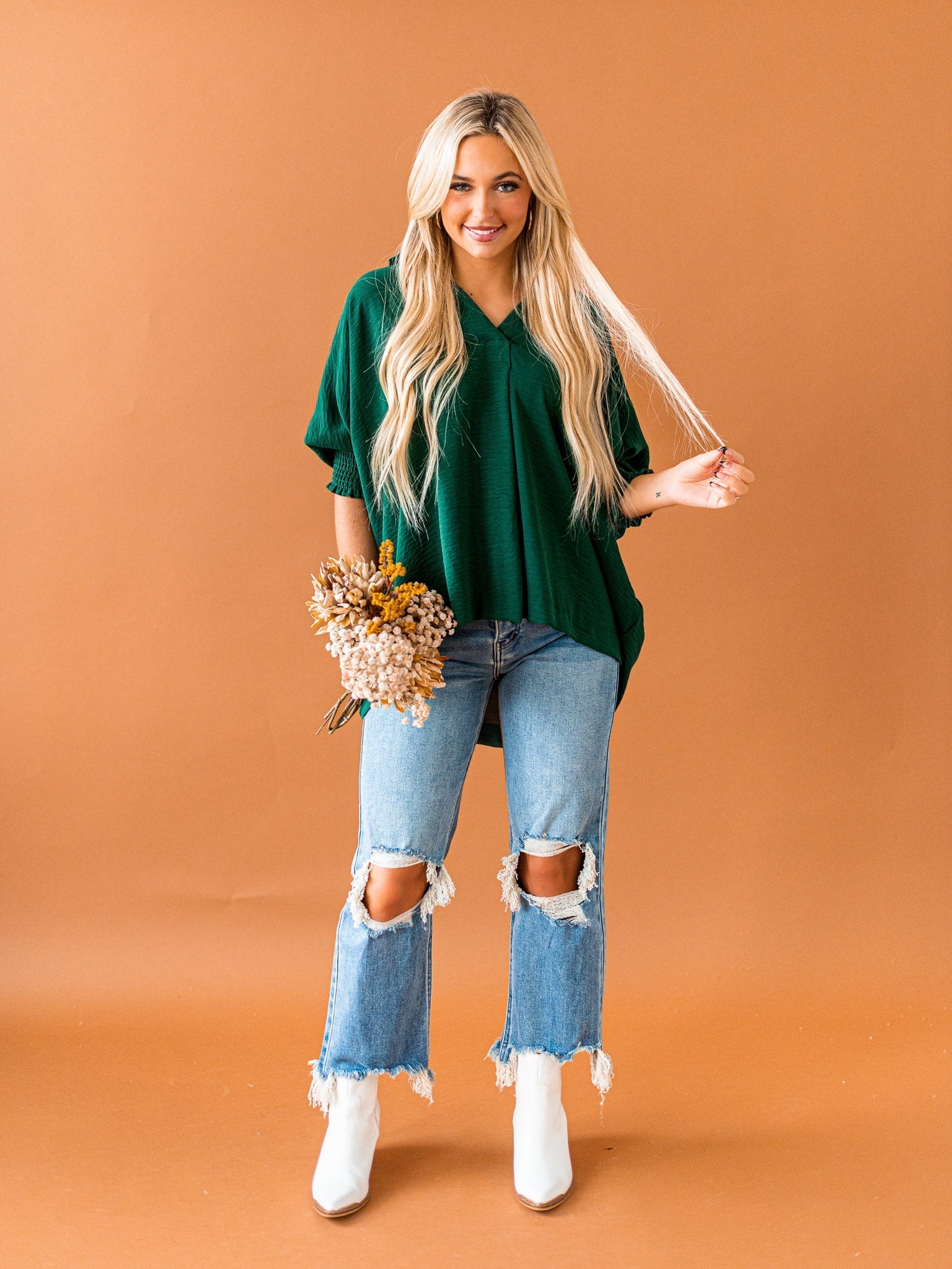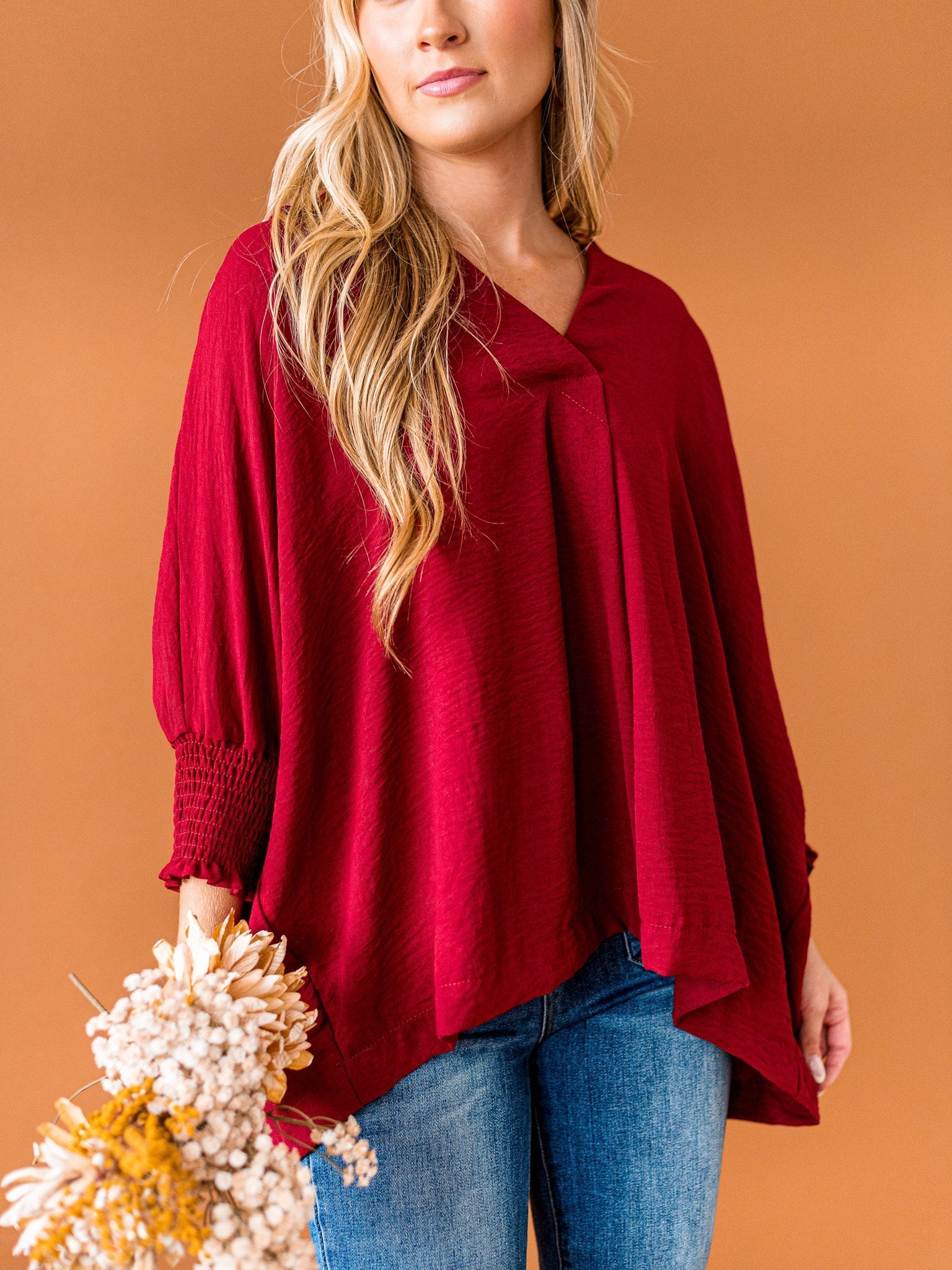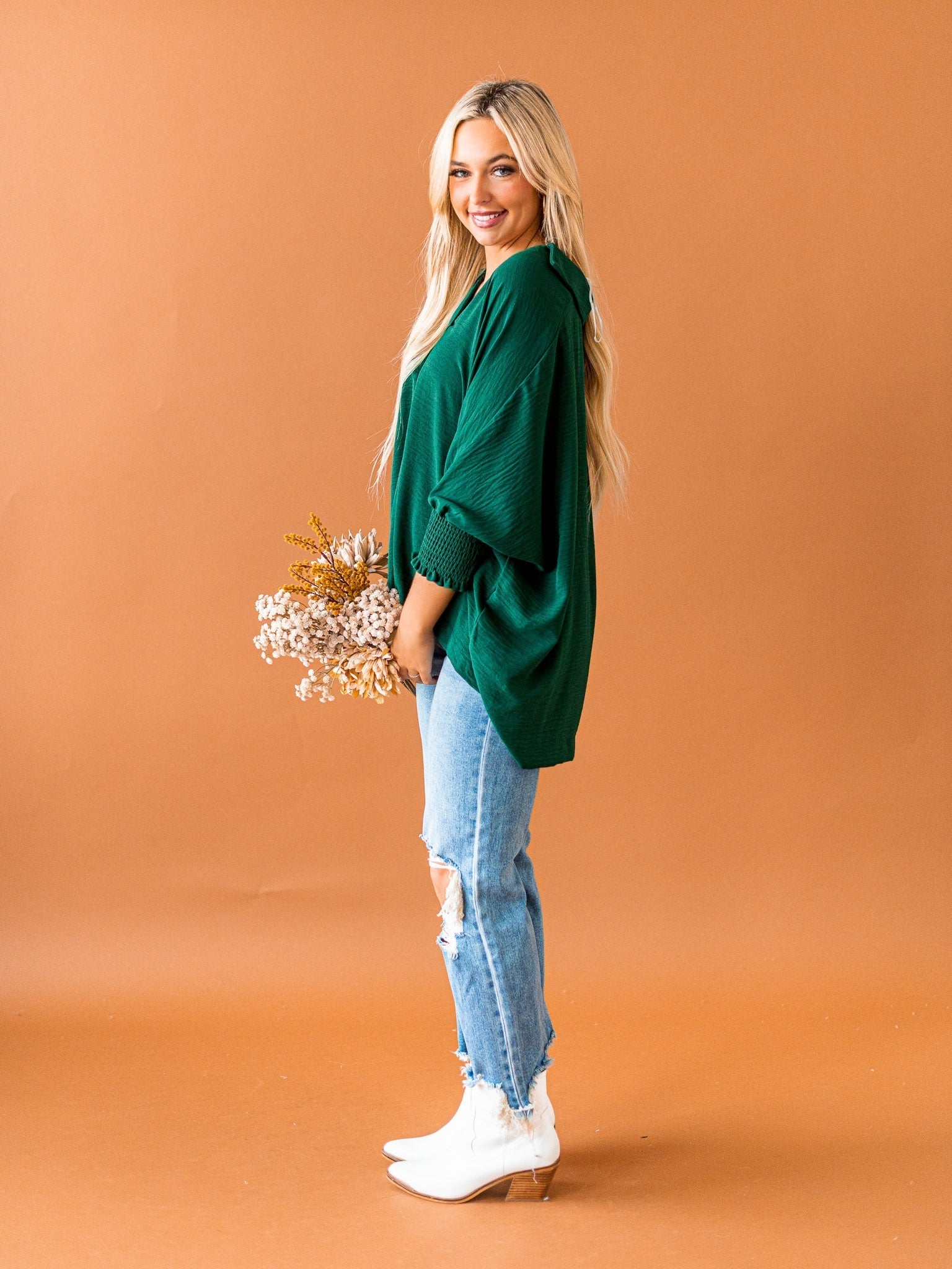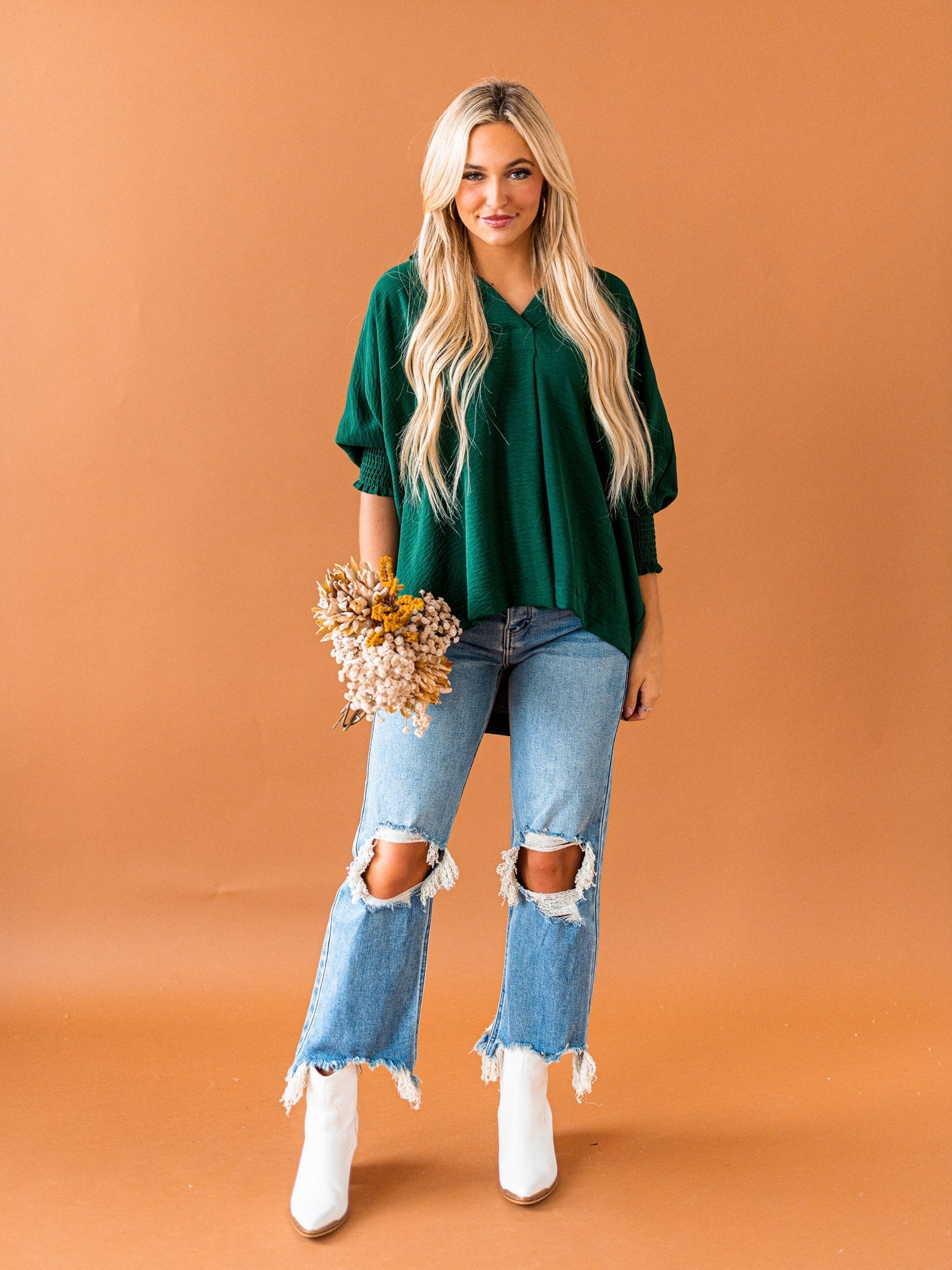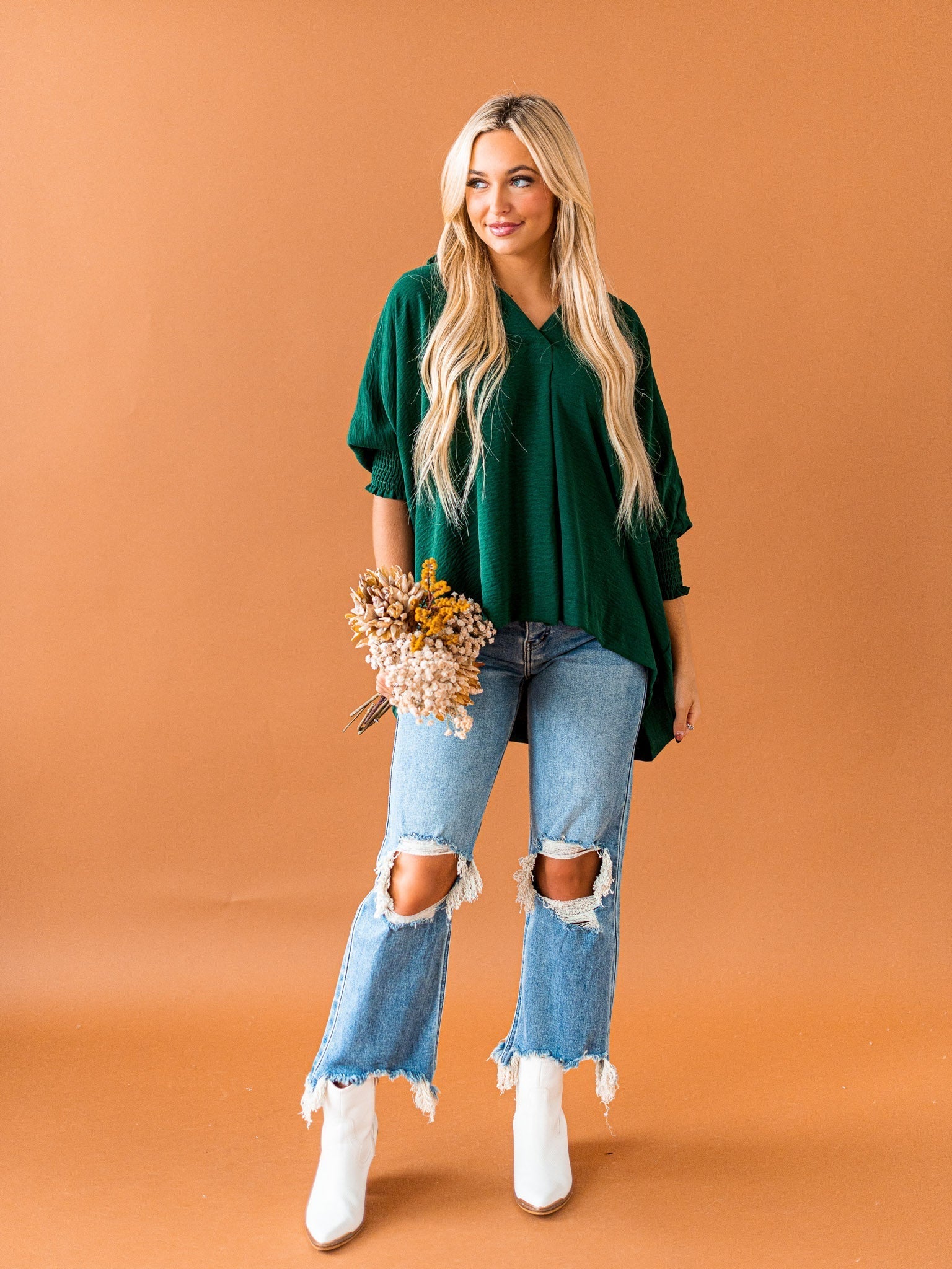 It's time to Put You First with this cute collared top! Get that sophisticated look while feeling comfy and cozy with the split neck, smocked 3/4 length sleeves, and breathable fabric. You'll be looking coll-ected and confident in this top!