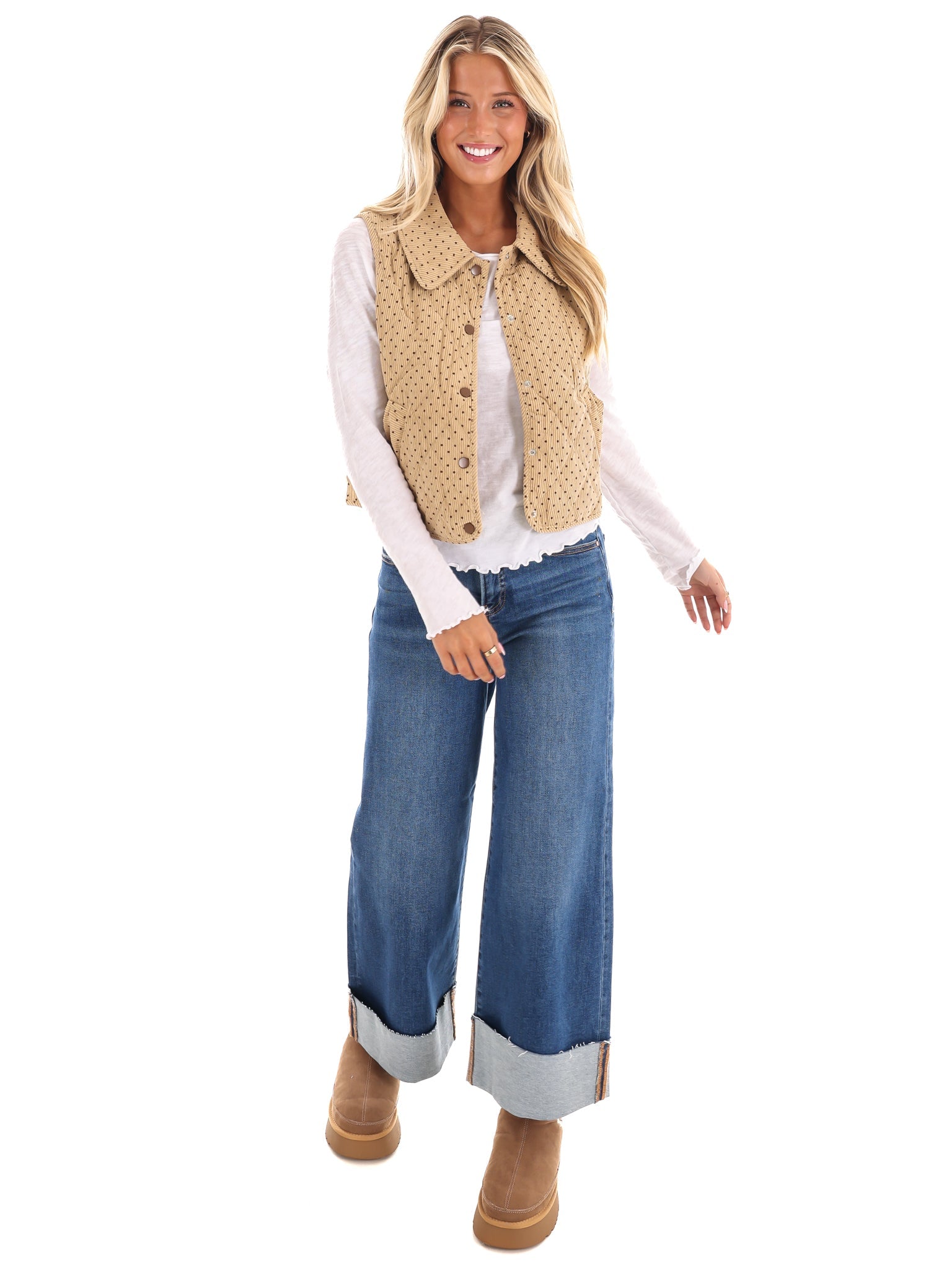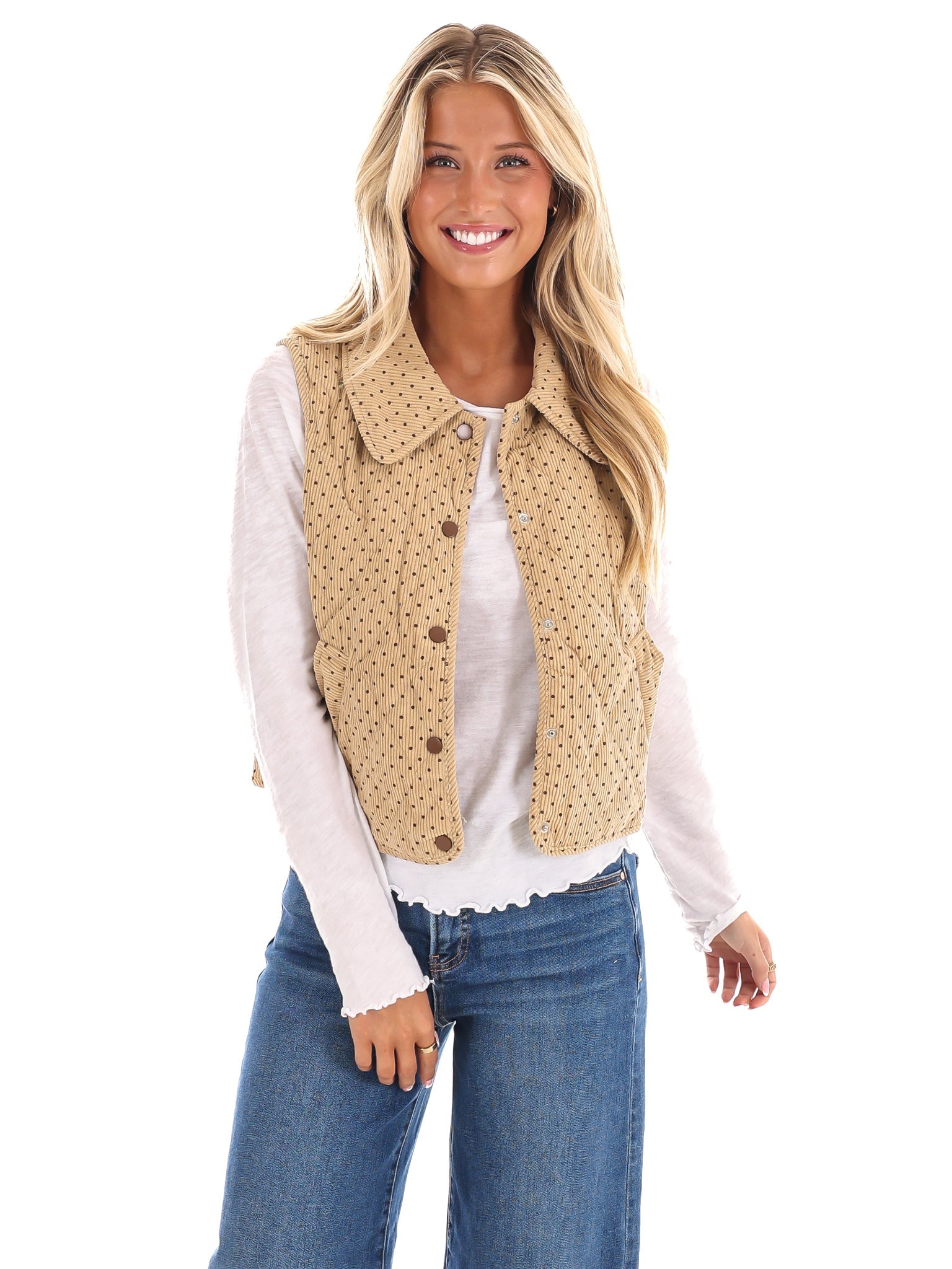 Add some charm and fun to your wardrobe with our Quilted Charm Corduroy Vest. This playful piece features a polka dot quilted diamond design, perfect for adding a pop of personality to any outfit. Made with soft and durable corduroy, this vest will keep you cozy and stylish all day long.