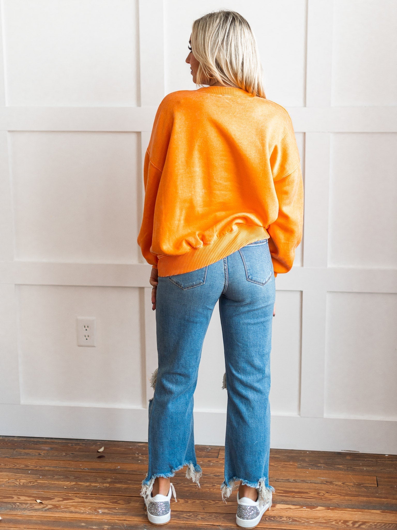 Show off your sporty style with this Rhinestone Helmet Sweatshirt! This crew neck top features a fun football helmet embellished with glimmering rhinestones, giving you a unique look that stands out from the crowd. Rock your look with a banded hem and a bold orange hue that's sure to score you major style points!